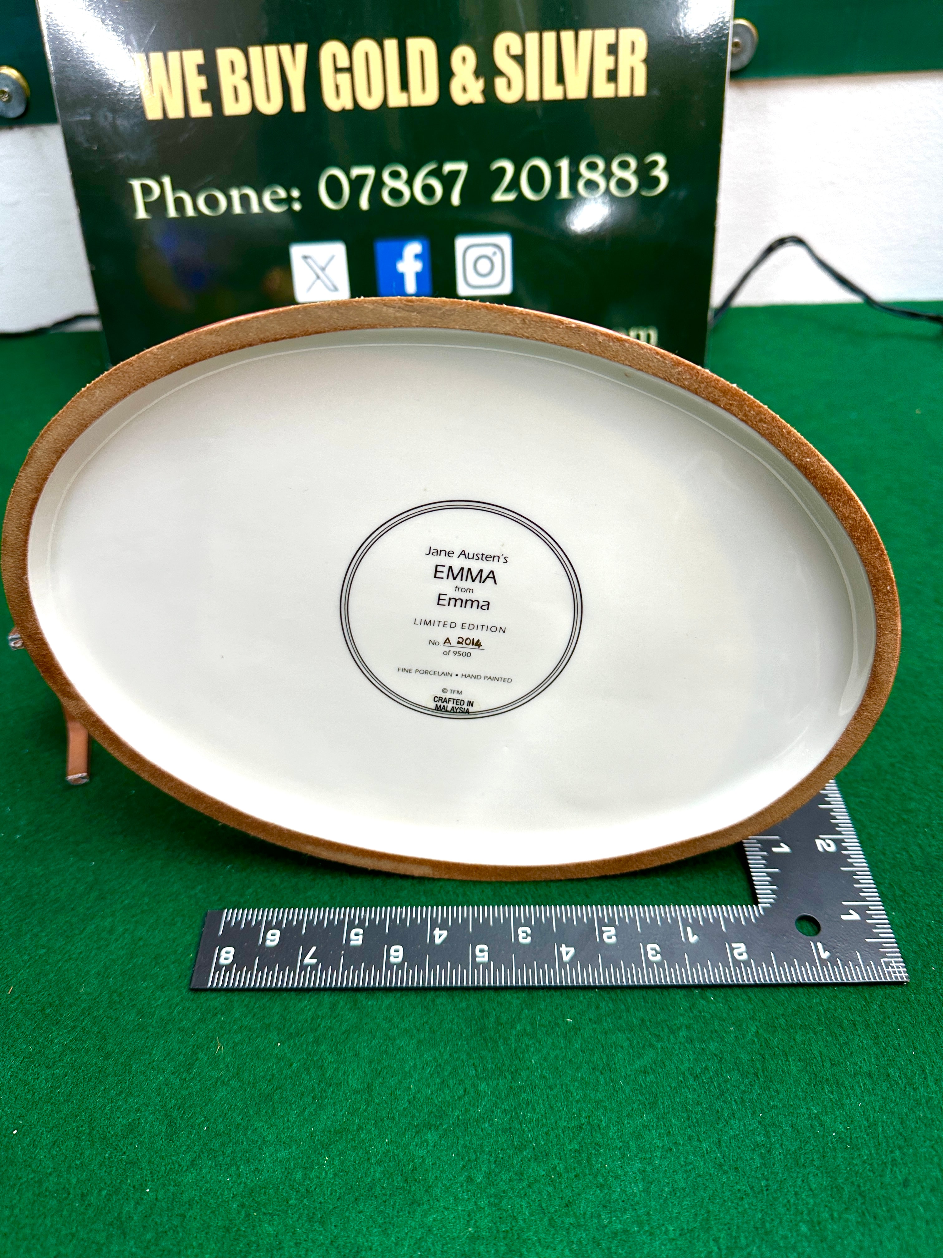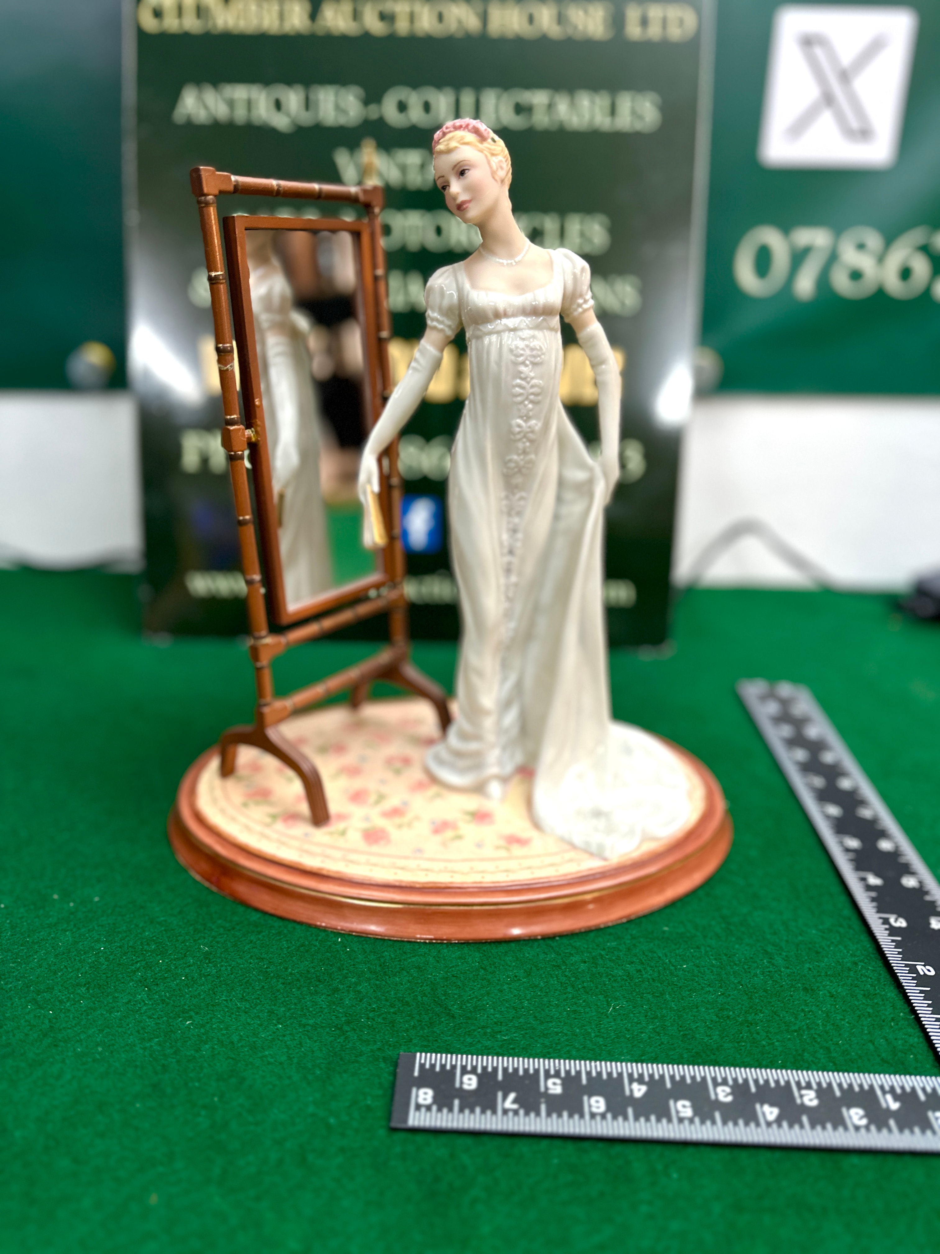 A Franklin Mint ‘Jane Austen’s Emma’ porcelain figurine, depicting the character Emma from Jane Austen’s novel. The female figure is presented in a Regency or Empire style off-white, high-waisted gown, long gloves, and an elaborate updo hairstyle. She stands beside a simulated wooden full-length mirror, all mounted on an oval base with a painted rug detail. The base is marked “Jane Austen’s EMMA,” “LIMITED EDITION No. A 2016,” “FINE PORCELAIN • HAND PAINTED,” and “CRAFTED IN SRI LANKA.”