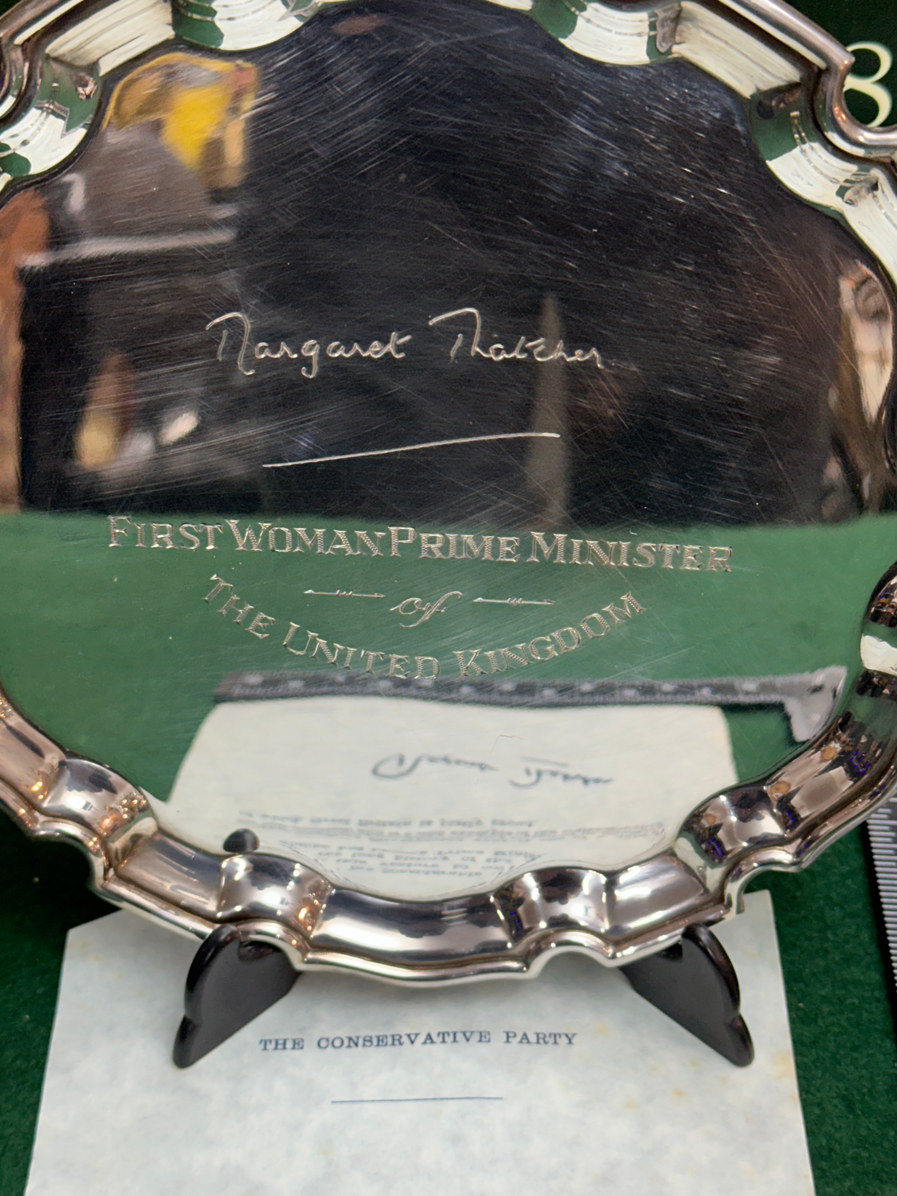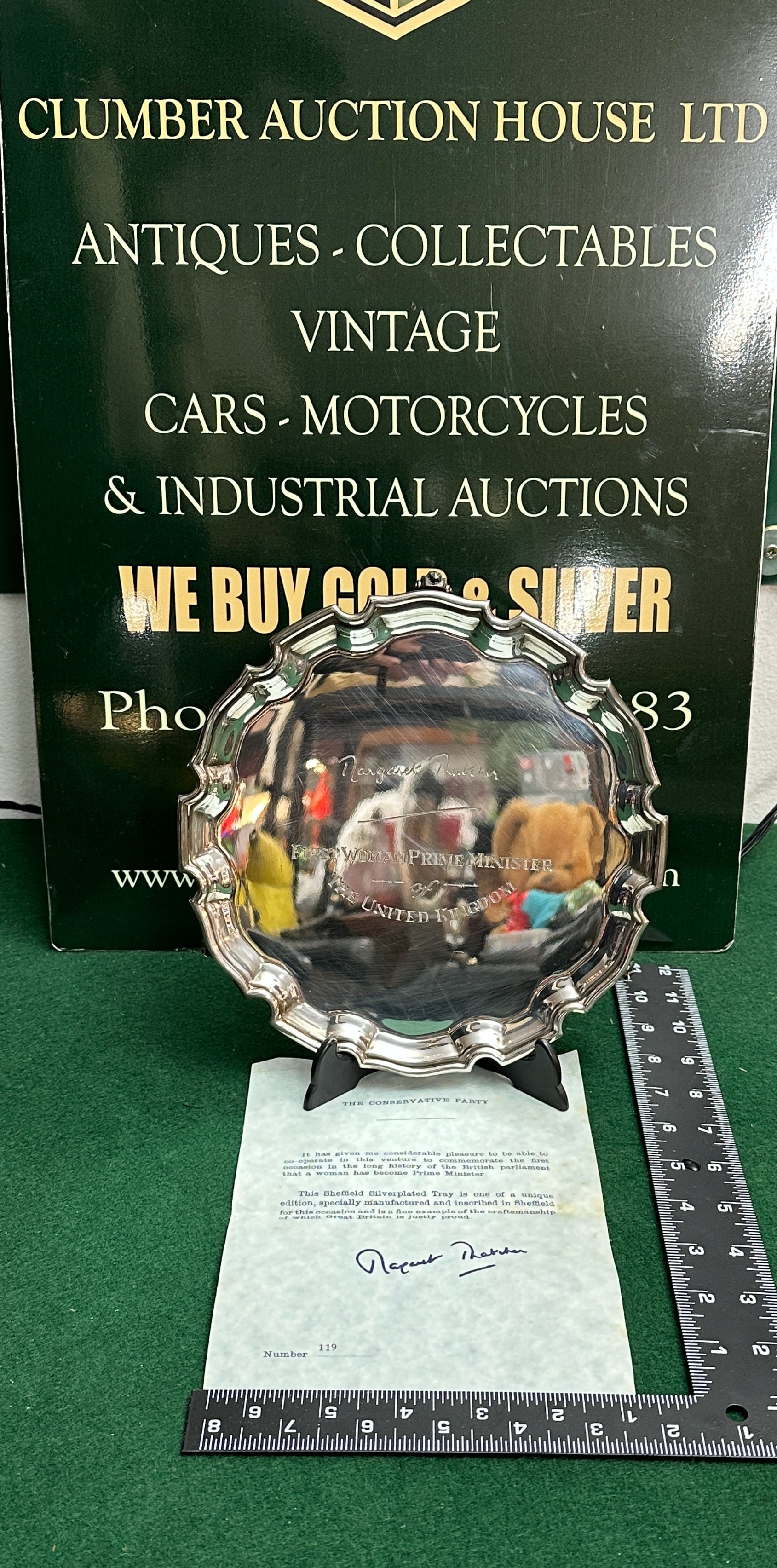 A Sheffield Silverplated ‘Chippendale’ commemorative tray, featuring a round form with a scalloped, pie-crust style rim. The reflective surface is engraved with a facsimile signature “Margaret Thatcher” positioned above the text “FIRST WOMAN PRIME MINISTER OF THE UNITED KINGDOM.” Issued by THE CONSERVATIVE PARTY, this tray is number 119 of a unique edition. An accompanying document, partially visible, bears a signature appearing to be “Robert Fenton.”