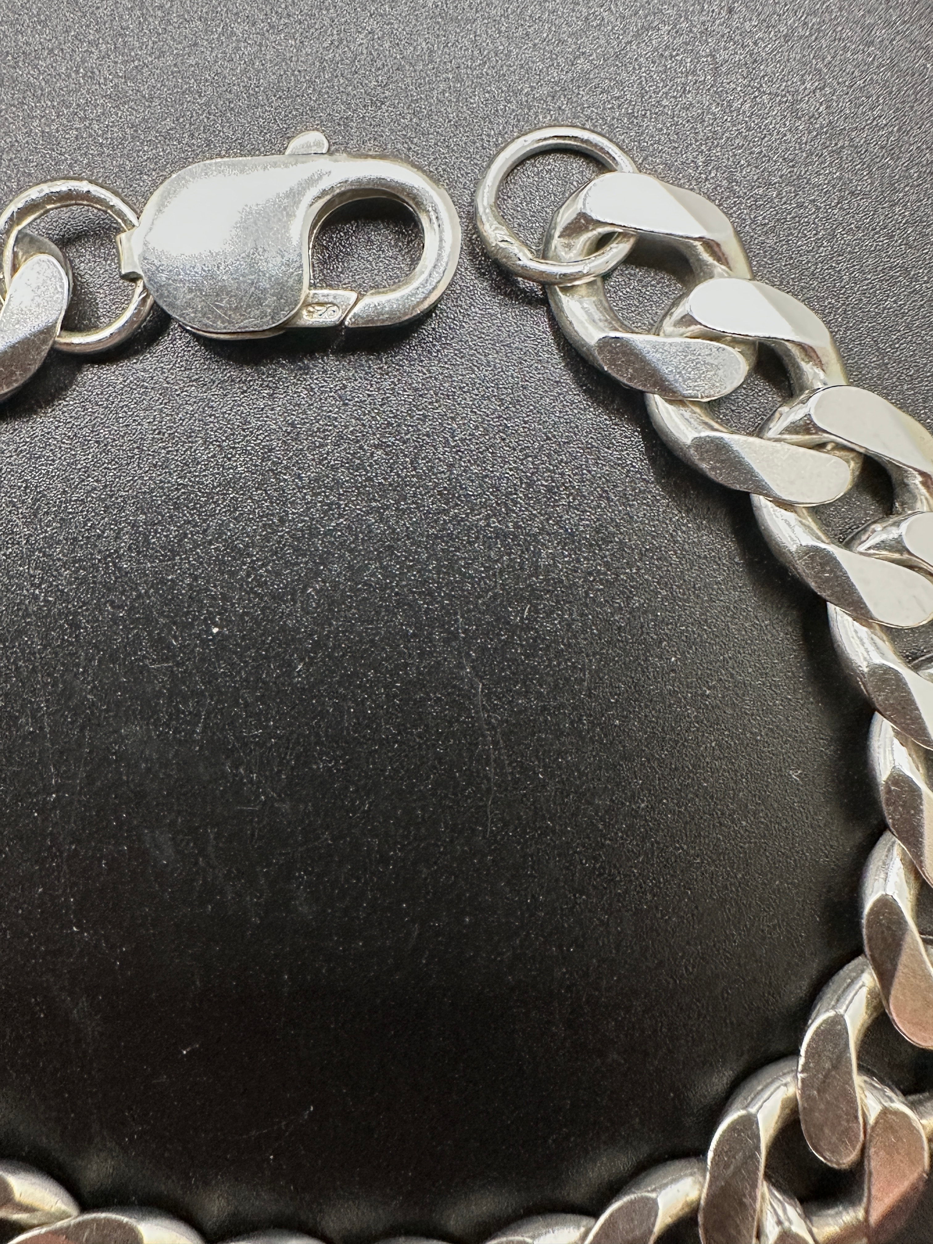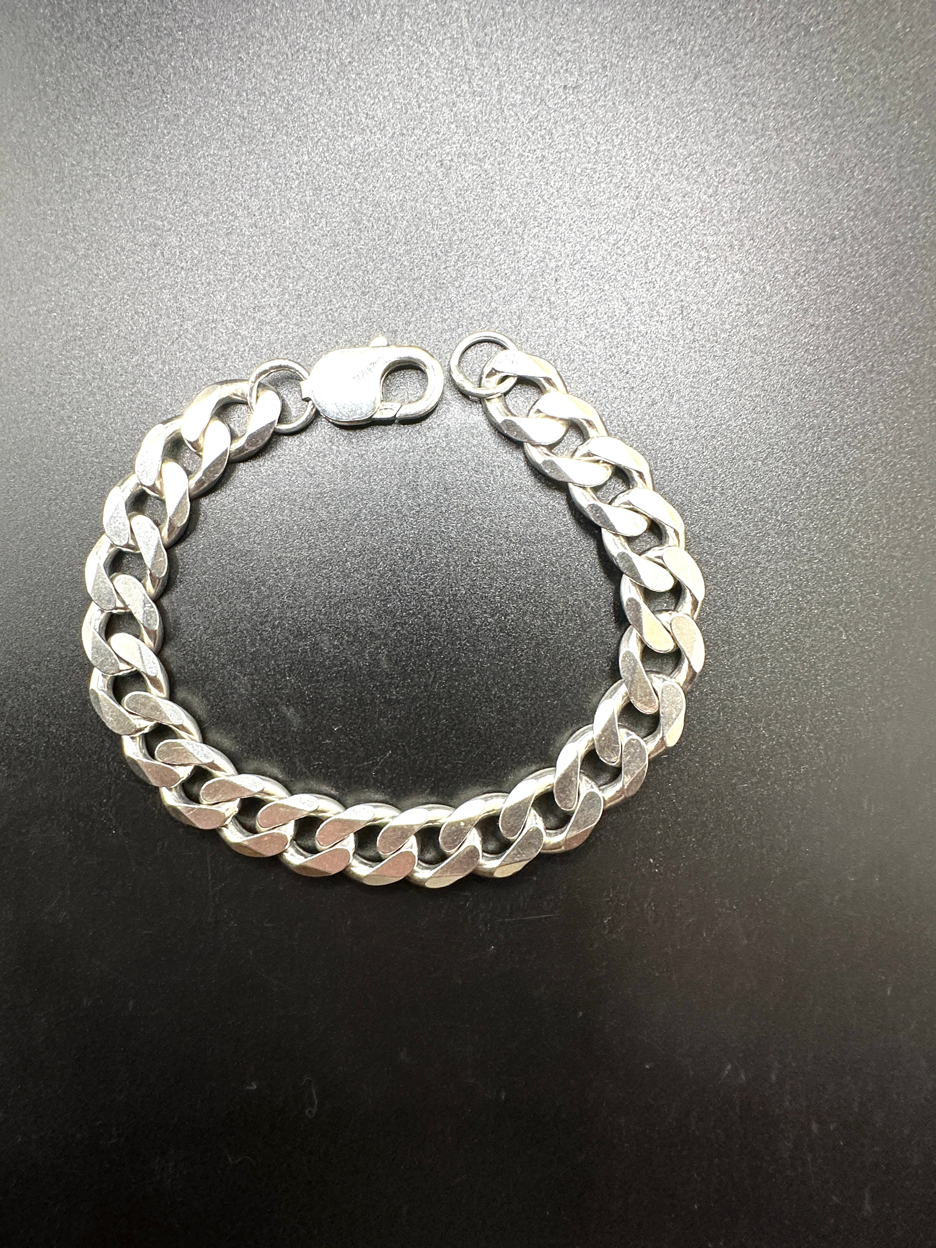 A Sterling Silver 925 Cuban Curb Chain Bracelet, composed of flattened and twisted links. The materials are confirmed to be 925 silver. It is secured by a functional lobster claw clasp, which is visibly stamped with ‘925’.