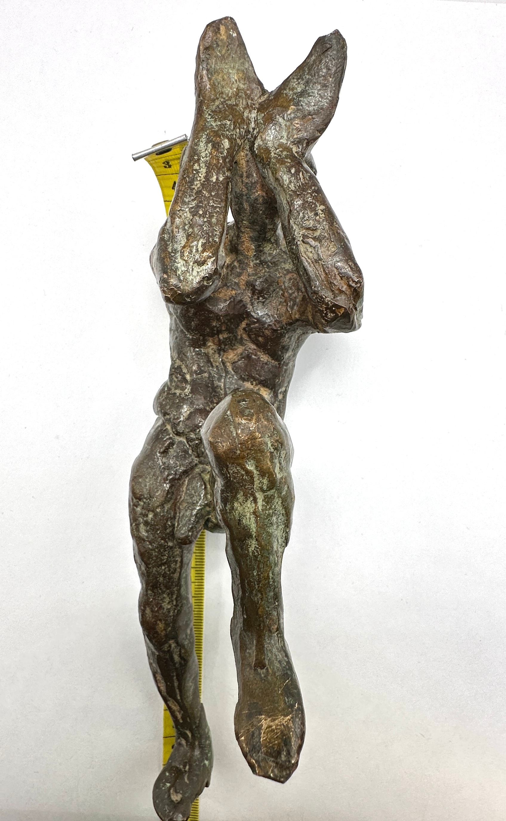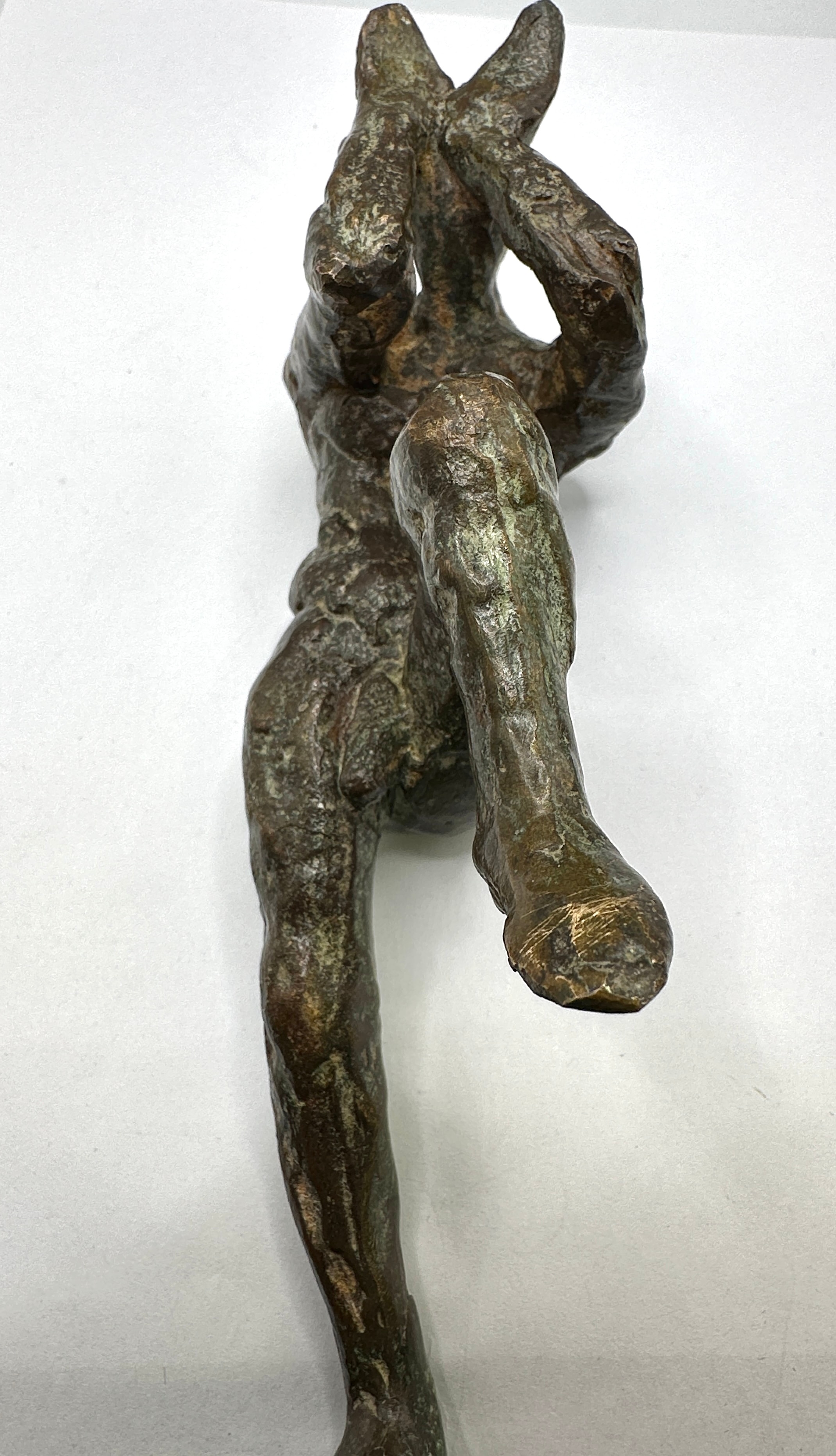An abstract expressionist bronze figural sculpture, rendered with a rough, textured surface. The piece depicts a human or humanoid form with indistinct features, hands raised towards the head in a gesture, and one leg bent, suggesting a dynamic or distressed pose. The bronze material exhibits a variegated dark brown and greenish patina. No artist’s signature, foundry marks, or other textual inscriptions are discernible on the sculpture itself.