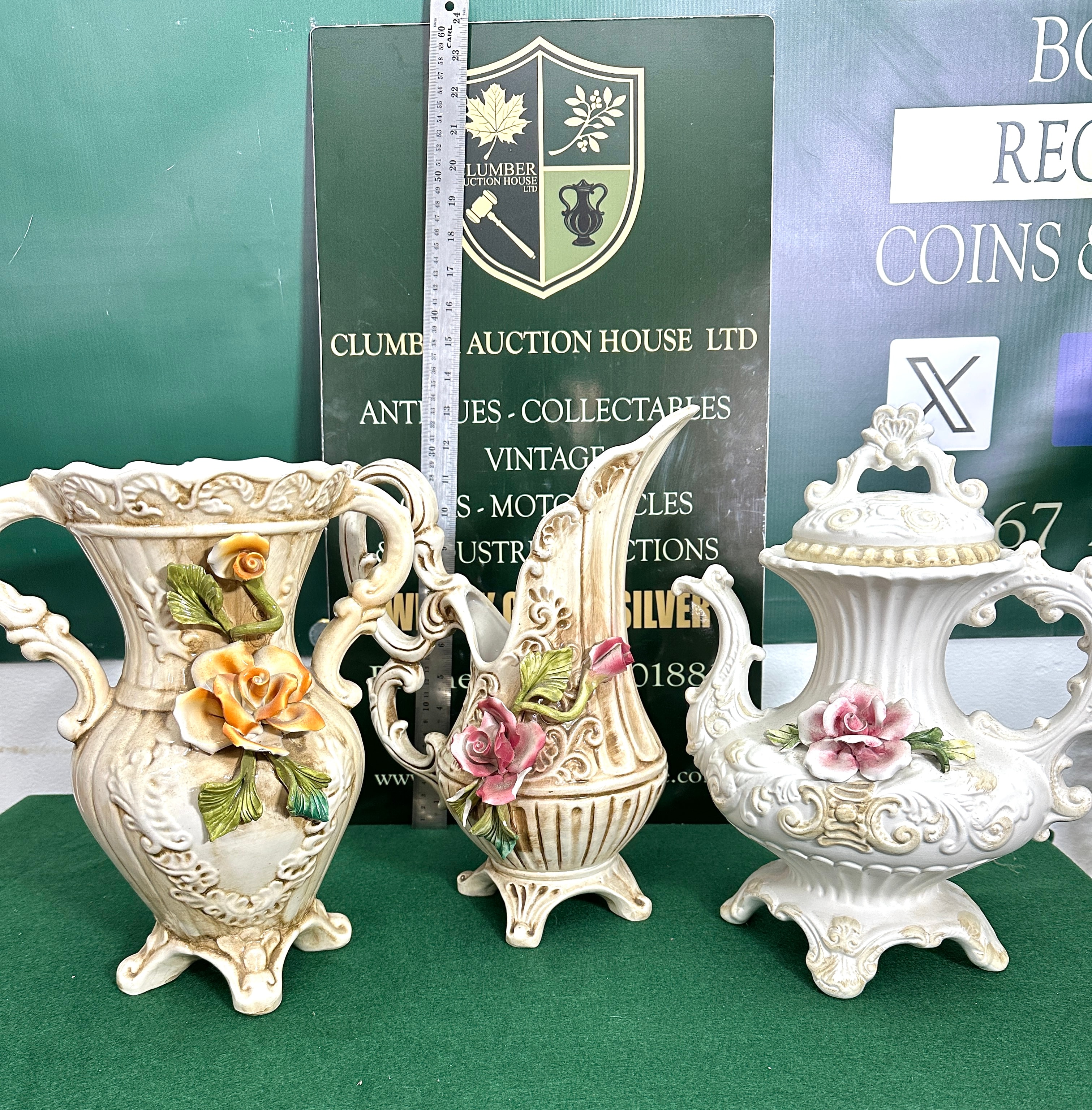 A group of three Capodimonte ceramic vessels, made in Italy, crafted in an ornate Rococo-revival or Baroque-inspired style. This lot includes two pitchers/ewers and one lidded urn-like vase. Each piece features a cream-colored glaze with deliberate antiqued brown accents highlighting the relief-molded scrolling and foliate patterns, further embellished with applied three-dimensional floral decorations primarily depicting roses in orange/yellow and pink hues with green leaves.