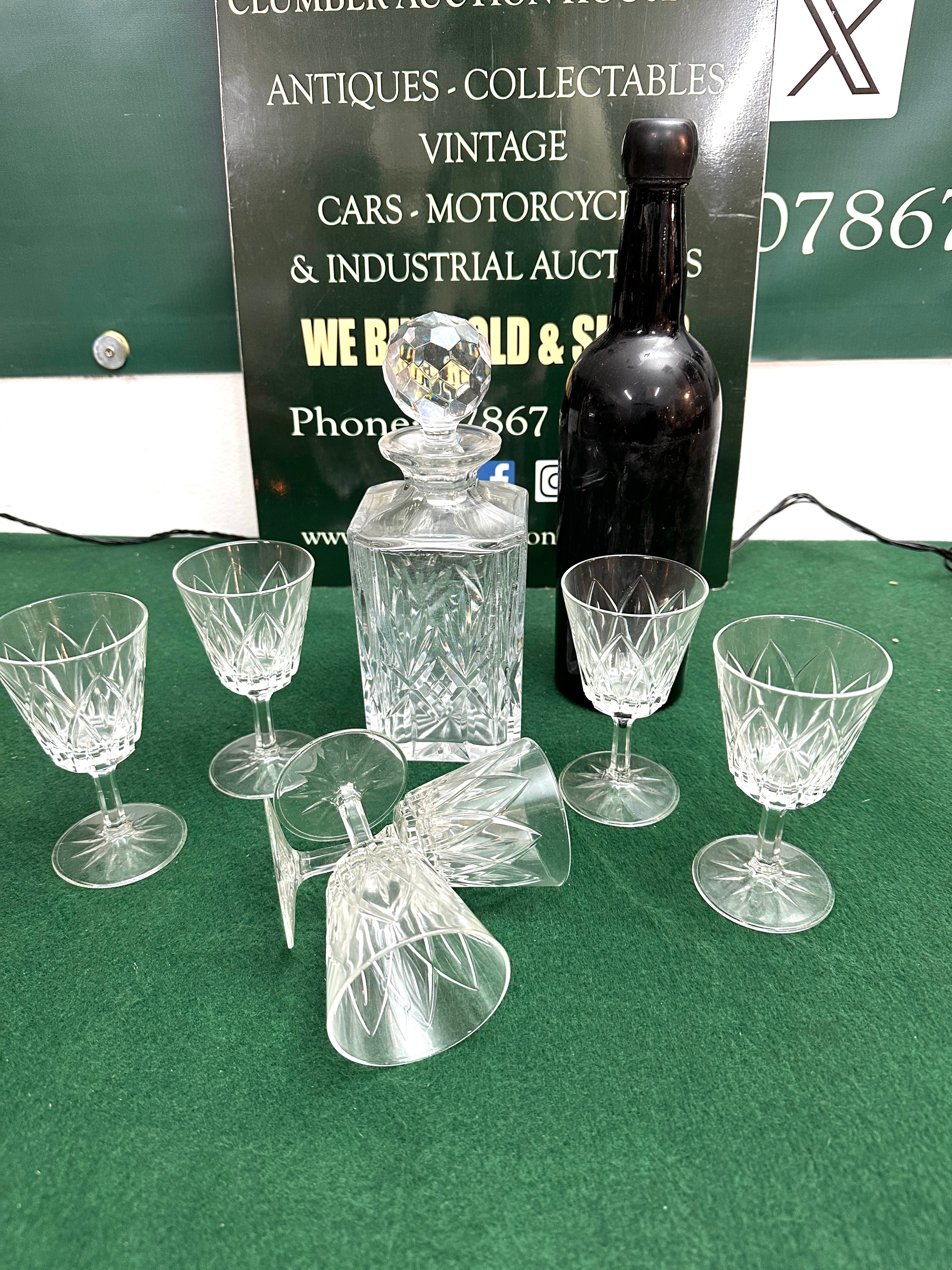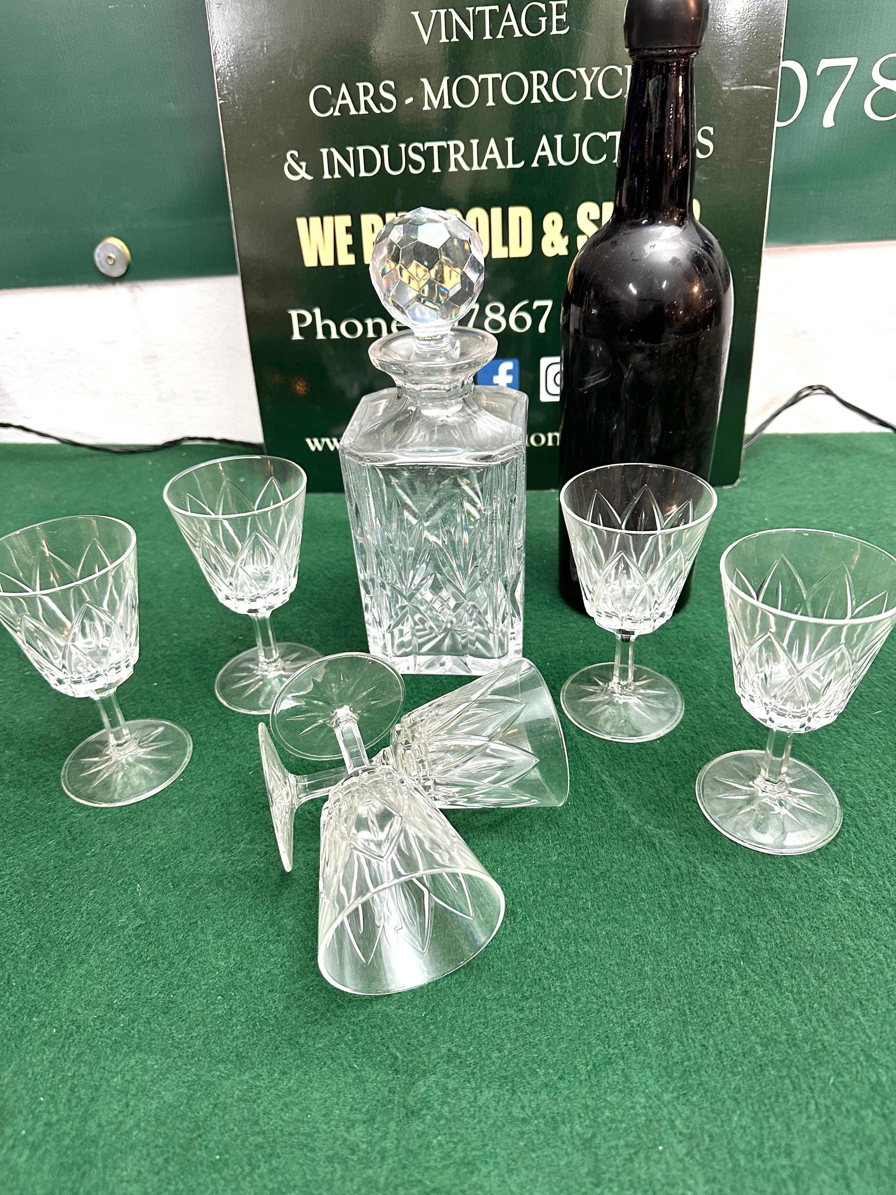 A set of clear cut glass or crystal items, comprising a square-bodied decanter with a faceted spherical stopper and six stemmed glasses. Both the decanter and the glasses feature matching geometric cut patterns, executed in a classical or traditional style. The set is consistent with mid-20th century design. The dark-coloured glass bottle is stamped 1966 and likely to be port.