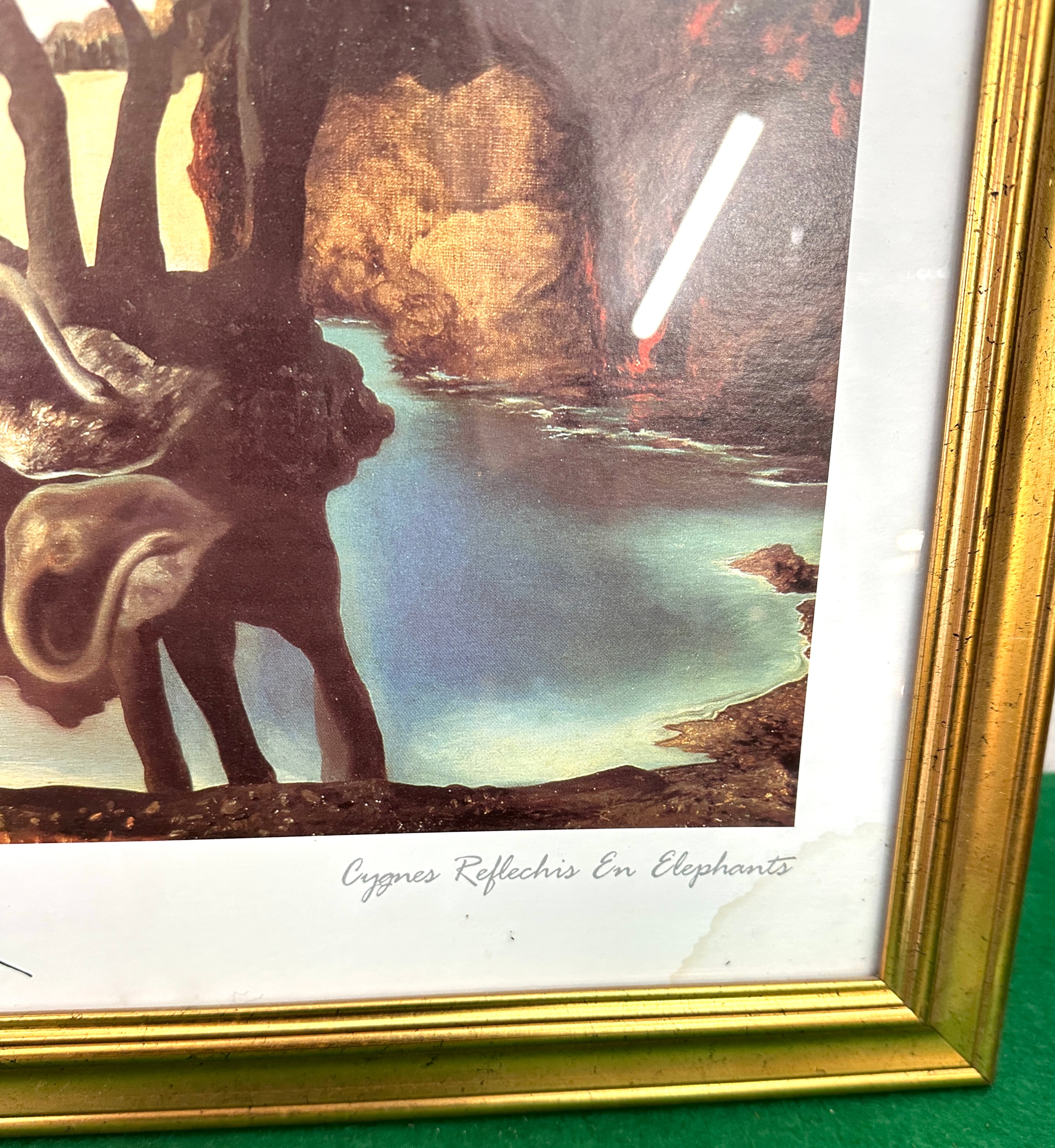 A framed print after Salvador Dali’s ‘Swans Reflecting Elephants’, c. 1937. This reproduction features a surrealist landscape painting depicting swans reflecting as elephants. The artwork is titled “Cygnus Reflechis En Elephants” at the bottom right, with “Salvador Dali” printed at the bottom left and a stylized signature in the center. The print is displayed under glass in a gilded wooden frame, backed by cardboard with a hanging wire.