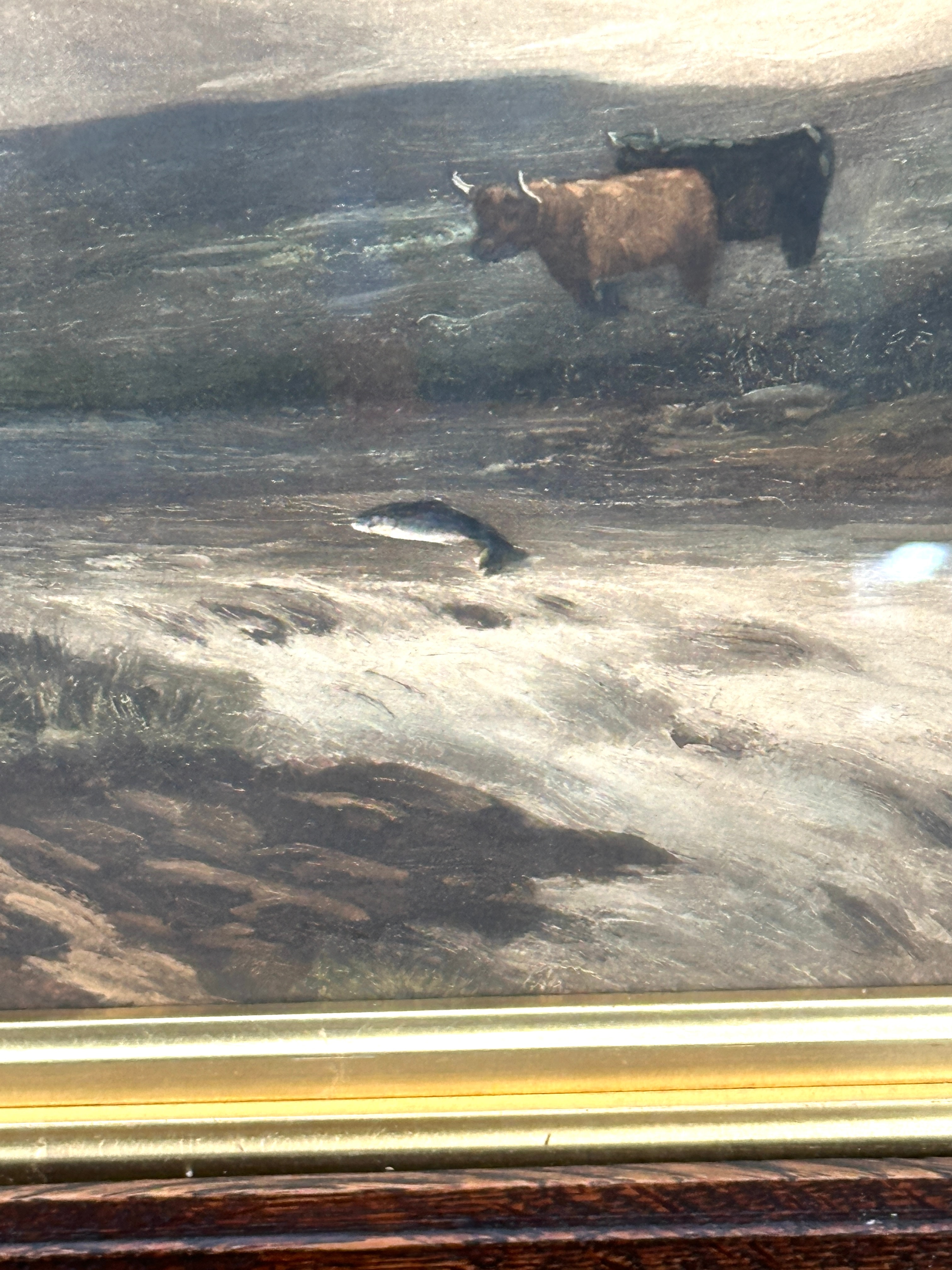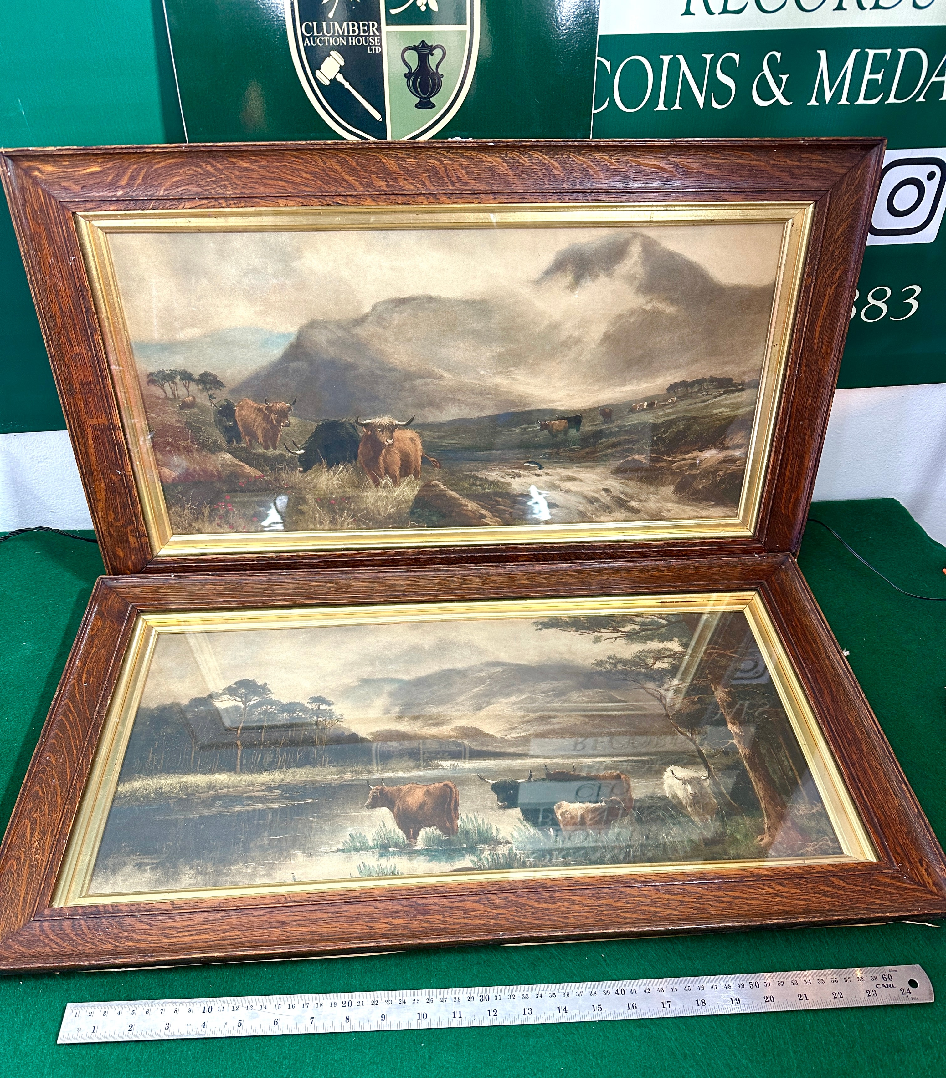 This lot comprises a pair of framed prints, likely chromolithographs, depicting traditional pastoral landscape scenes featuring long-horned cattle, possibly Highland breeds. One print showcases cattle in a mountainous river setting, while the other illustrates them by a lakeside with trees. Each artwork is presented under glass within a matching dark-stained wooden frame, exhibiting a distinct grain and a gold-toned inner fillet, suggesting a late 19th or early 20th-century period. No artist signatures or specific titles are clearly visible on the prints themselves.