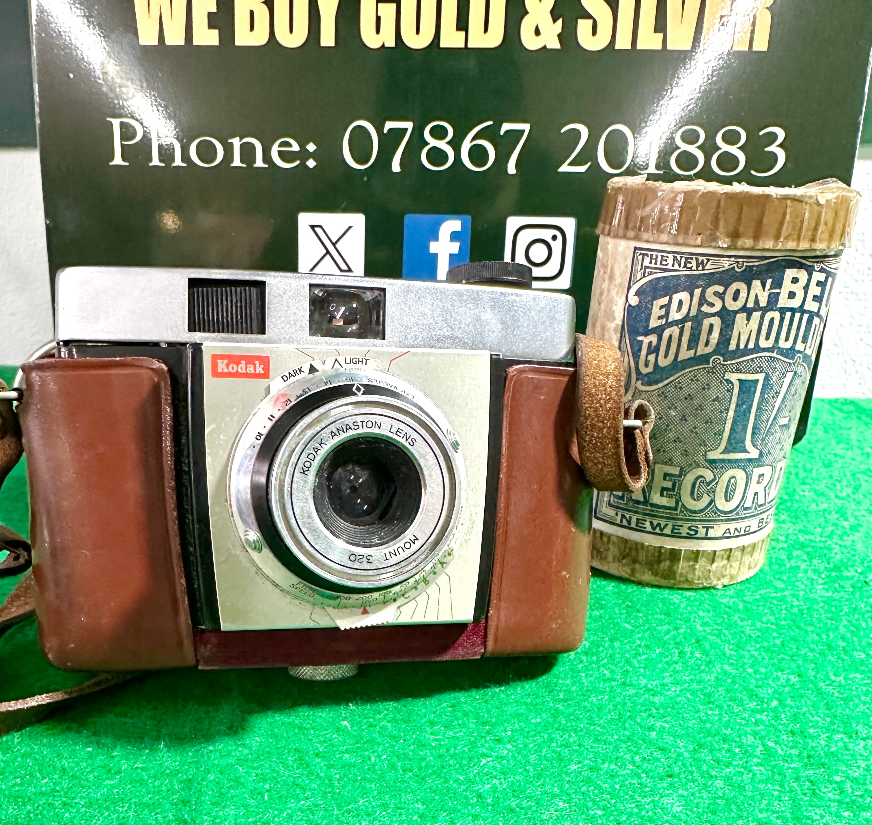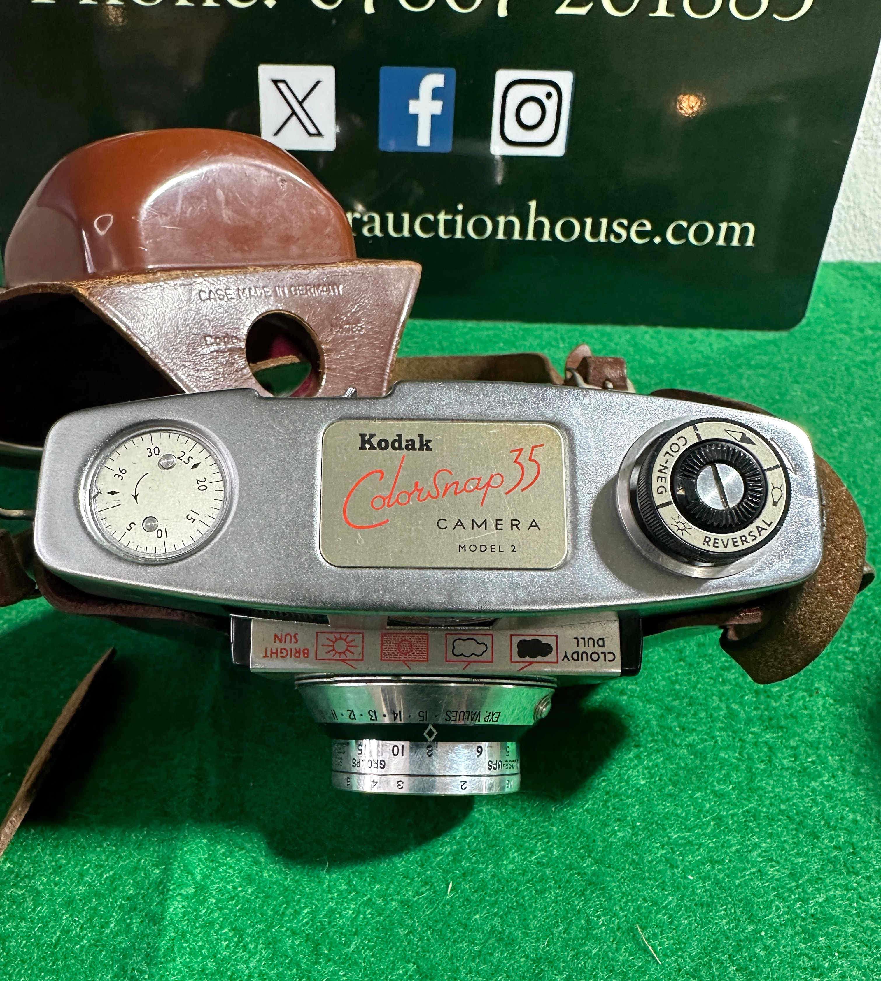 A Kodak Colorsnap 35 Model 2 camera, constructed from silver-tone metal with black accents. It features a “Kodak Anastar Lens Mount 3.2D” and visible dials for settings such as “DARK LIGHT,” “BRIGHT SUN CLOUDY DULL,” exposure values, and “COL-NEG REVERSAL.” The camera is encased in a brown leather-like half-case with a strap, the interior flap faintly inscribed “CASE MADE IN GERMANY.”