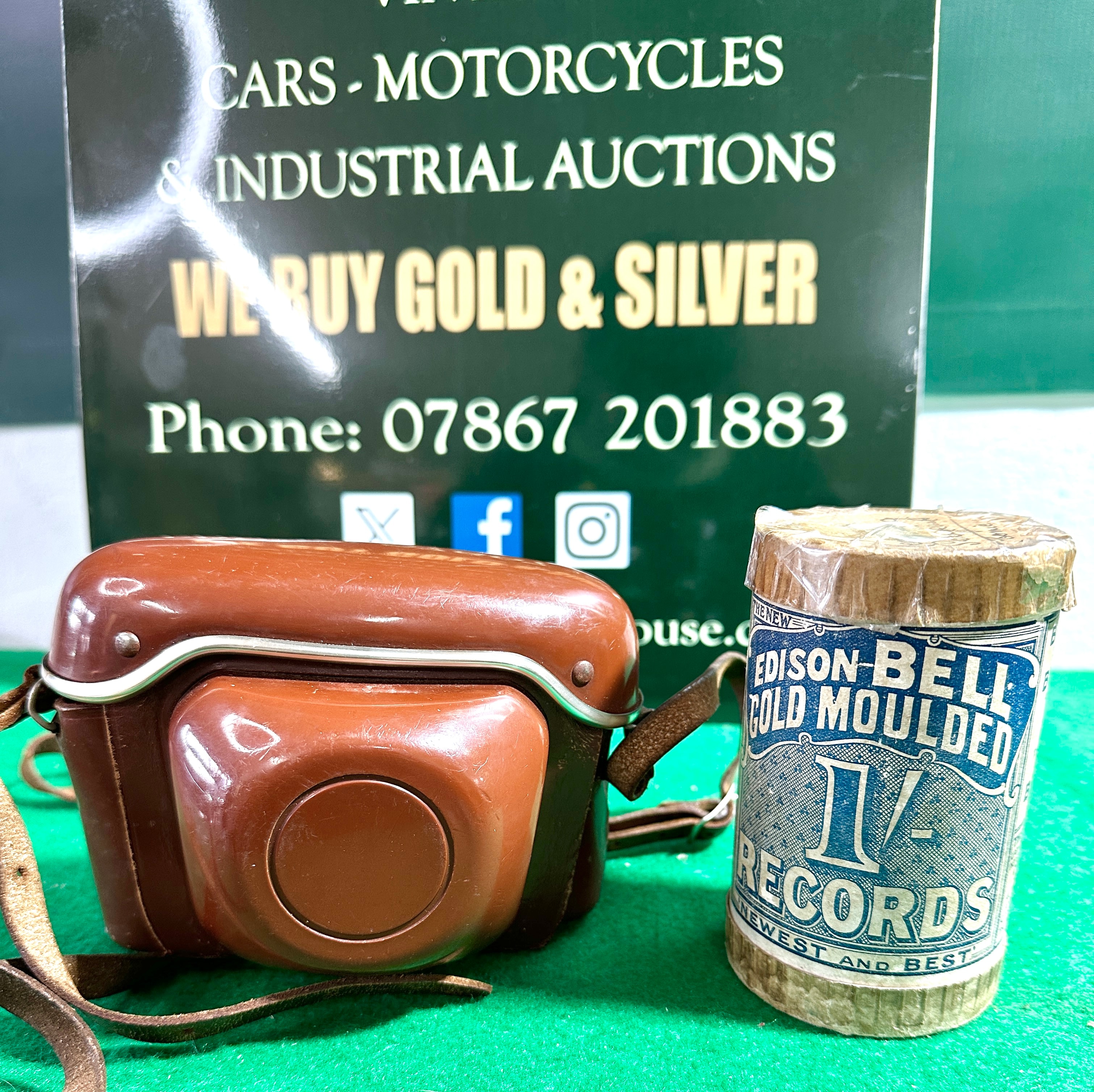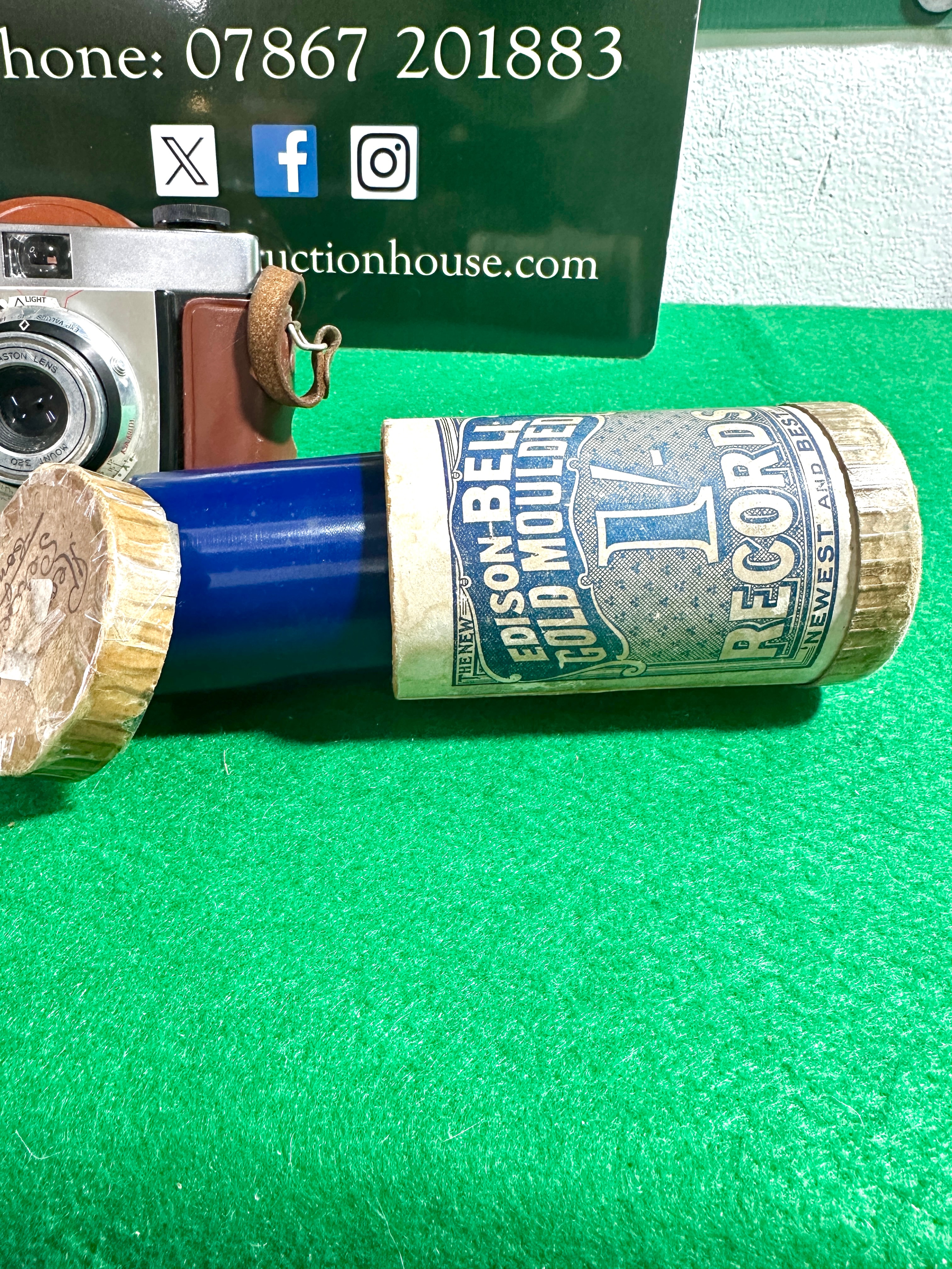 Accompanied by a cylindrical “Edison-Bell Gold Moulded” record container, featuring a distressed blue and cream label with the text “THE NEW EDISON-BELL GOLD MOULDED 1/- RECORDS NEWEST AND BEST,” revealing a blue cylinder within.