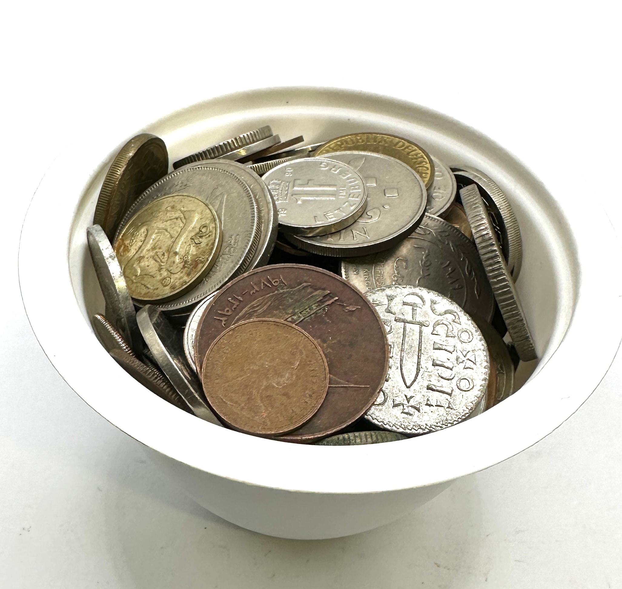 A mixed collection of numerous world coins, predominantly composed of various metallic alloys in silver-toned, copper, and brass finishes. The assortment encompasses circulating currency from multiple countries and historical periods, with visible dates ranging from the mid-20th century (e.g., 1954, 1970) into the early 21st century (e.g., 2013, 2015). Visible scripts include Latin, Arabic (e.g., “KUWAIT,” “الإمارات العربية المتحدة” – United Arab Emirates), and Cyrillic (e.g., “СССР” – USSR), featuring identifiable denominations and country names such as “DEUTSCHE MARK” (German Mark), “PESETA” (Spanish), “REPUBBLICA ITALIANA” (Republic of Italy), “SUOMI FINLAND,” and “ΕΛΛΗΝΙΚΗ ΔΗΜΟΚΡΑΤΙΑ” (Hellenic Republic).