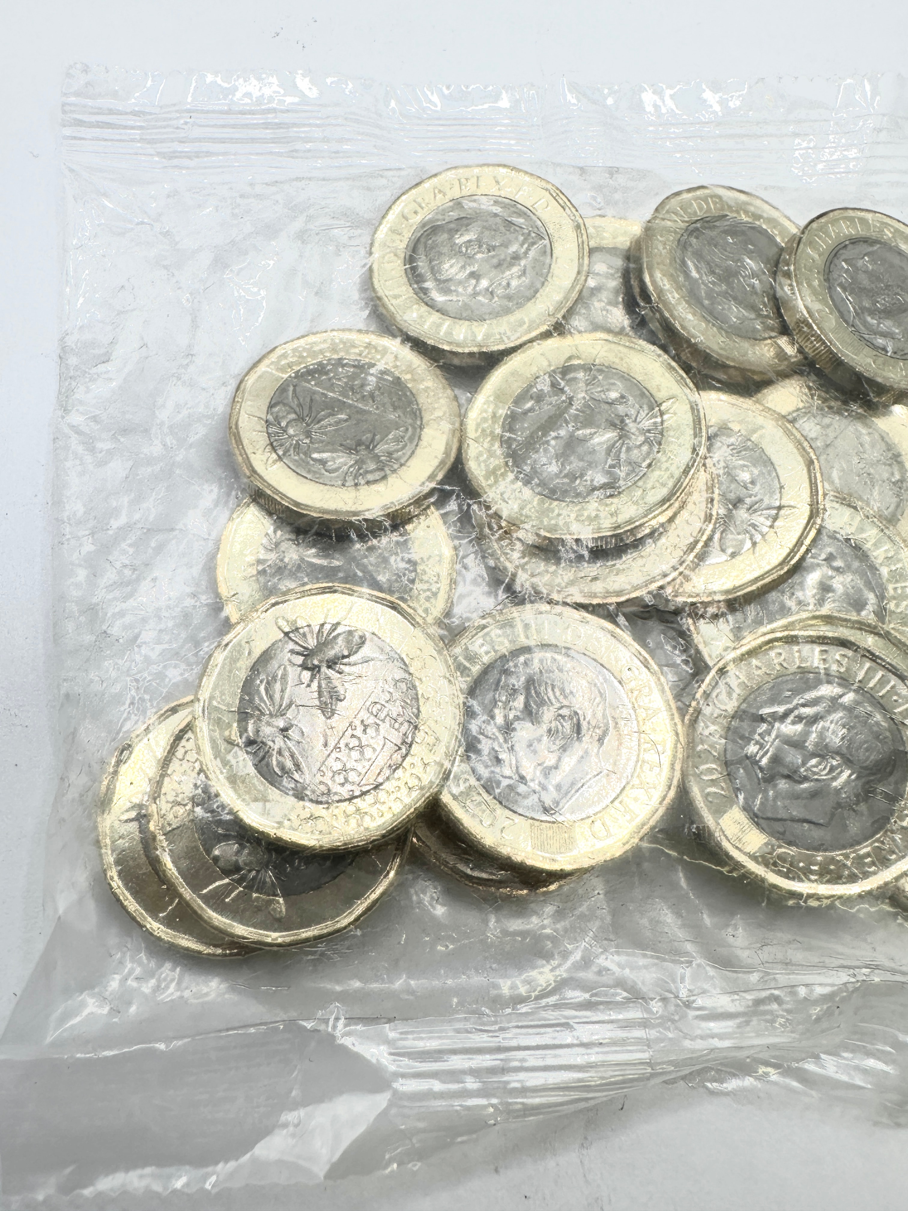 A collection of British bimetallic coins, featuring a silver-toned centre and a gold-toned outer ring, sealed within a clear plastic bag. The obverse designs consistently display a portrait of King Charles III, flanked by the text ‘CHARLES III’ and the Latin inscription ‘D G REX F D’ (Dei Gratia Rex Fidei Defensor). Visible date of 2025. Reverse design such as a shield featuring a bee or insect motif. These coins are consistent with modern United Kingdom £1 coinage, with the description of a 2025 United Kingdom BU Definitive Coin Set from The Royal Mint.