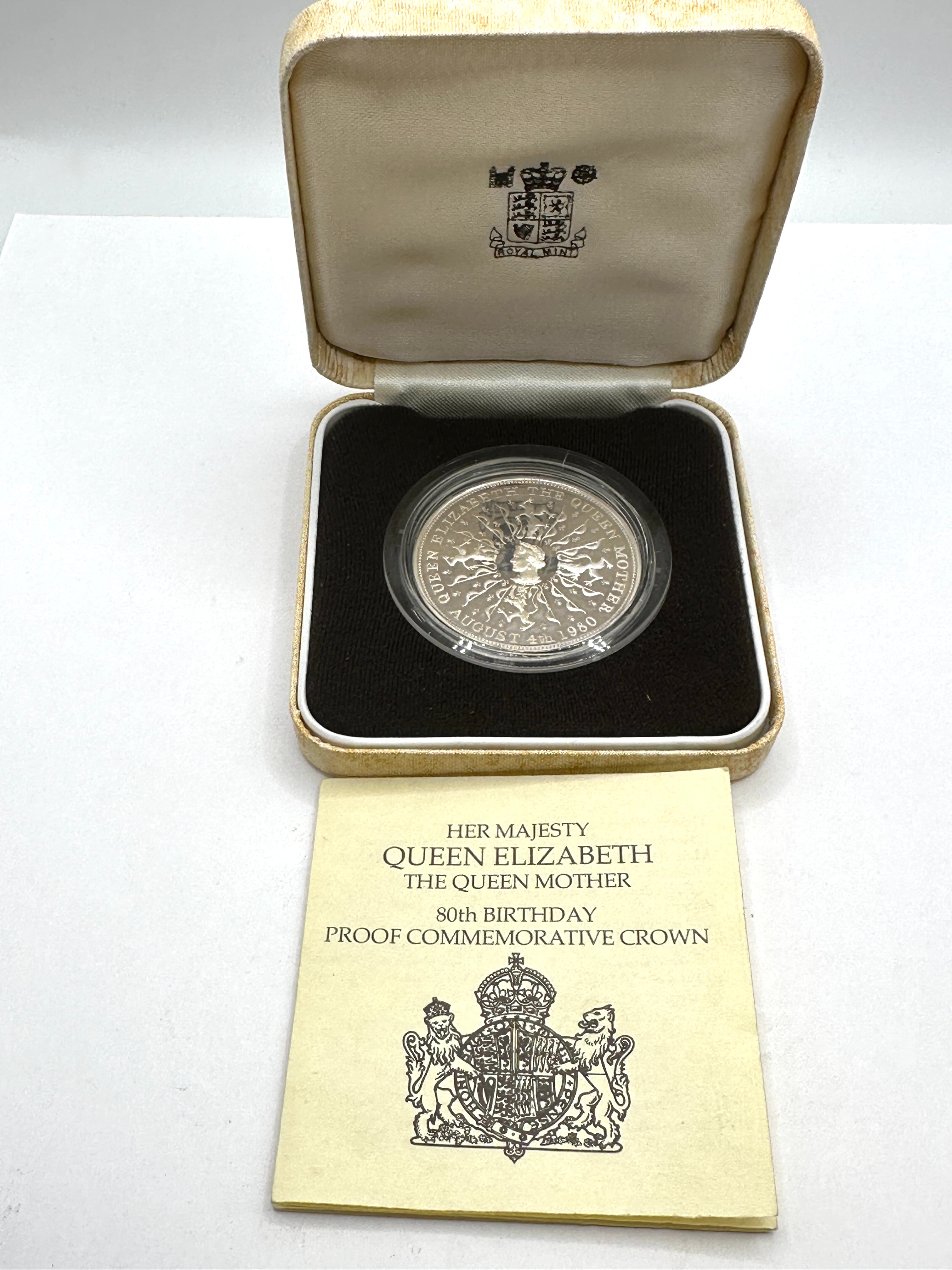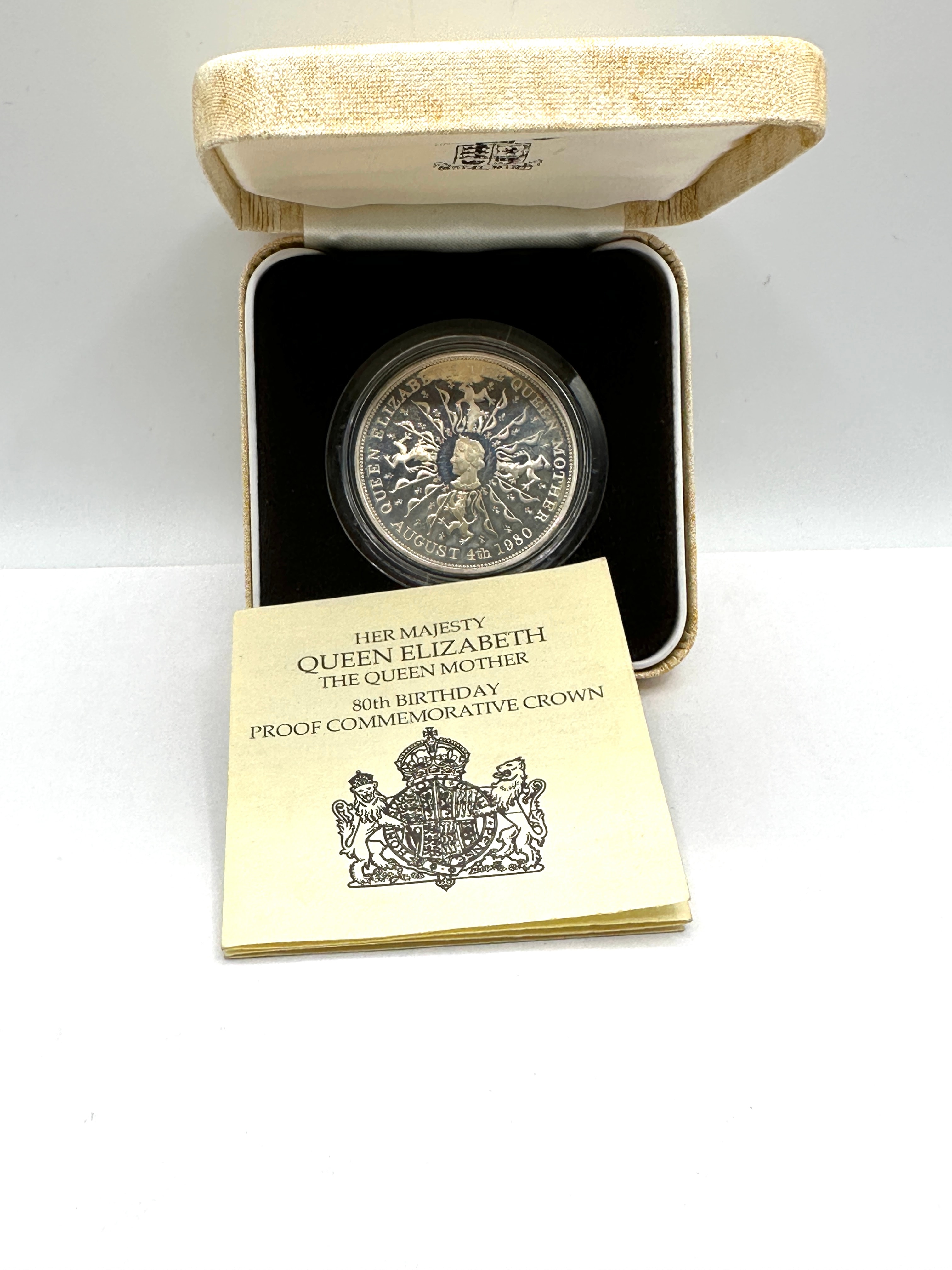 A 1980 Queen Elizabeth The Queen Mother 80th Birthday Proof Silver Crown. This modern commemorative coin is encapsulated within a clear protective holder. It is housed in a hinged, beige fabric-covered box with a black velvet interior, marked “ROYAL MINT” and a crest on the inner lid. The visible side of the coin displays a sunburst design encircled by “QUEEN ELIZABETH THE QUEEN MOTHER” and the date “AUGUST 4 1980”. Included is an informational paper leaflet, detailing “HER MAJESTY QUEEN ELIZABETH THE QUEEN MOTHER 80th BIRTHDAY PROOF COMMEMORATIVE CROWN,” adorned with a royal coat of arms bearing the mottos “DIEU ET MON DROIT” and “HONI SOIT QUI MAL Y PENSE”.