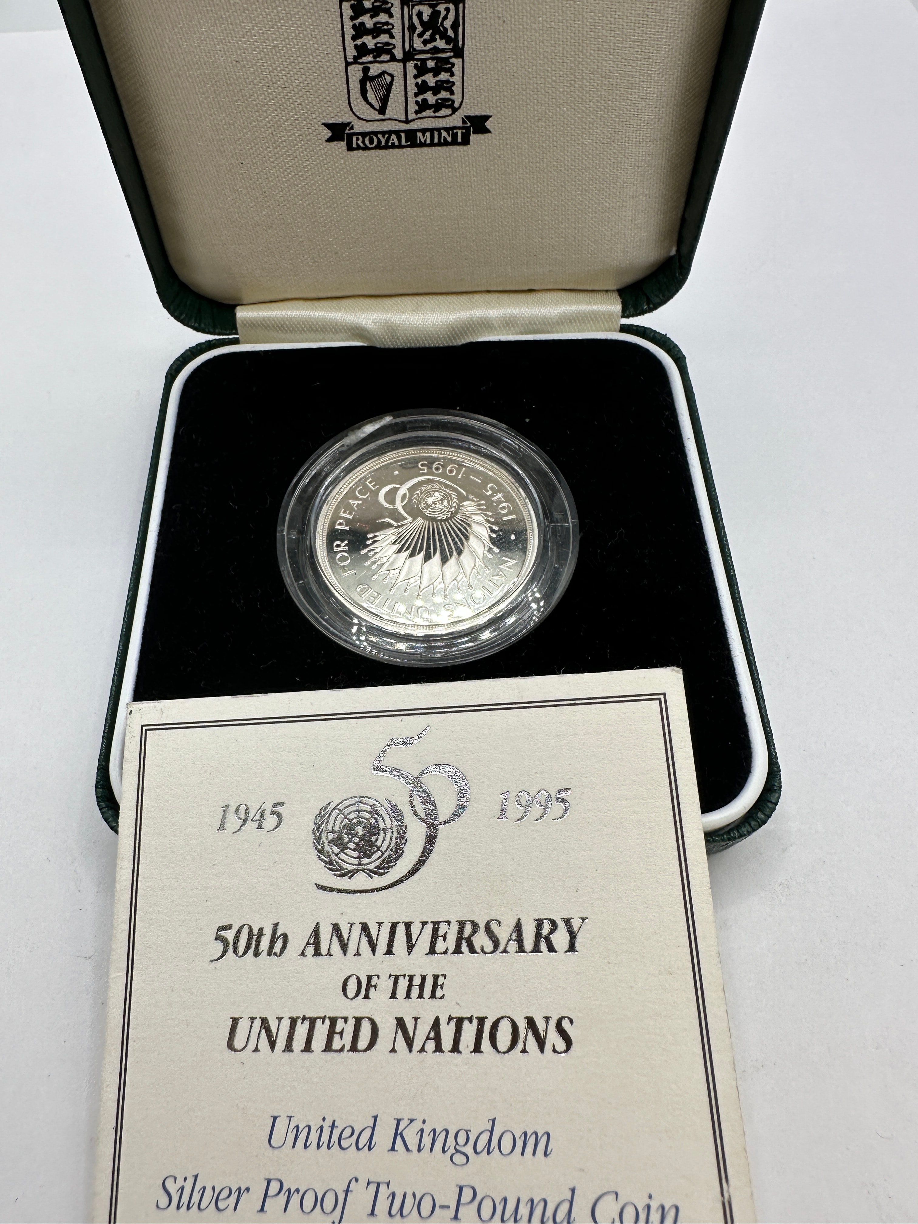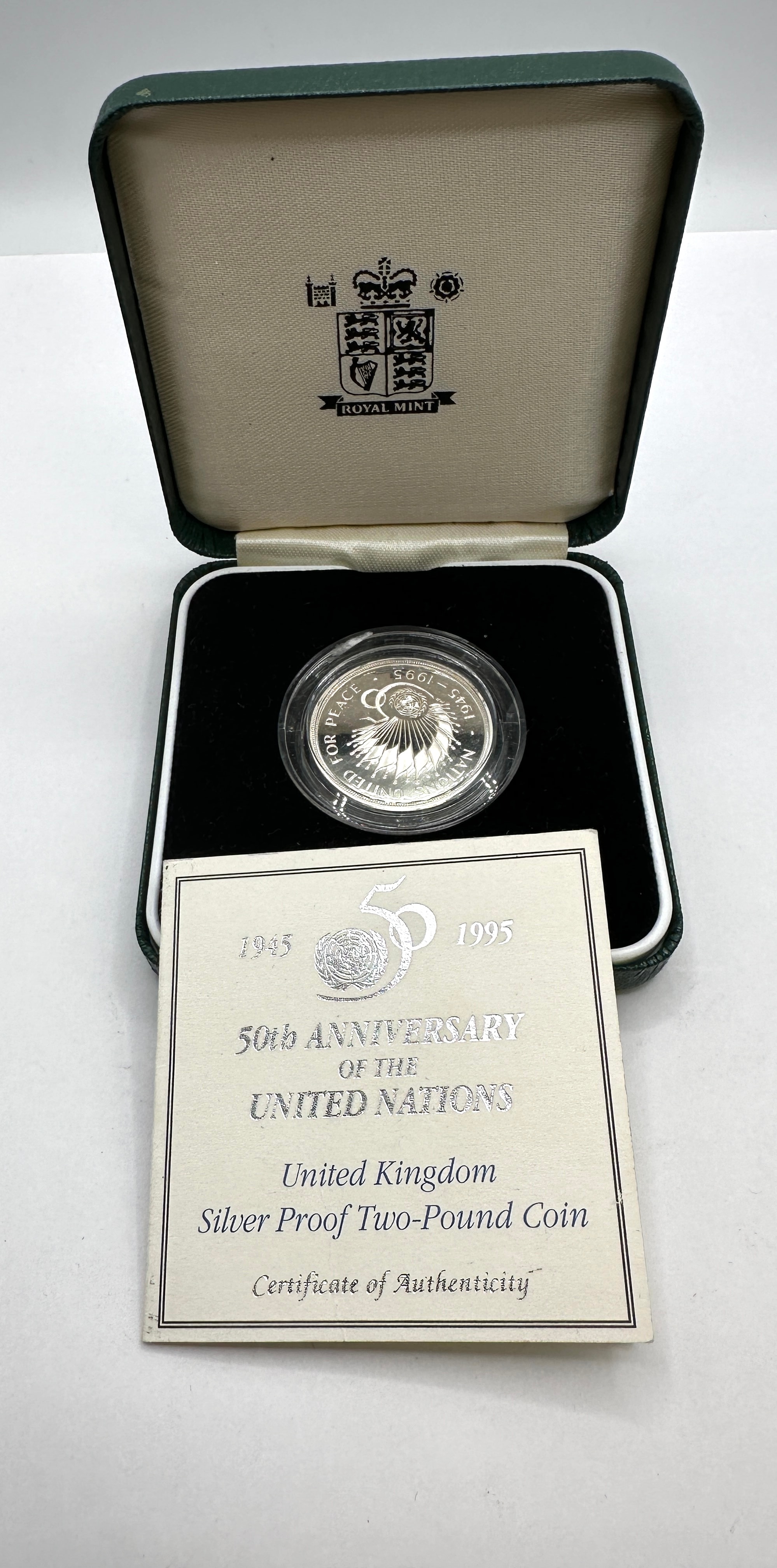 A United Kingdom 1995 Silver Proof Piedfort Two-Pound Coin, commemorating the 50th Anniversary of the United Nations. The coin, dated ‘1945 – 1995’ and inscribed with ‘UNITED NATIONS FOR PEACE’ on its visible face, is presented within a clear protective capsule. It is housed in its original dark green, hinged presentation case, which is lined with black velvet and cream satin and bears the ‘ROYAL MINT’ crest on the interior lid. The set includes its accompanying ‘Certificate of Authenticity’.