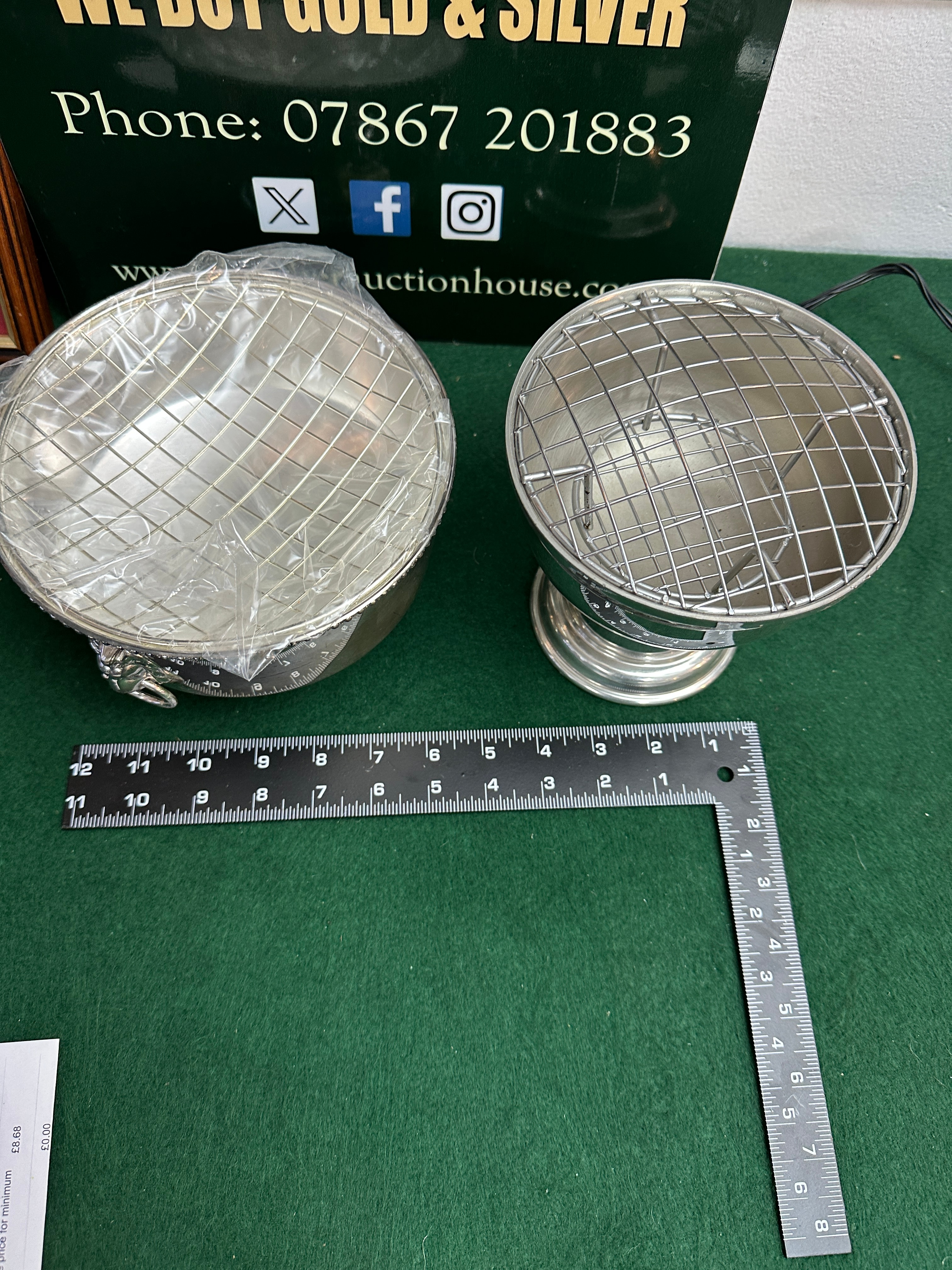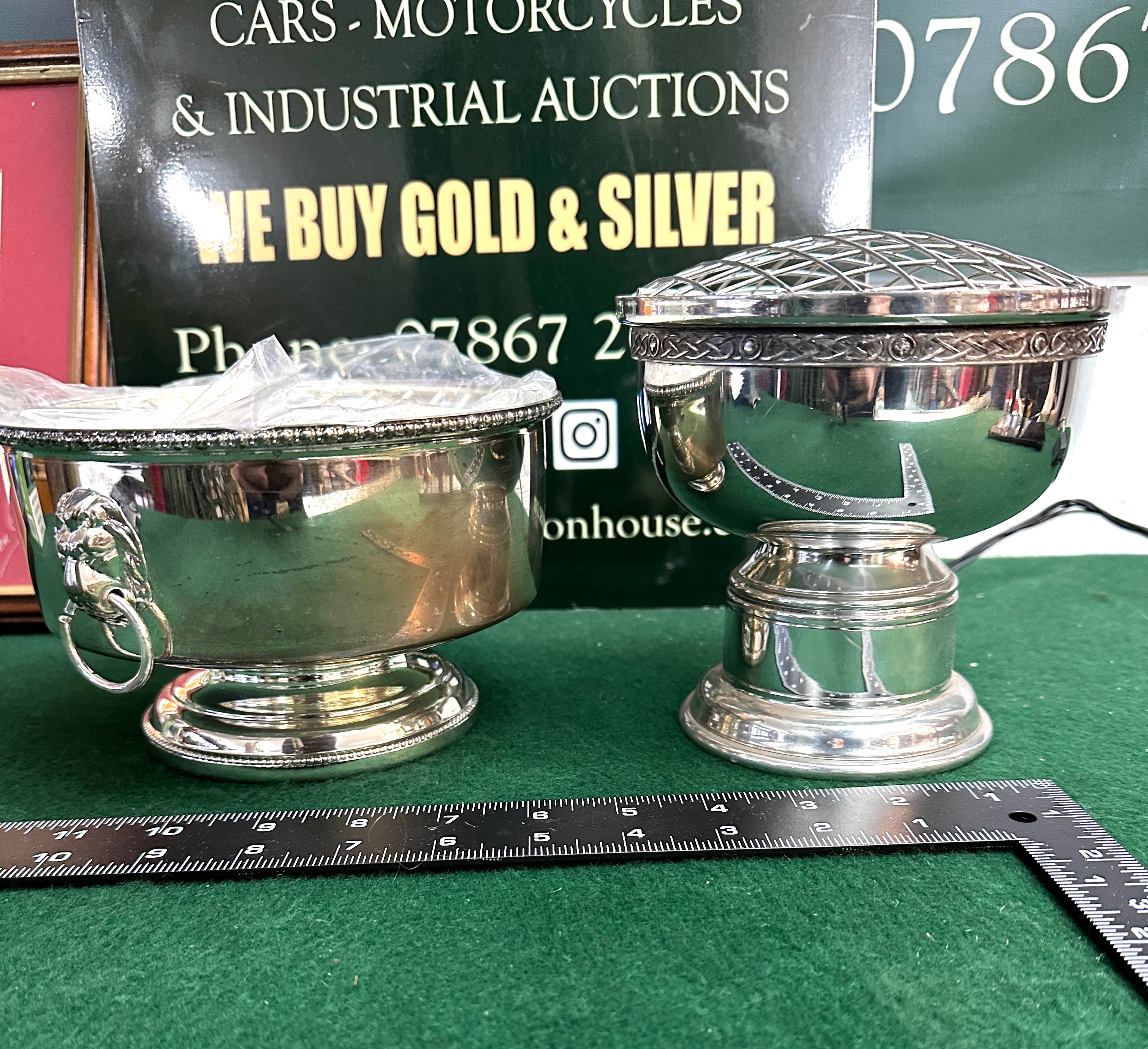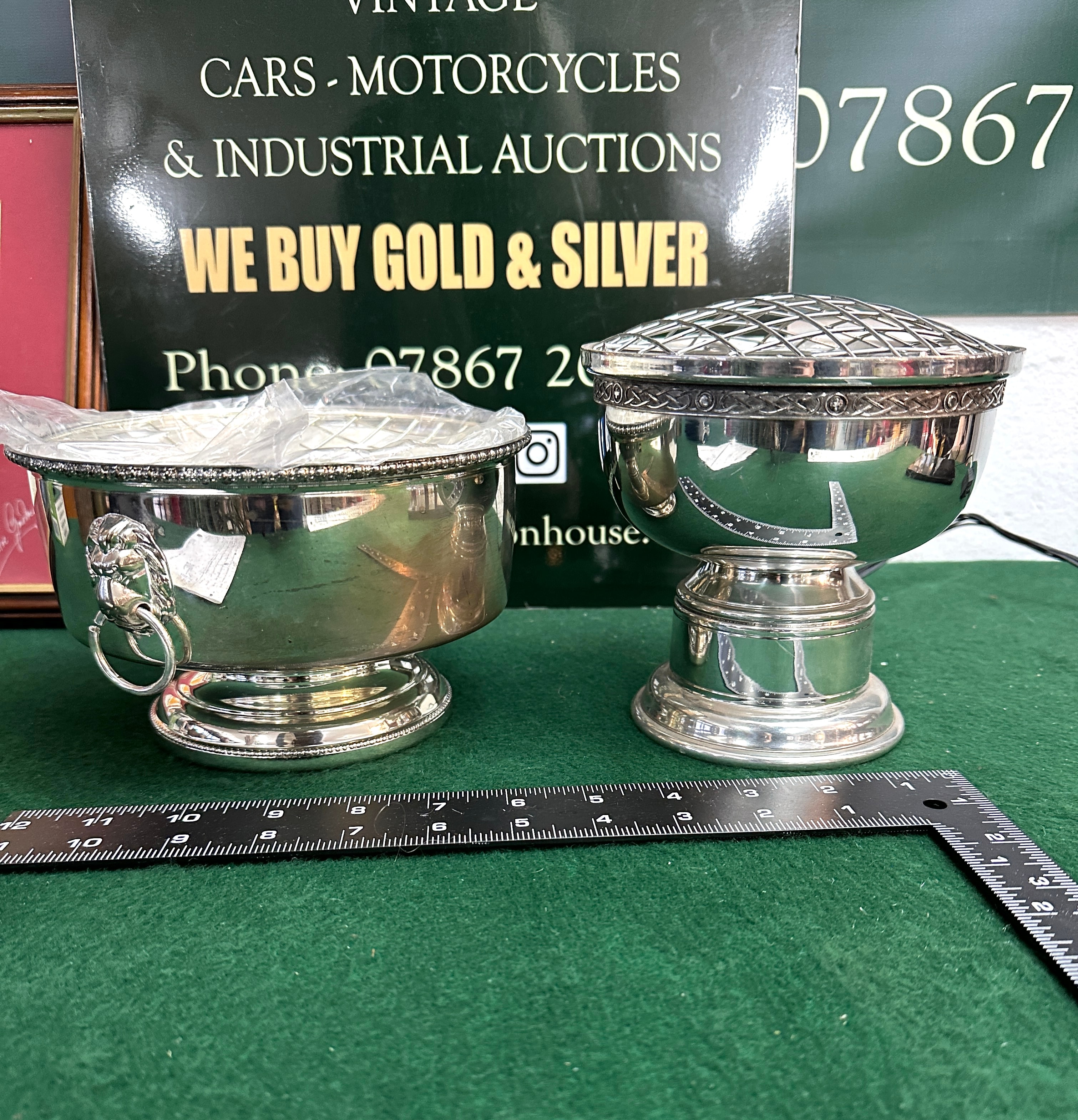 A pair of Neoclassical style silver tone bowls. The first, a footed bowl, features reeded details around its base and two prominent lion’s head ring handles. It is partially covered in clear plastic film. The second is a footed rose bowl, distinguished by a grid-patterned domed insert and reeded decorative bands on its upper rim and base. Both items exhibit a traditional Neoclassical aesthetic. No specific manufacturer’s marks or hallmarks are visible.