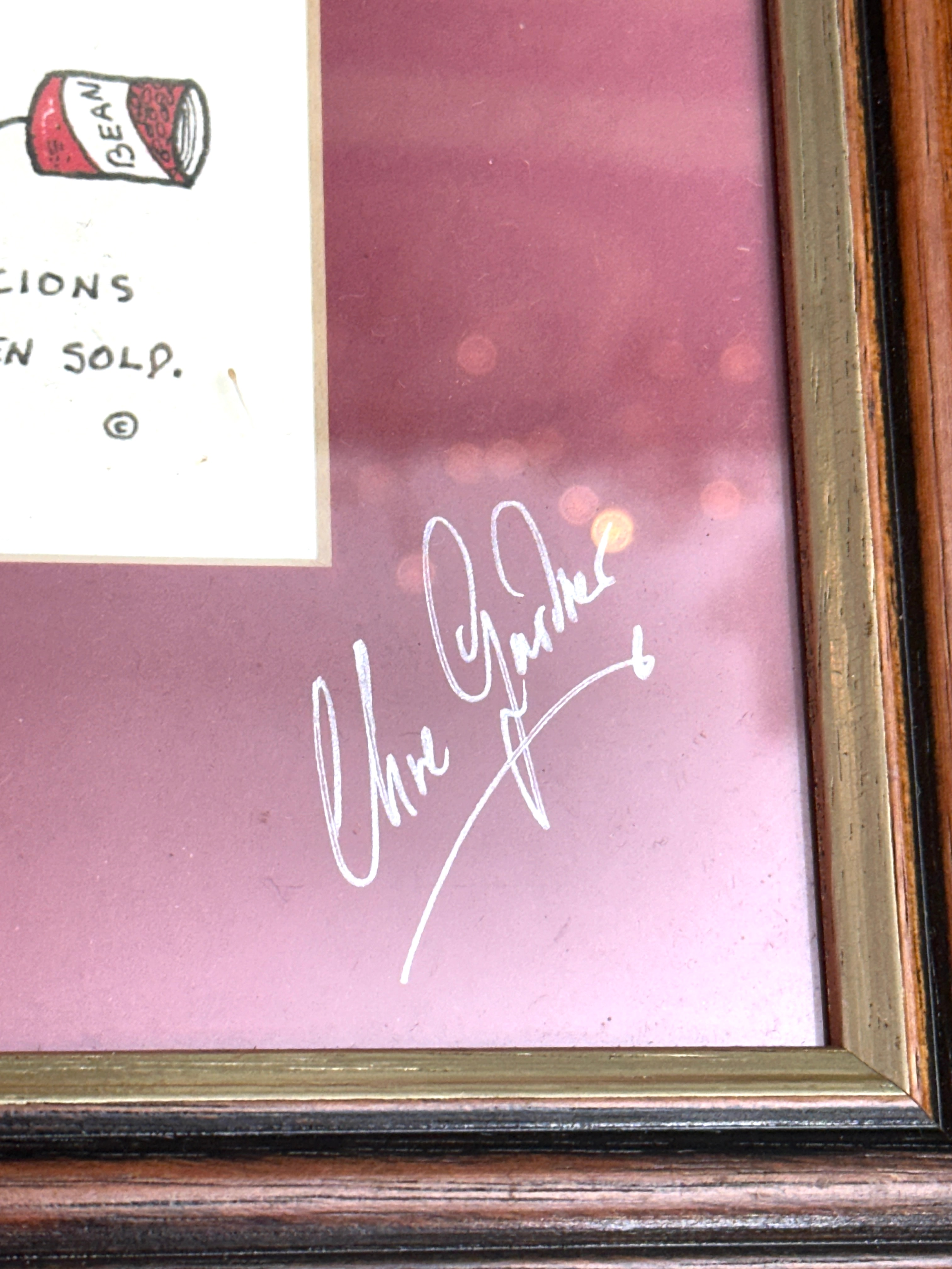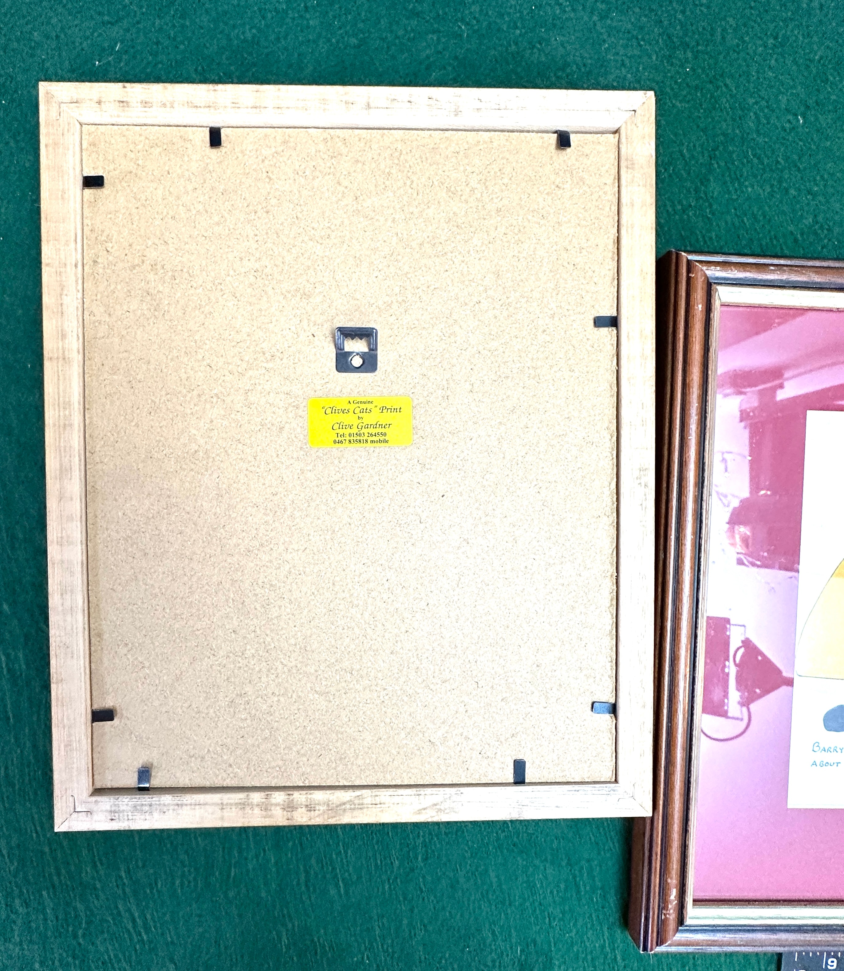 A pair of ‘Clives Calls’ prints by Clive Garner, featuring the humorous, cartoon-style character ‘Barry’. Each print depicts a yellow/orange, pear-shaped character with stick legs on a white ground, accompanied by a handwritten caption. The left print shows Barry as a Viking with a horned helmet and spear, captioned “AFTER BEING TOLD HE WAS ‘TOO OLD’, BARRY DECIDED TO START HIS ‘SECOND CHILDHOOD’.” The right print depicts Barry wearing a beanie and holding a “BEAN” can, with the caption “BARRY STARTED TO HAVE HIS SUSPICIONS ABOUT THE MIDDLE FINGER HE HAD BEEN SOLD.” Both prints are mounted with colored matting, blue on the left and maroon on the right, and housed in simple wooden frames with glass fronts. Each mat is signed in white script, consistent with “Clive Garner.” A label on the reverse of one frame confirms these are “A Genuine ‘Clives Calls’ Print” by “Clive Garner” from “BARRYSHED.COM.”