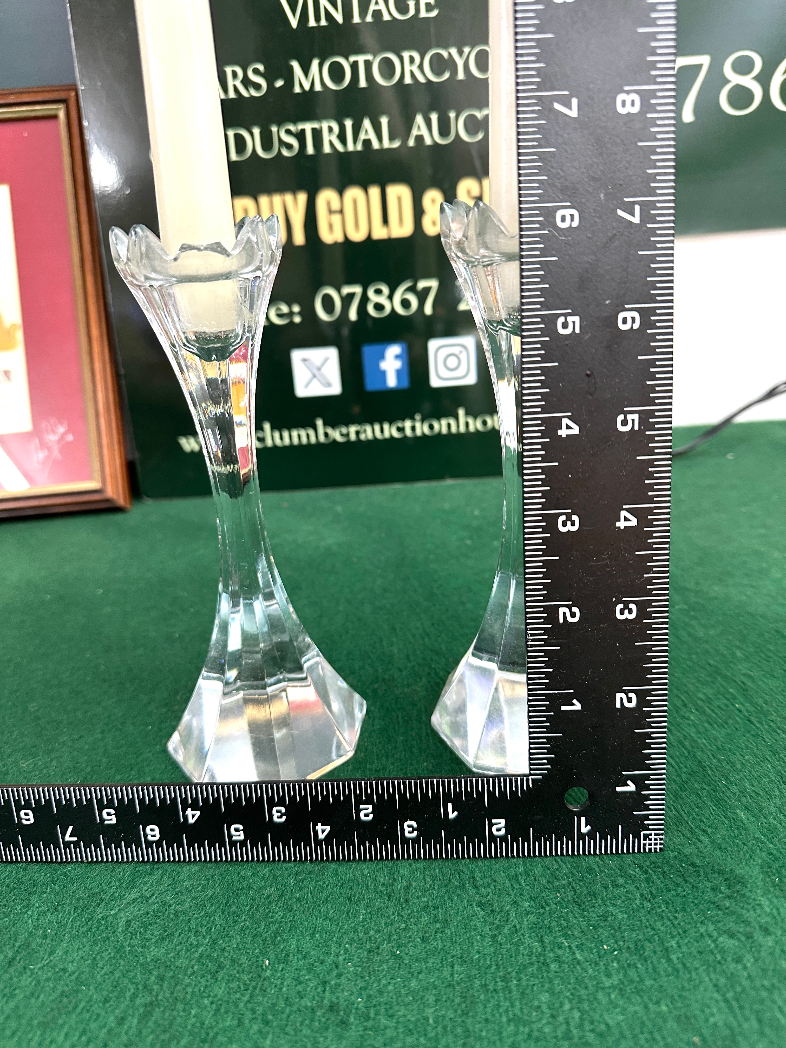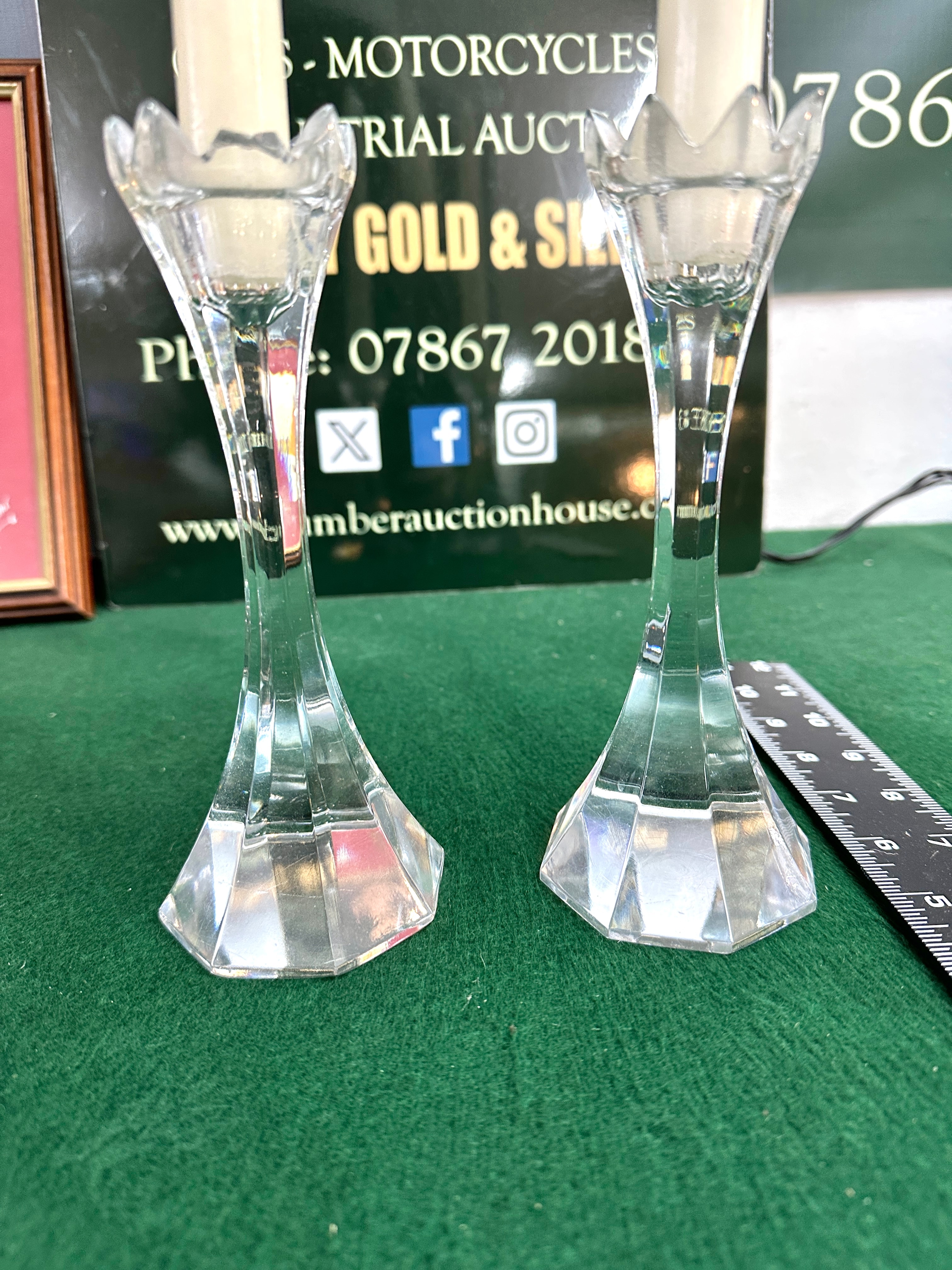 A pair of Villeroy & Boch crystal candlesticks, each featuring a clear, faceted design with a fluted, petal-like rim designed to hold a taper candle, a tapered stem, and a distinct multi-faceted octagonal base. The design suggests a modern decorative style, potentially dating from the mid-to-late 20th century or contemporary. No discernible maker’s marks, signatures, or inscriptions are visible on either item.