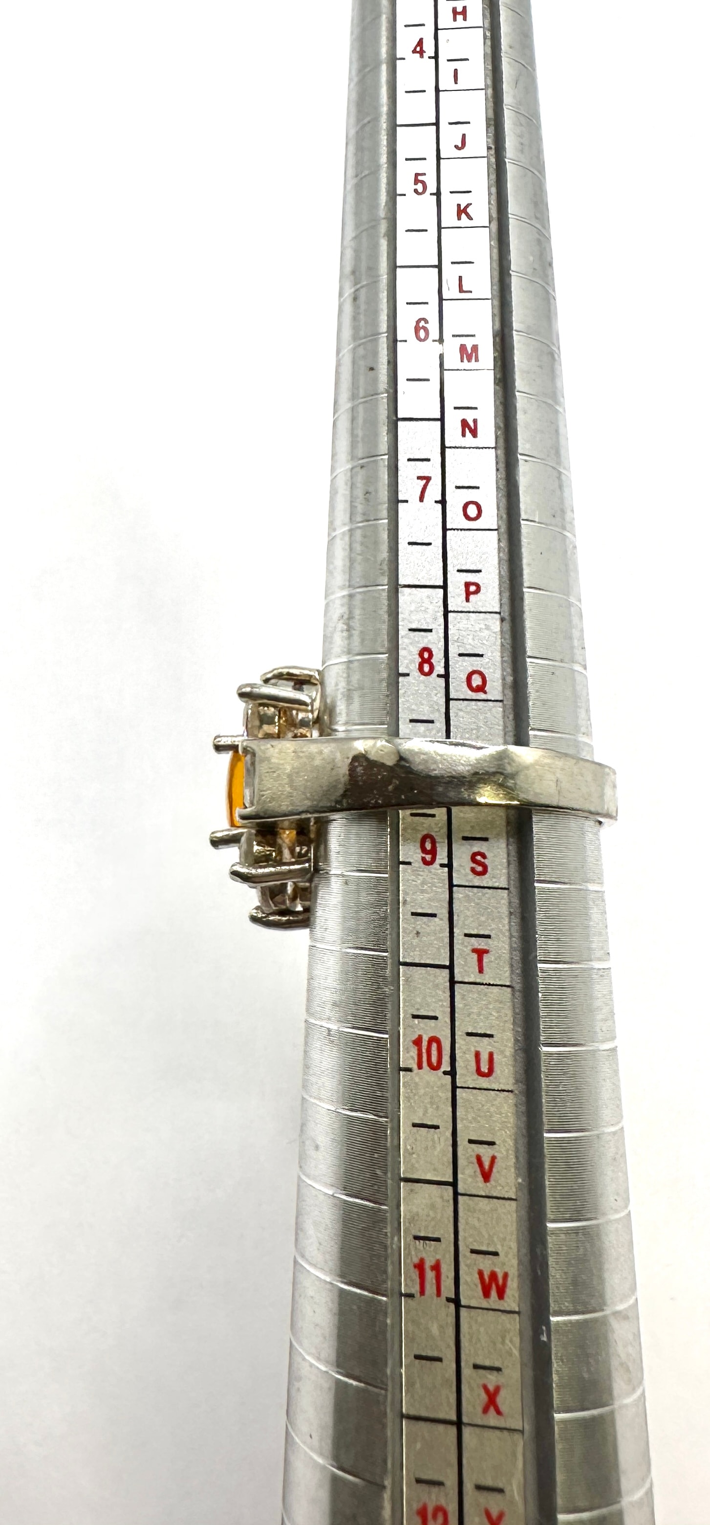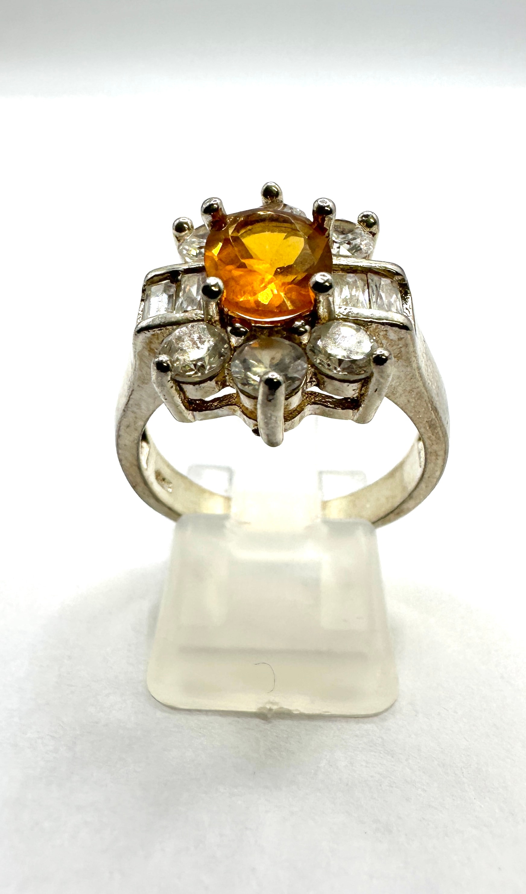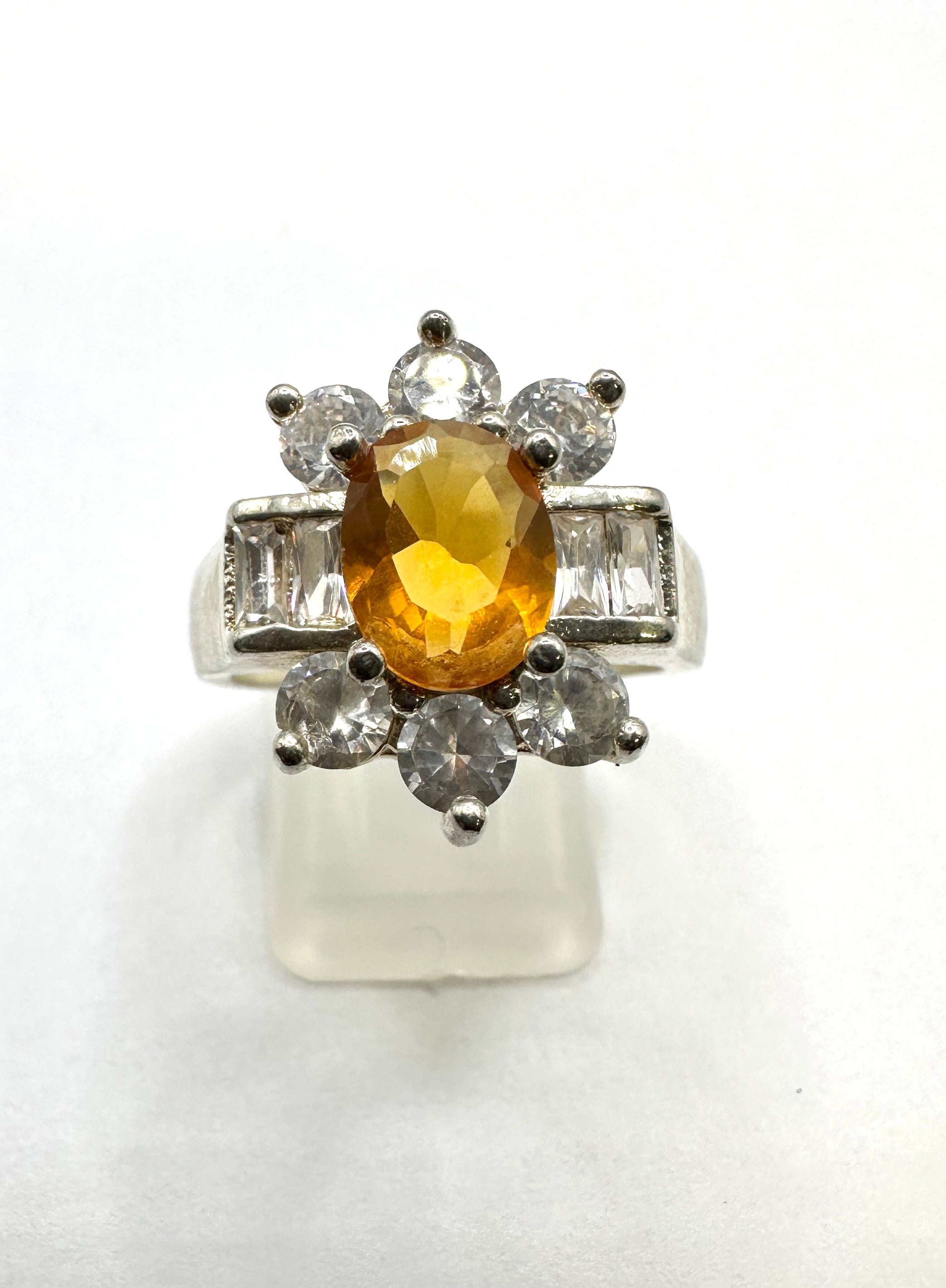 A cluster-style ring crafted from 925 silver, featuring a prominent oval-cut orange stone to the centre. This focal stone is surrounded by six round CZ Stones, further accented by two baguette-cut clear stones on each shoulder of the band.