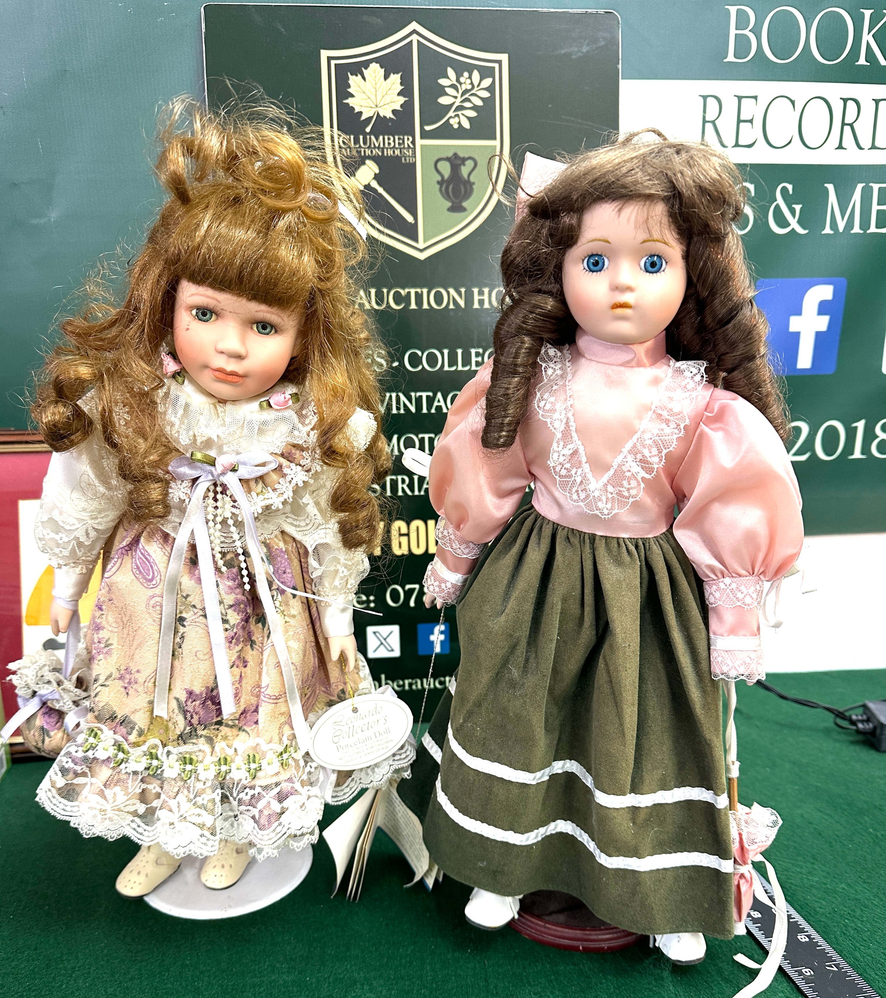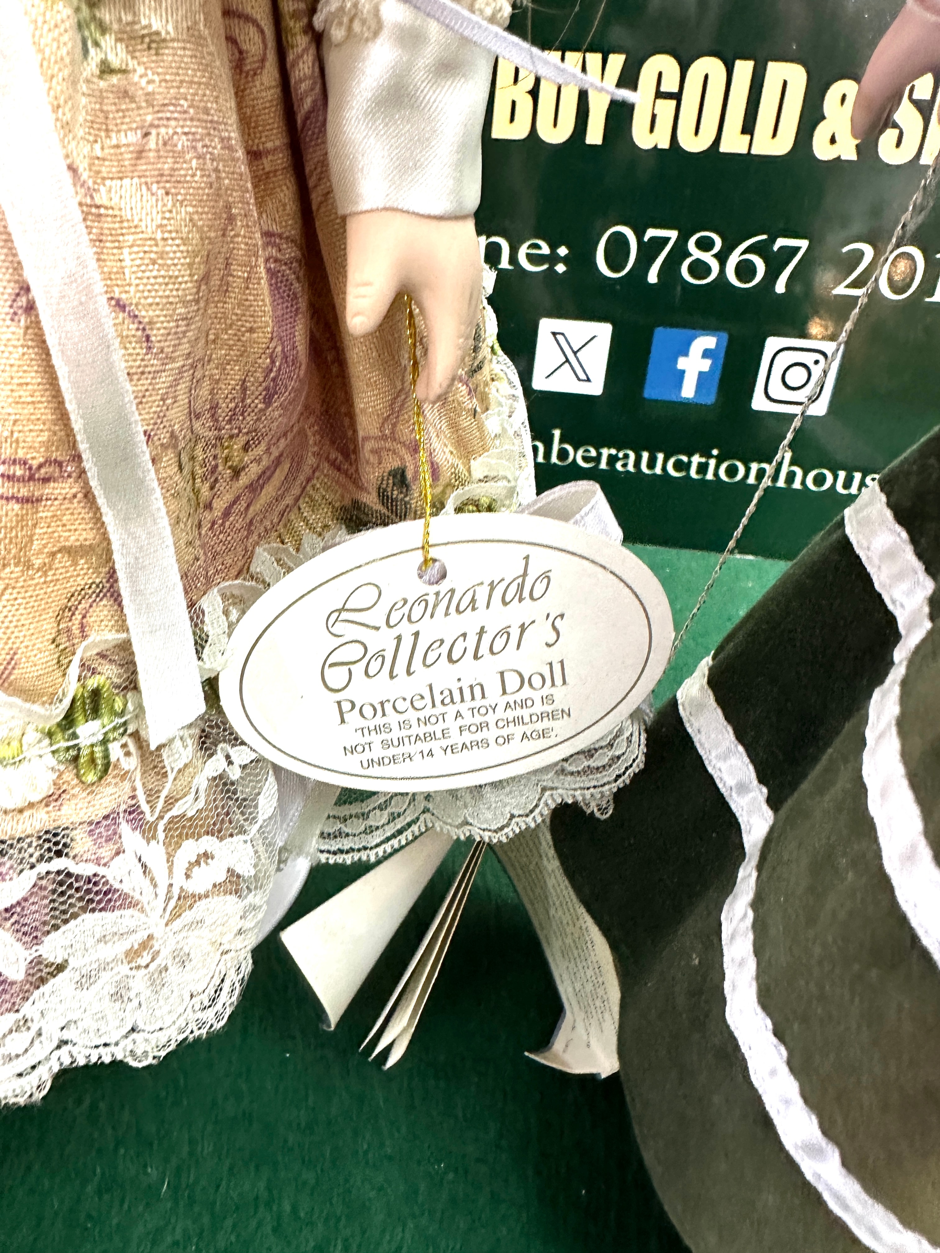 A pair of antique-inspired collector’s porcelain dolls. The doll on the right is identified as from The Heritage Mint Ltd.® Collection, Made in Taiwan. It features a porcelain-like head with blue eyes and long dark brown curly hair, dressed in a pink blouse with lace accents over a dark olive-green skirt with white striped trim, and stands on a brown display base. The doll on the left is a Leonardo Collector’s Porcelain Doll, featuring a porcelain-like head with blue eyes and light brown curly hair, wearing an elaborate cream and pink floral patterned dress adorned with lace and ribbons, and stands on a white display base. Its tag notes “THIS IS NOT A TOY AND IS NOT SUITABLE FOR CHILDREN UNDER 14 YEARS OF AGE.”