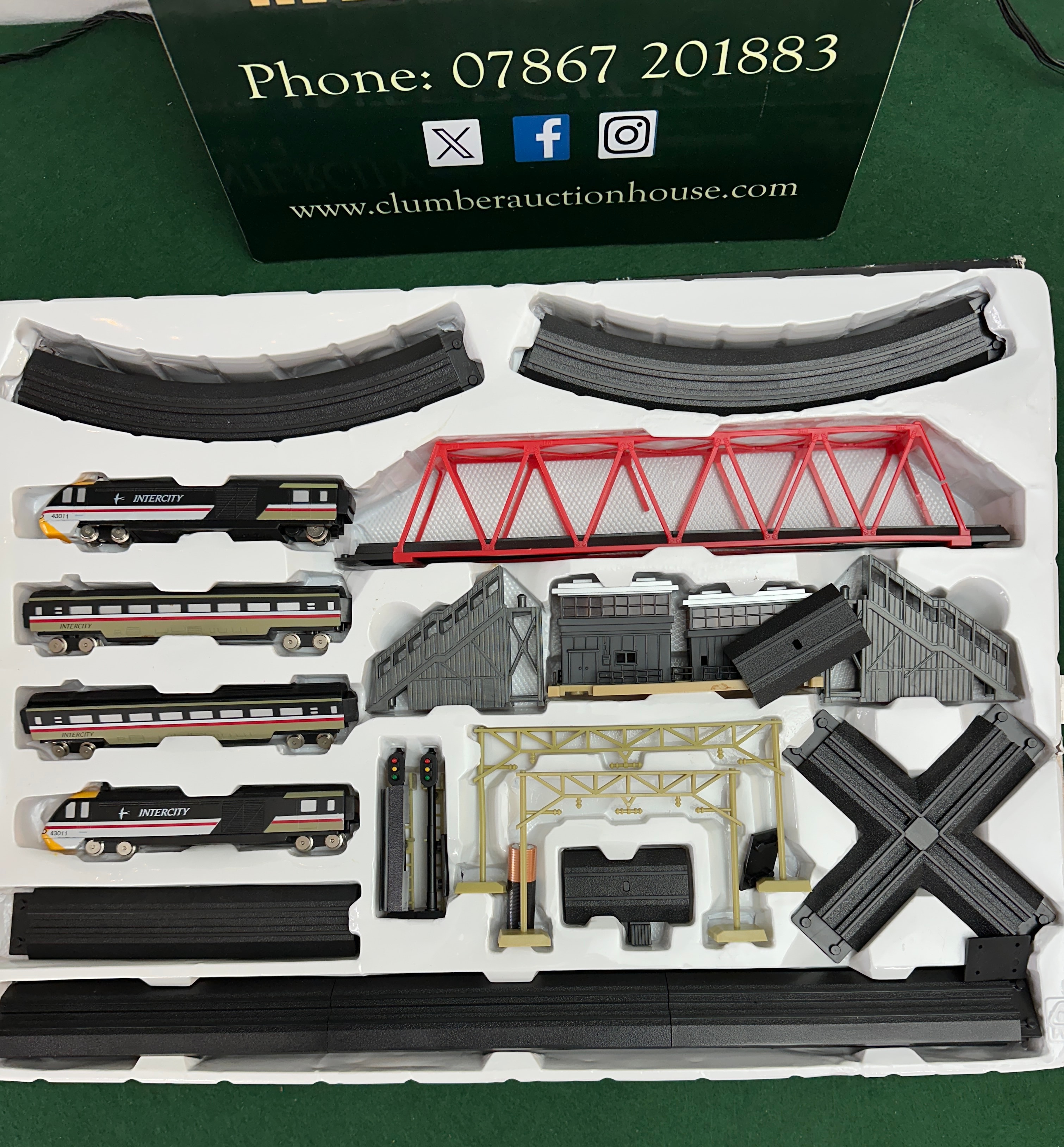 A Peterkin Technic Intercity Series 4 N Gauge train set, presented new-in-box in its original retail packaging. The set includes a locomotive, three passenger cars, ten straight track sections, ten curved track sections, a crossover track, a control tower, a bridge section, two signal poles, two overhead electricity gantries, and a stop track section, as detailed on the box. The components are primarily plastic with some metal elements. The set provides a total track length of 516cm (203″).