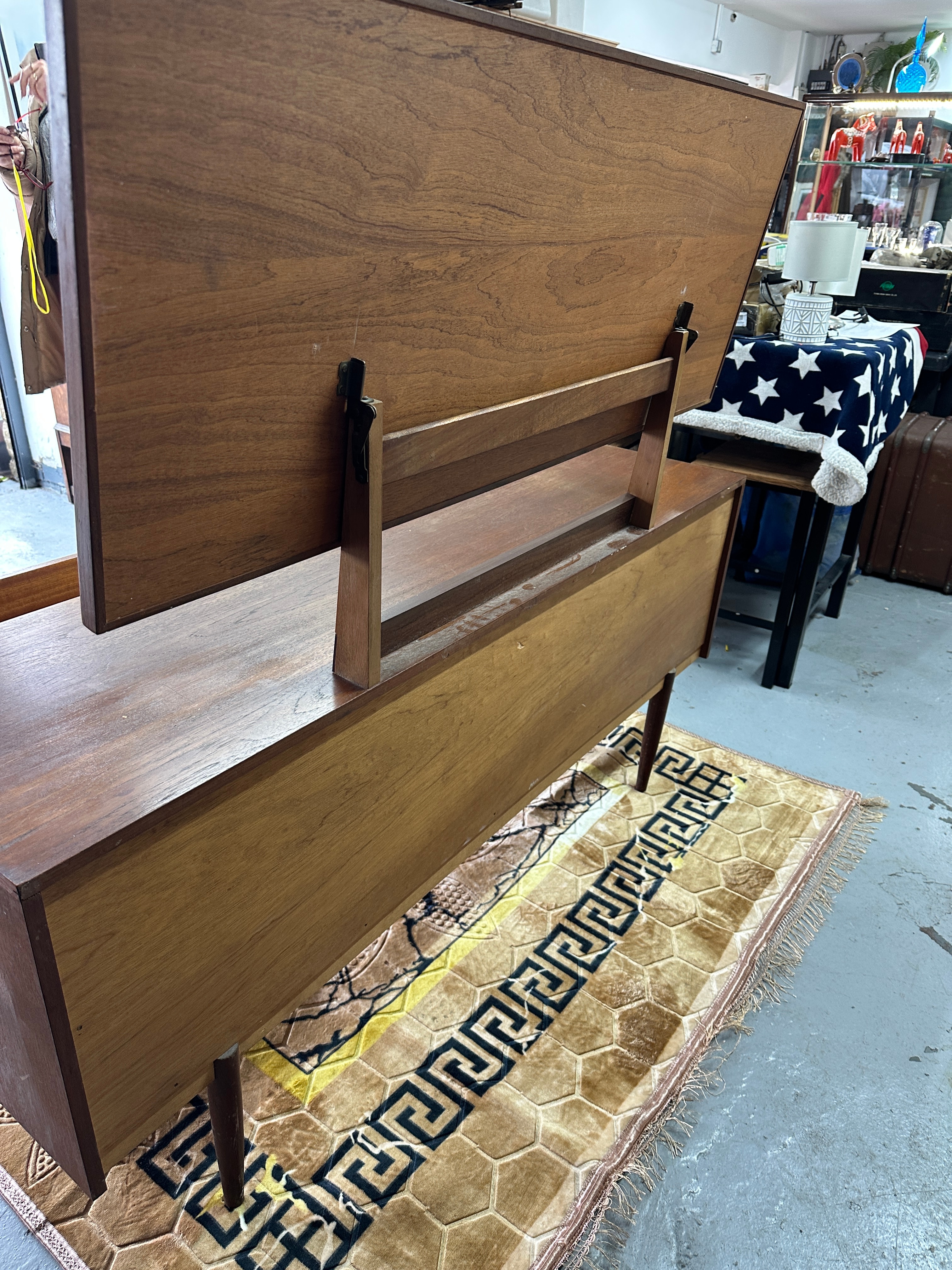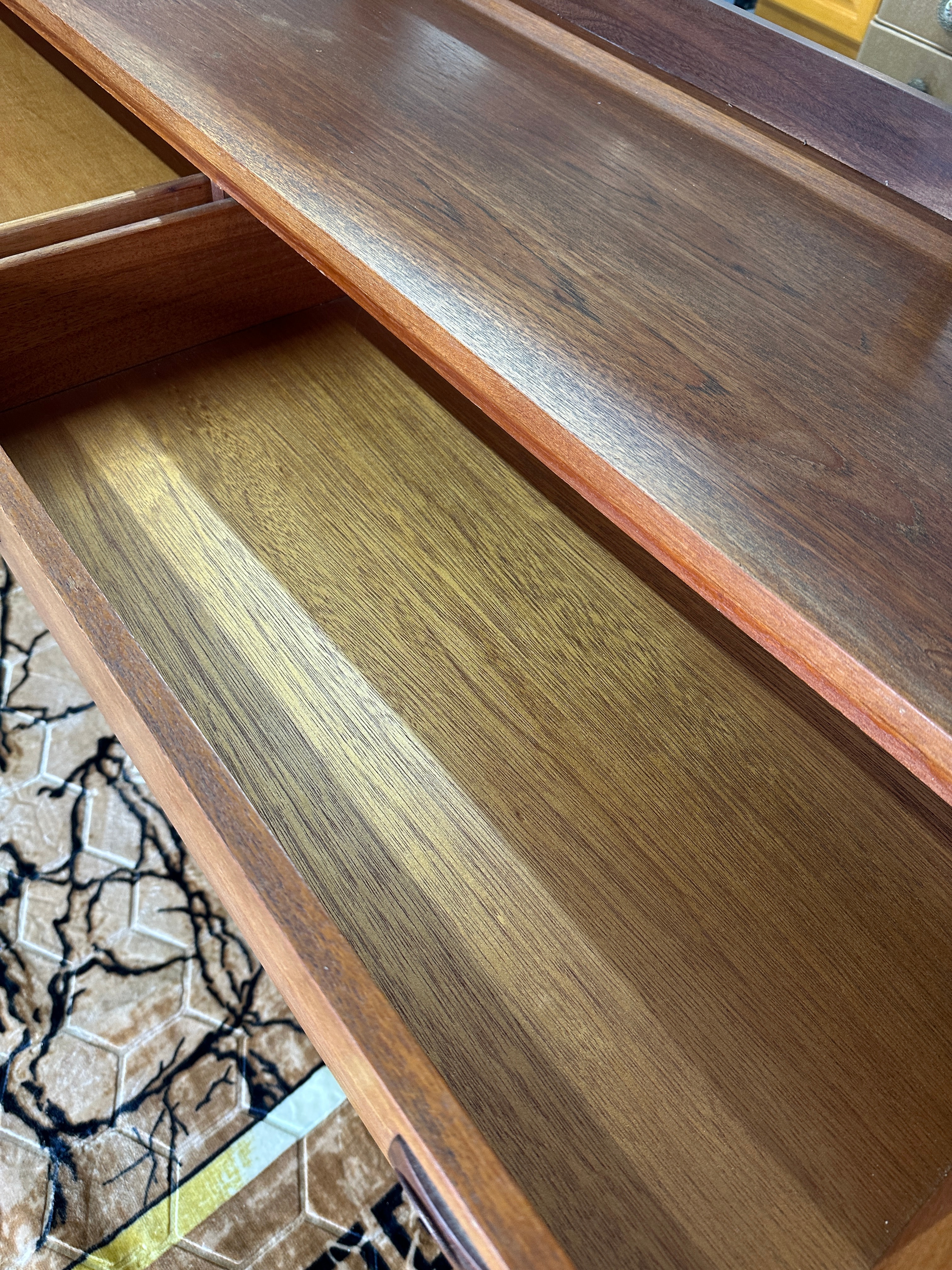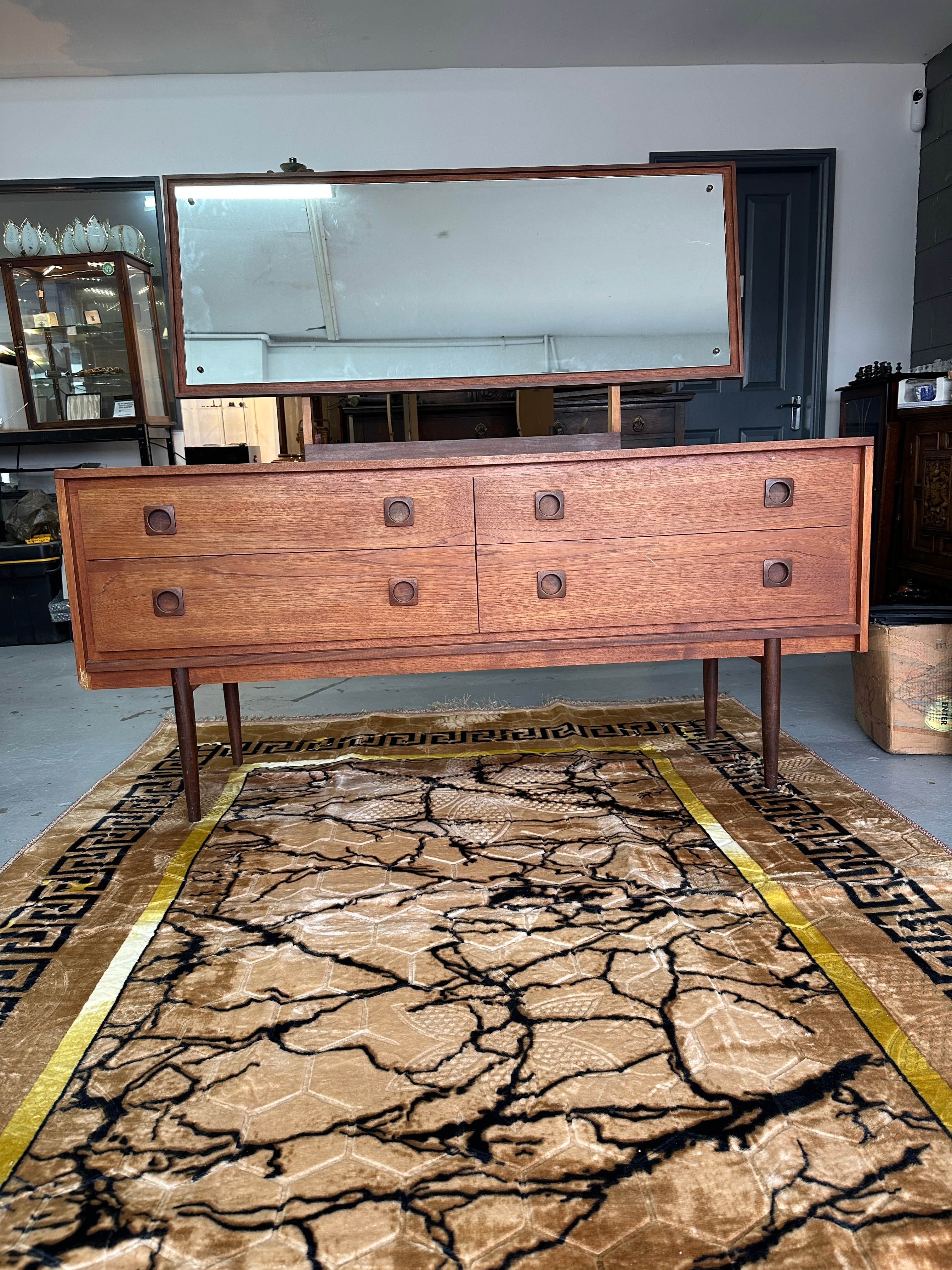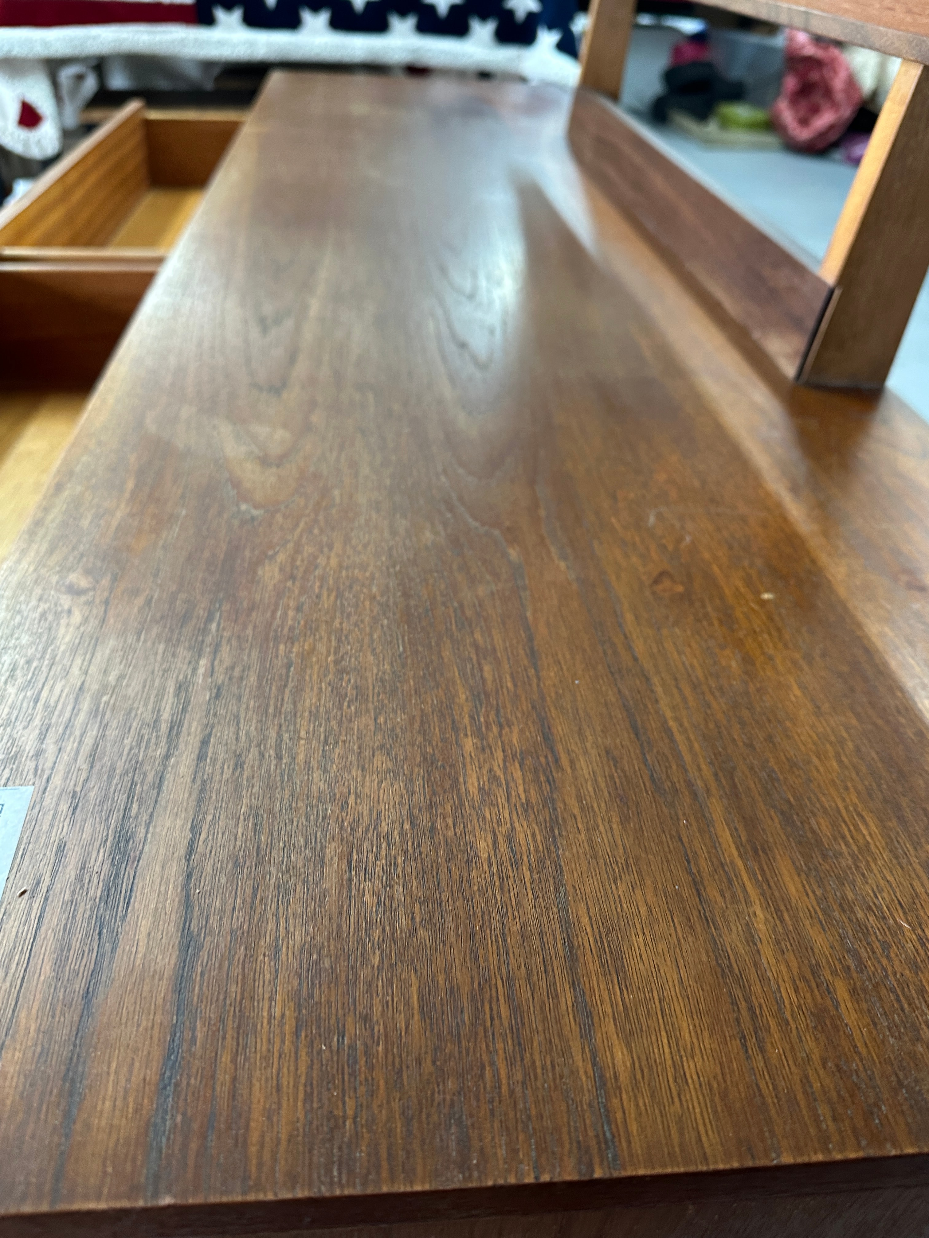 A Danish Modern dressing table attributed to Brouer, circa 1960s. The main unit is constructed from a reddish-brown hardwood, consistent with teak, exhibiting a prominent grain. It features a rectangular top surface with a shallow recessed area, and four drawers arranged in two columns of two. Each drawer is fitted with distinctive recessed square-shaped wooden pulls. The unit stands on four slender, round, tapered wooden legs. An accompanying rectangular mirror, framed in matching wood, is supported on the back of the unit by two adjustable wooden arms.