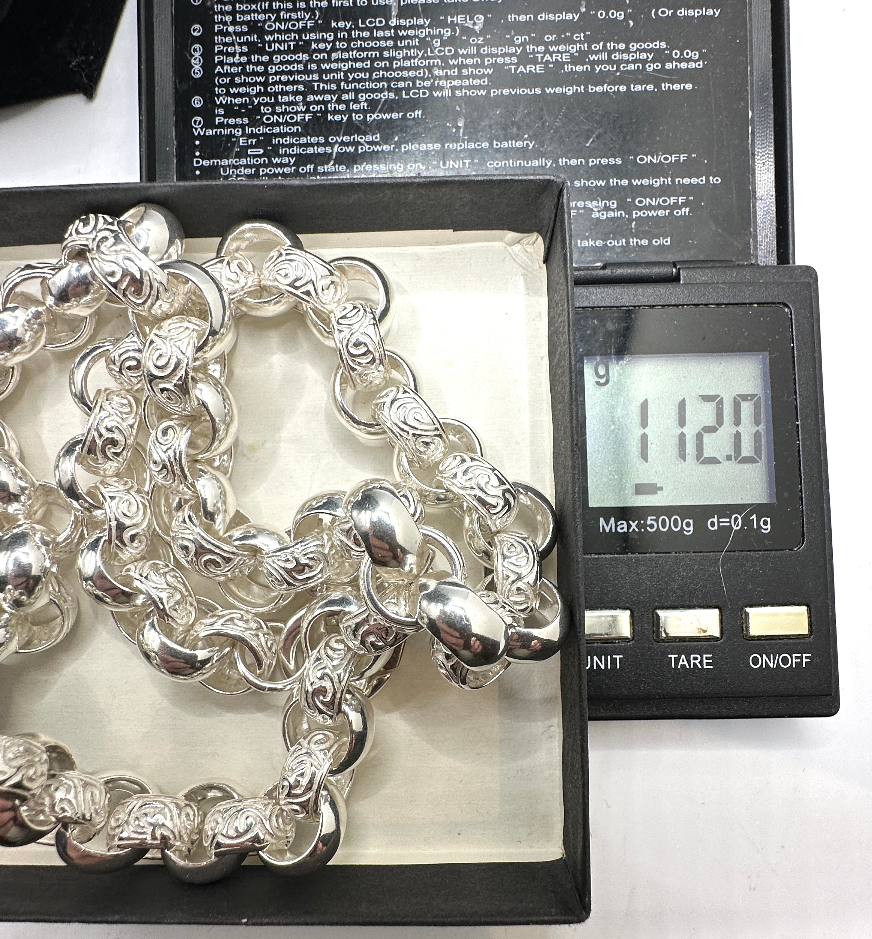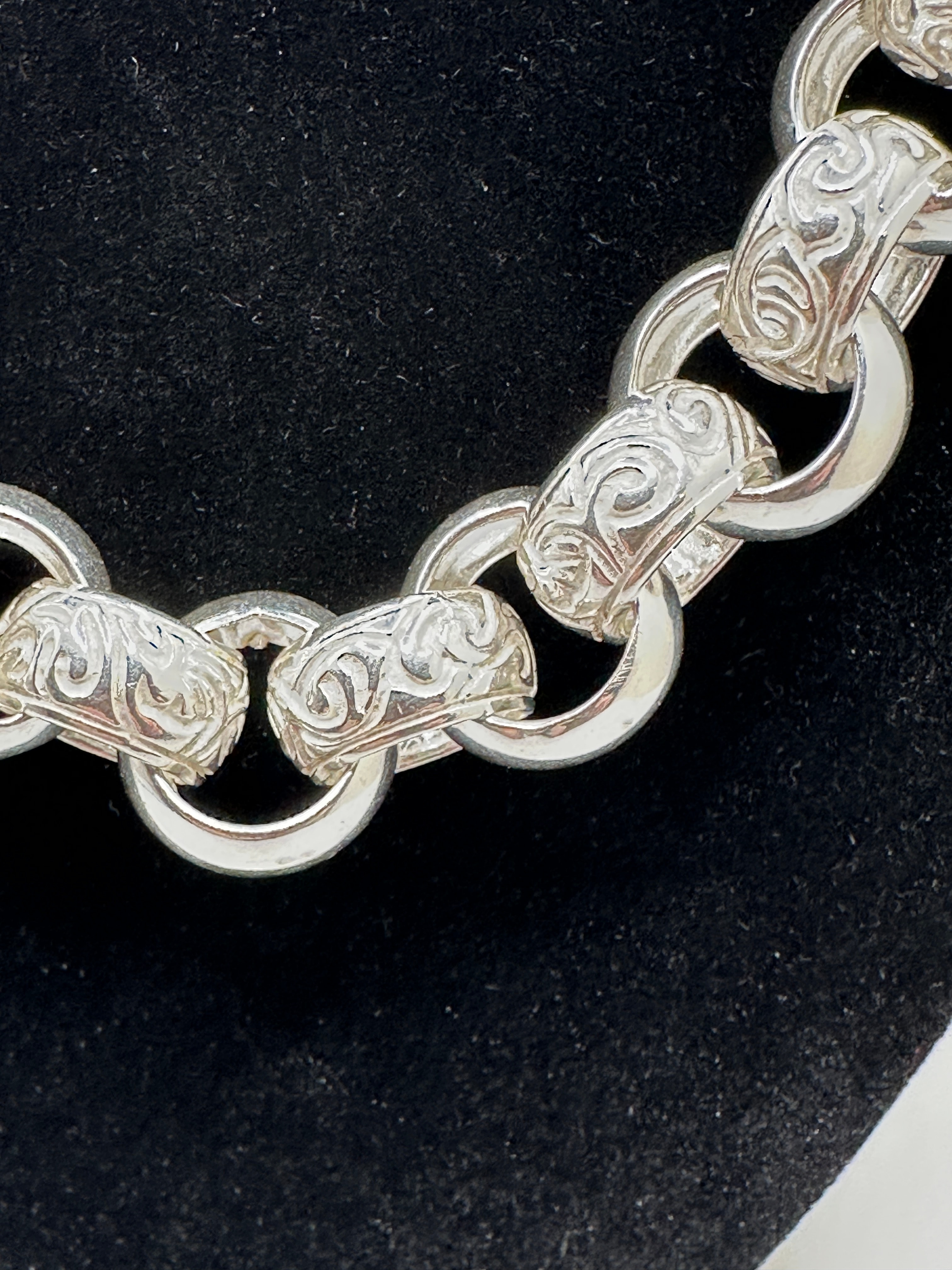 A 925 silver belcher chain necklace, constructed from substantial rolo-style links. The links alternate between smooth, polished sections and sections intricately decorated with a recurring scrollwork or foliate relief pattern. The necklace is secured by a lobster clasp, bearing a ‘925’ hallmark.