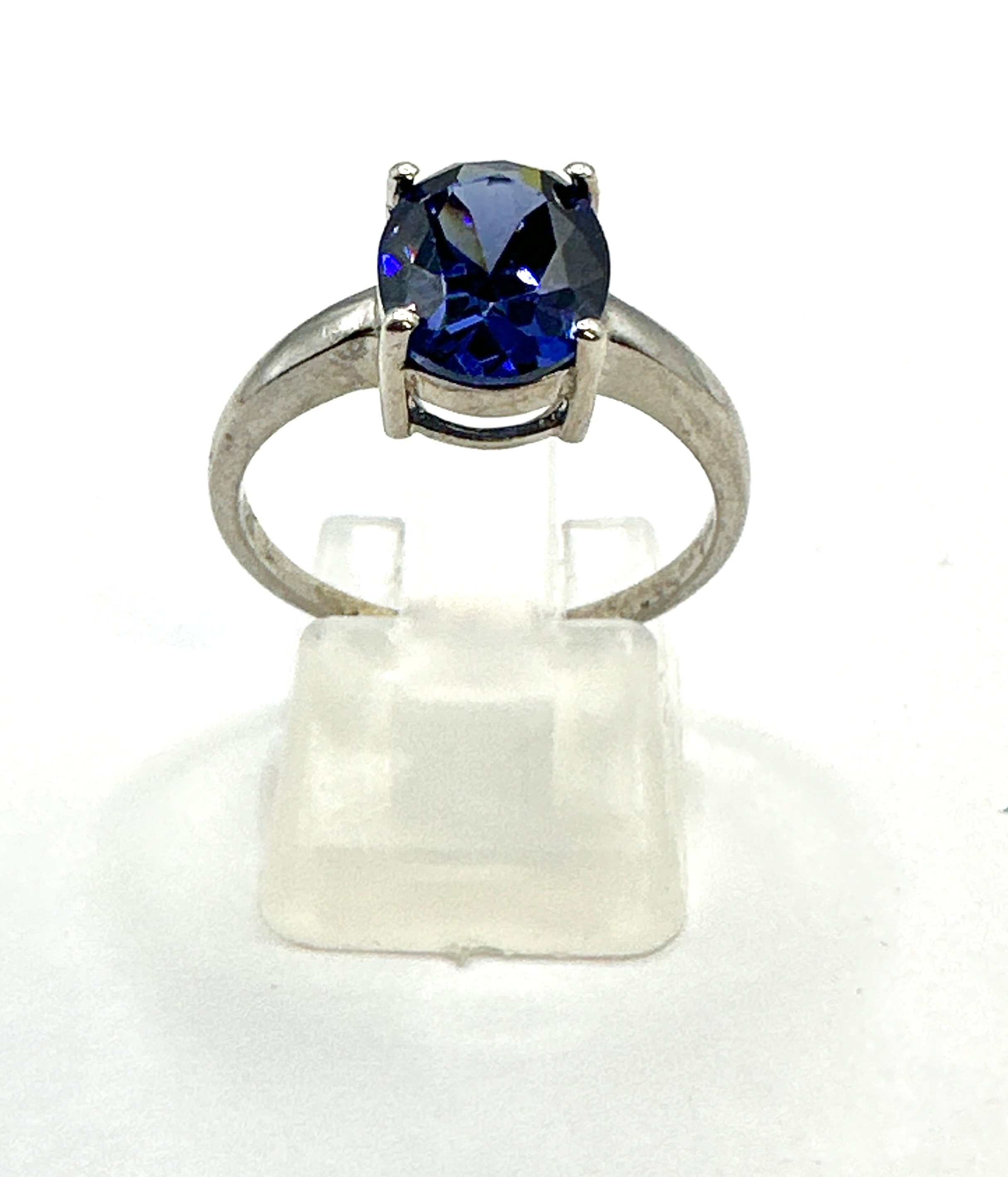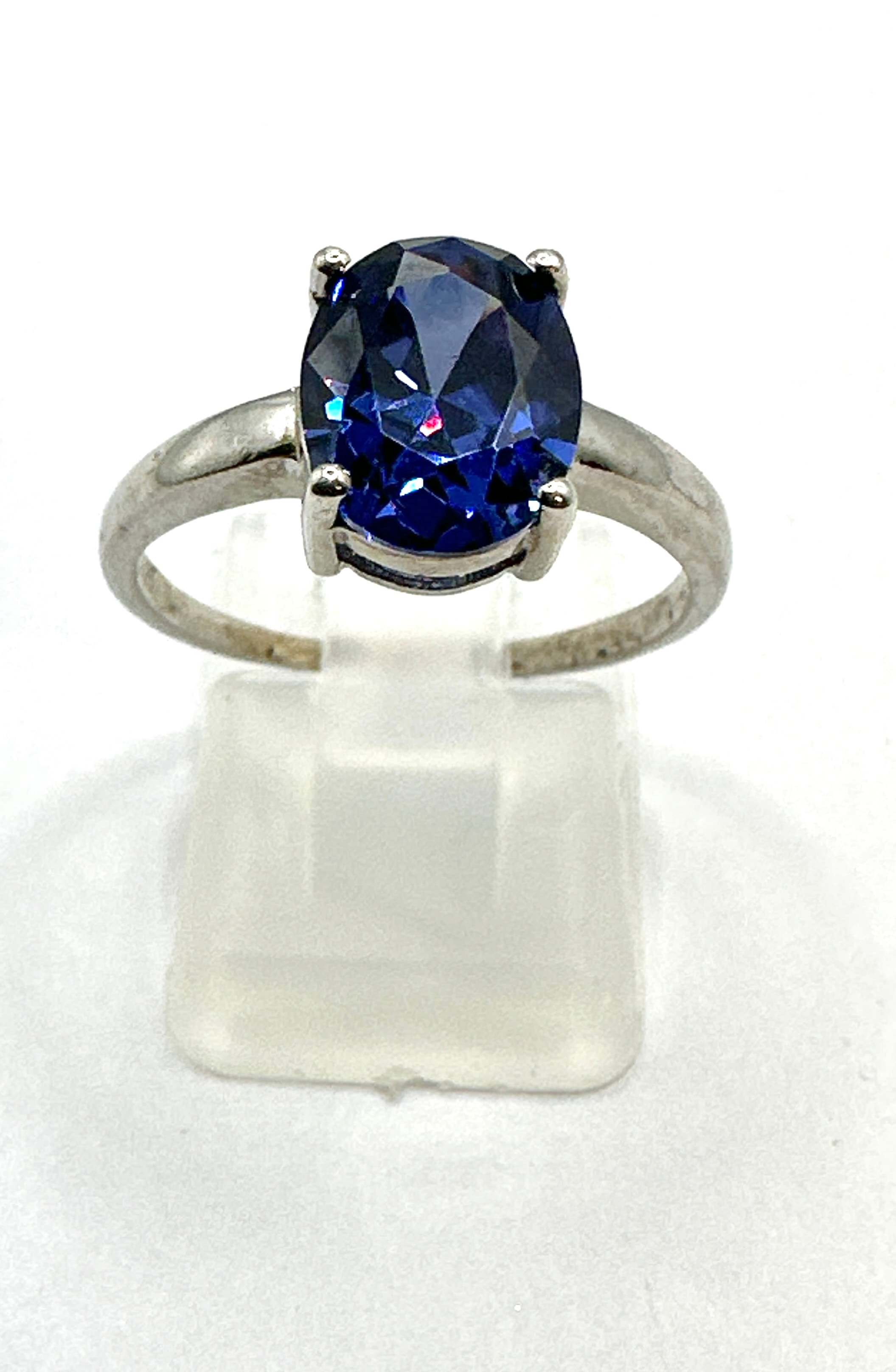 A 925 silver solitaire ring featuring a prominent oval-cut, dark blue to violet-blue gemstone set in a four-prong style. The band is simple and unadorned.