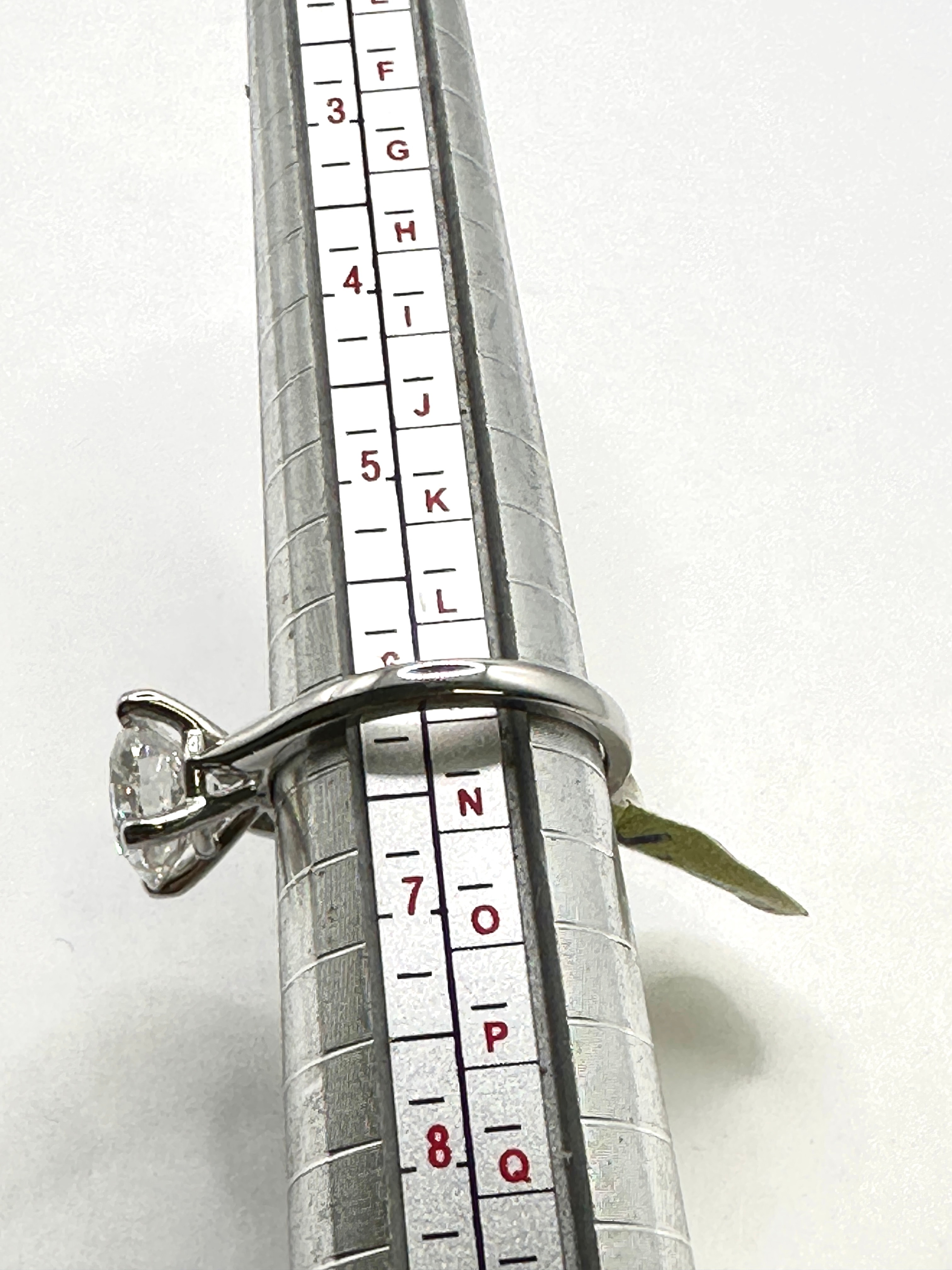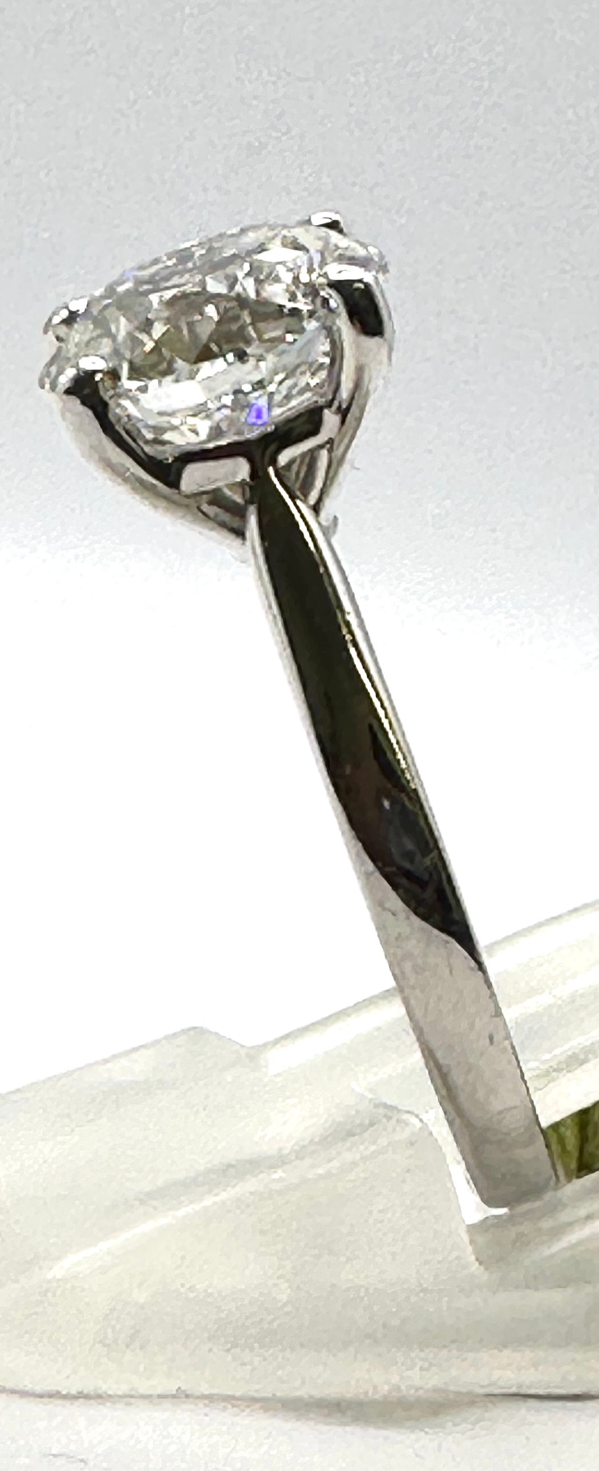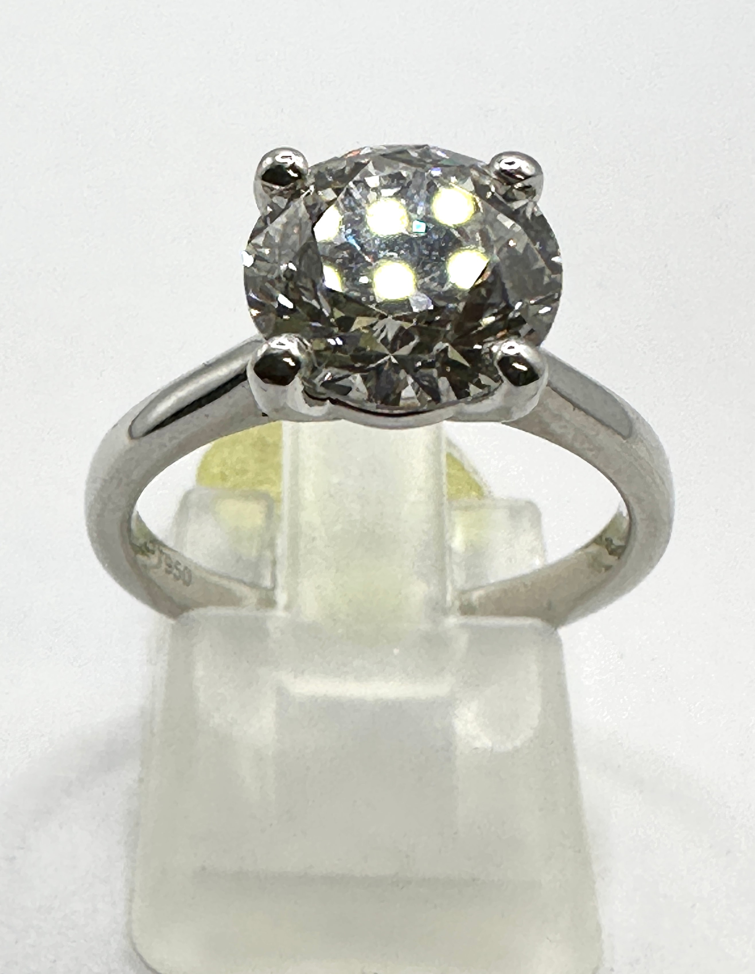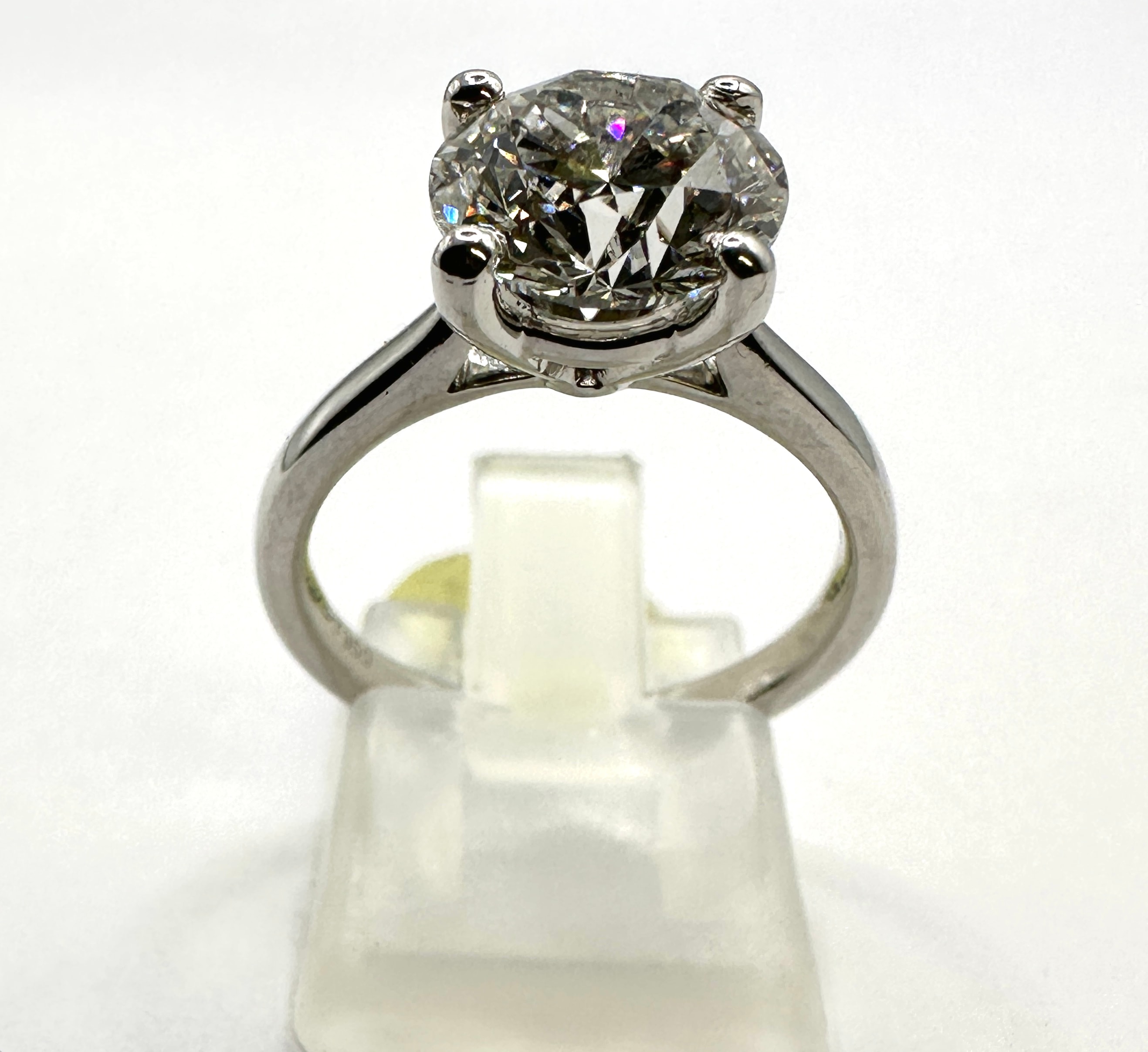 A modern classic solitaire ring featuring a 3 carat round brilliant lab diamond, set in a Platinum four-prong basket mounting. The substantial lab diamond exhibits strong fire and scintillation. The band is crafted from polished Platinum.