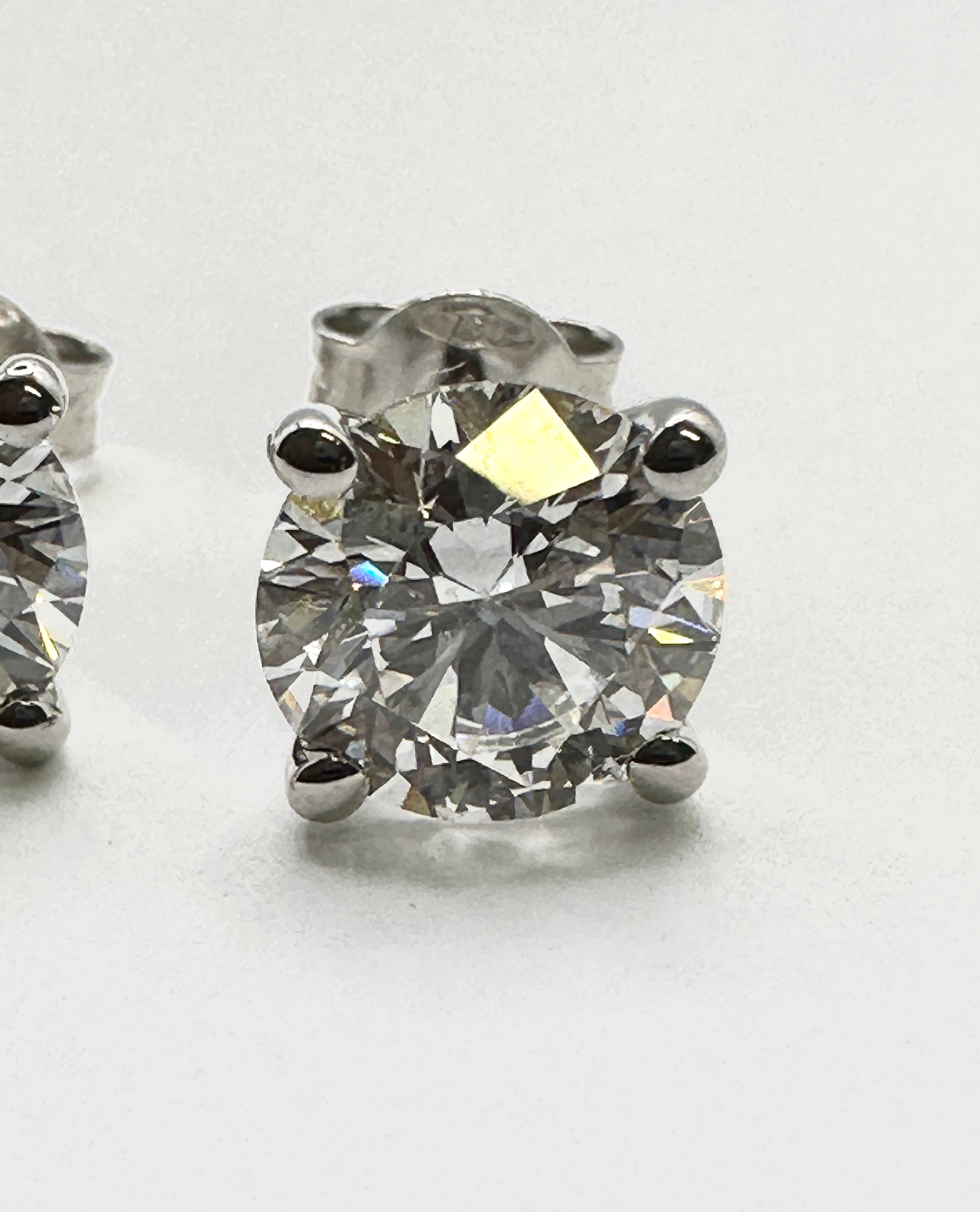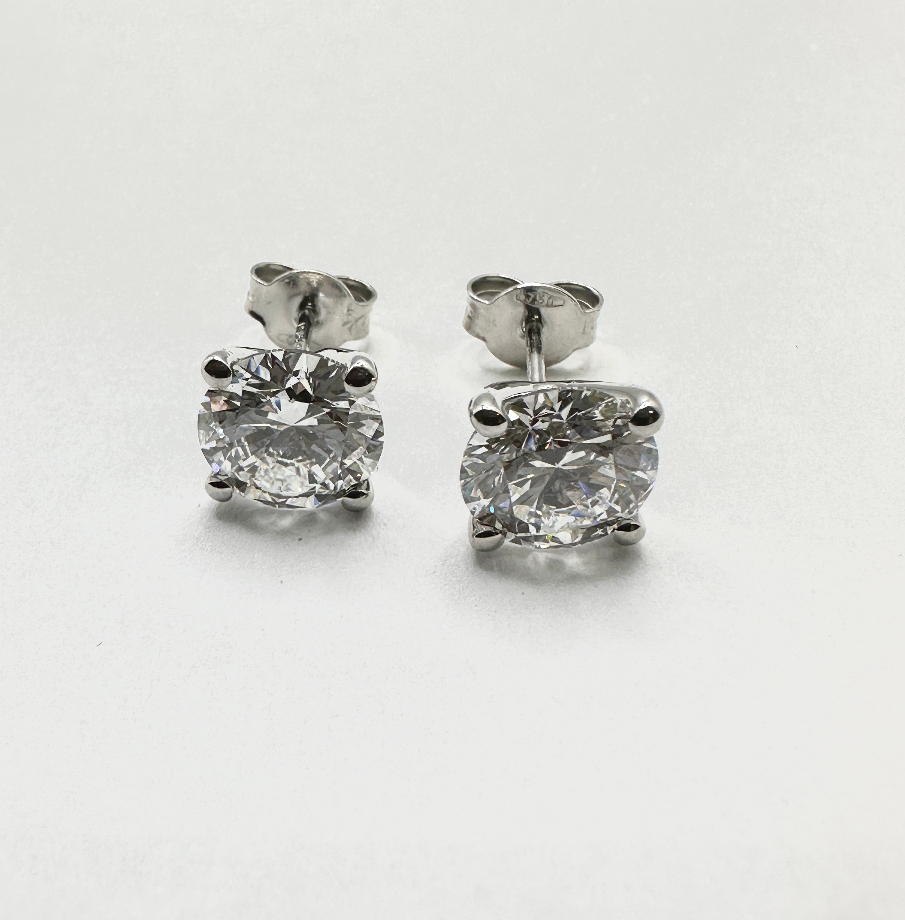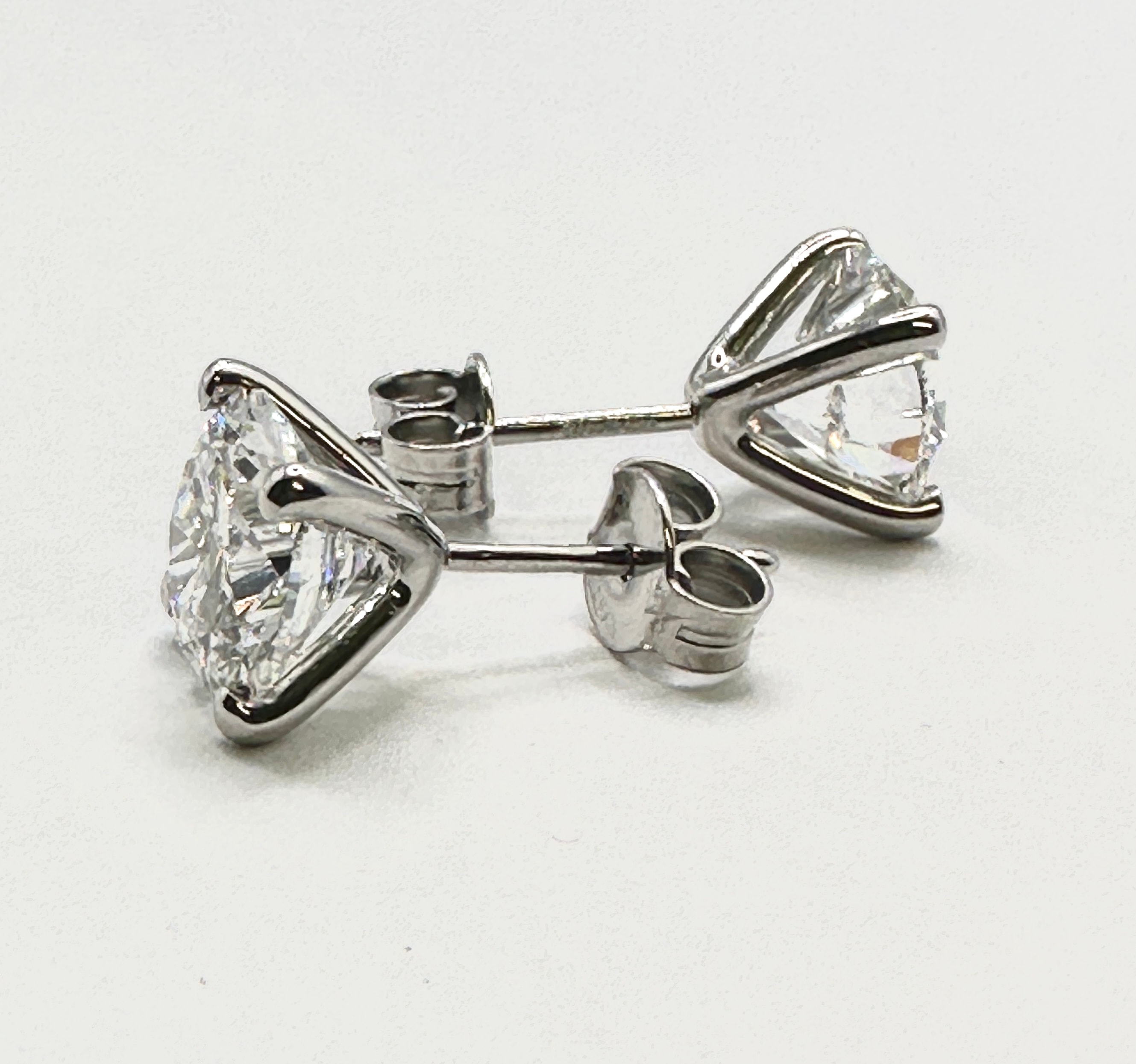 A pair of 18k gold lab diamond stud earrings. Each earring features a single, round, colorless lab diamond of approximately 2 carats, set in a classic four-prong basket setting, with a total carat weight of 4 carats for the pair. The earrings are secured with posts and butterfly backs. The stones exhibit significant brilliance.