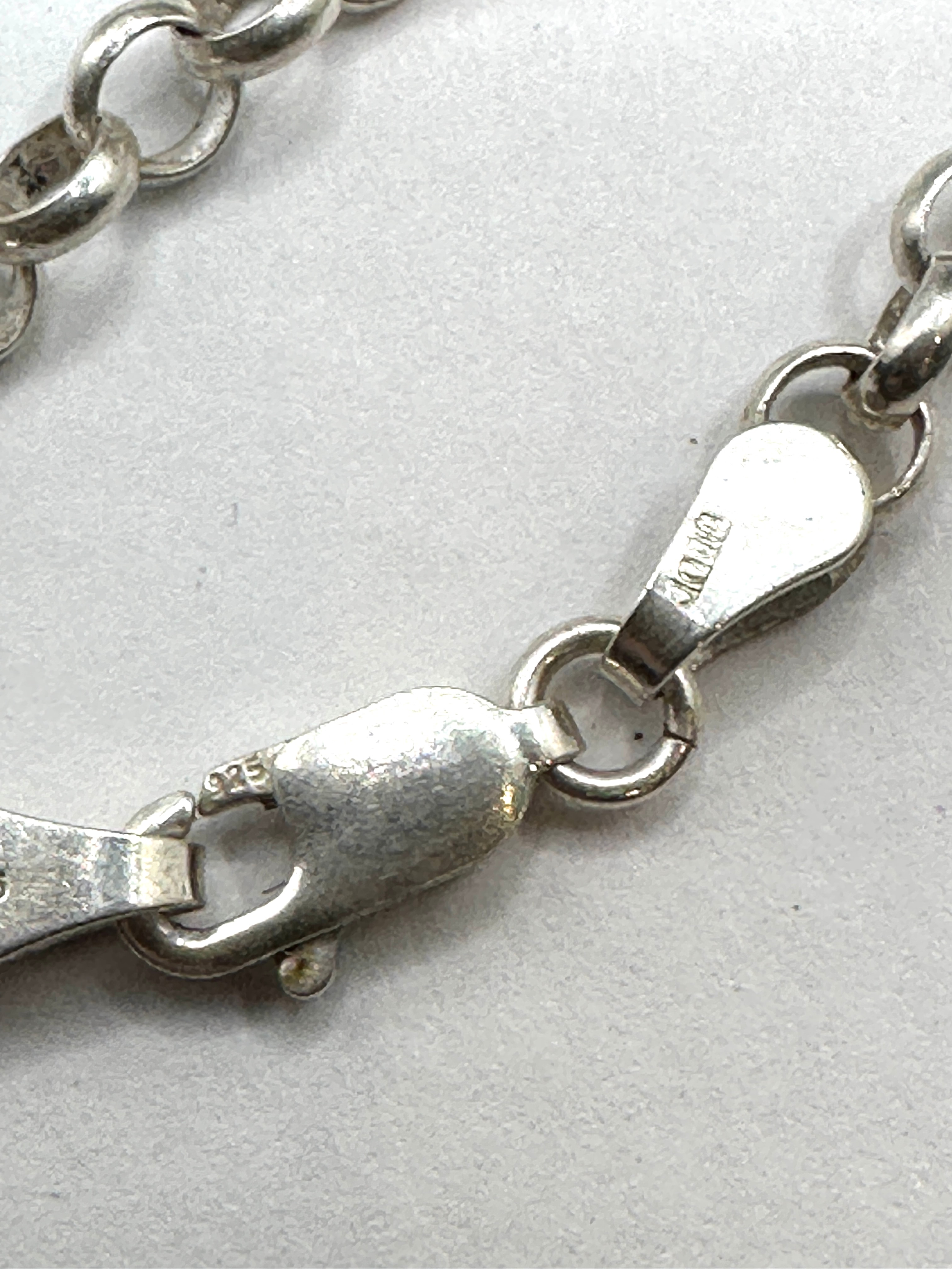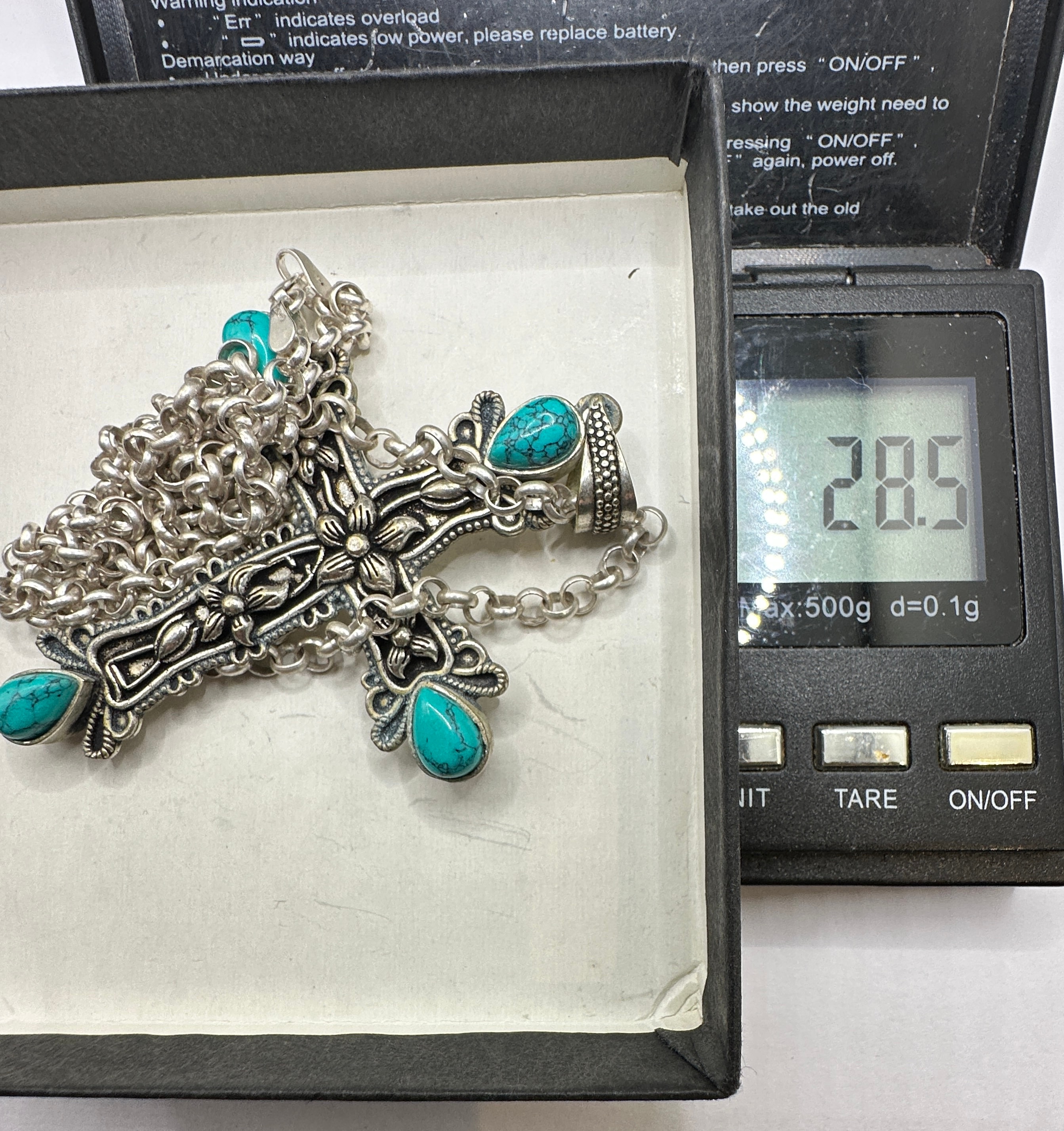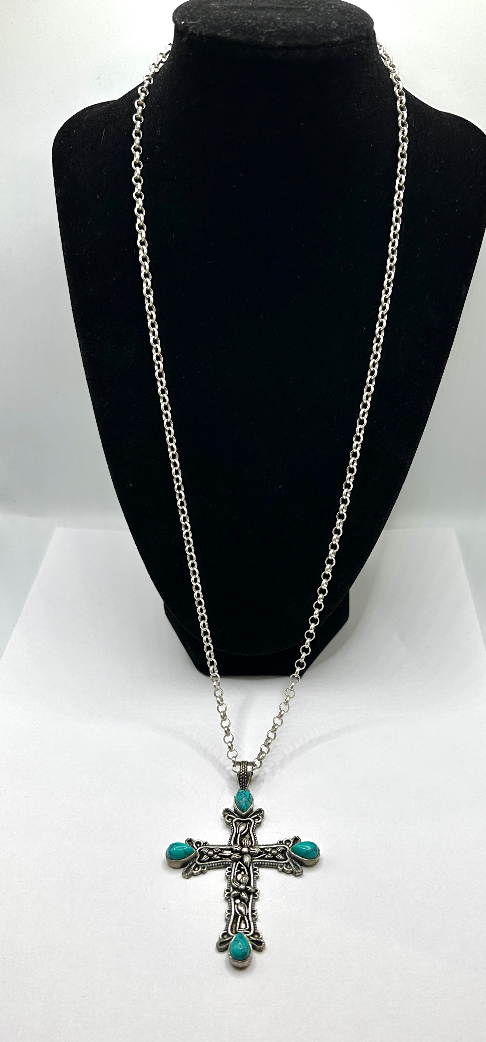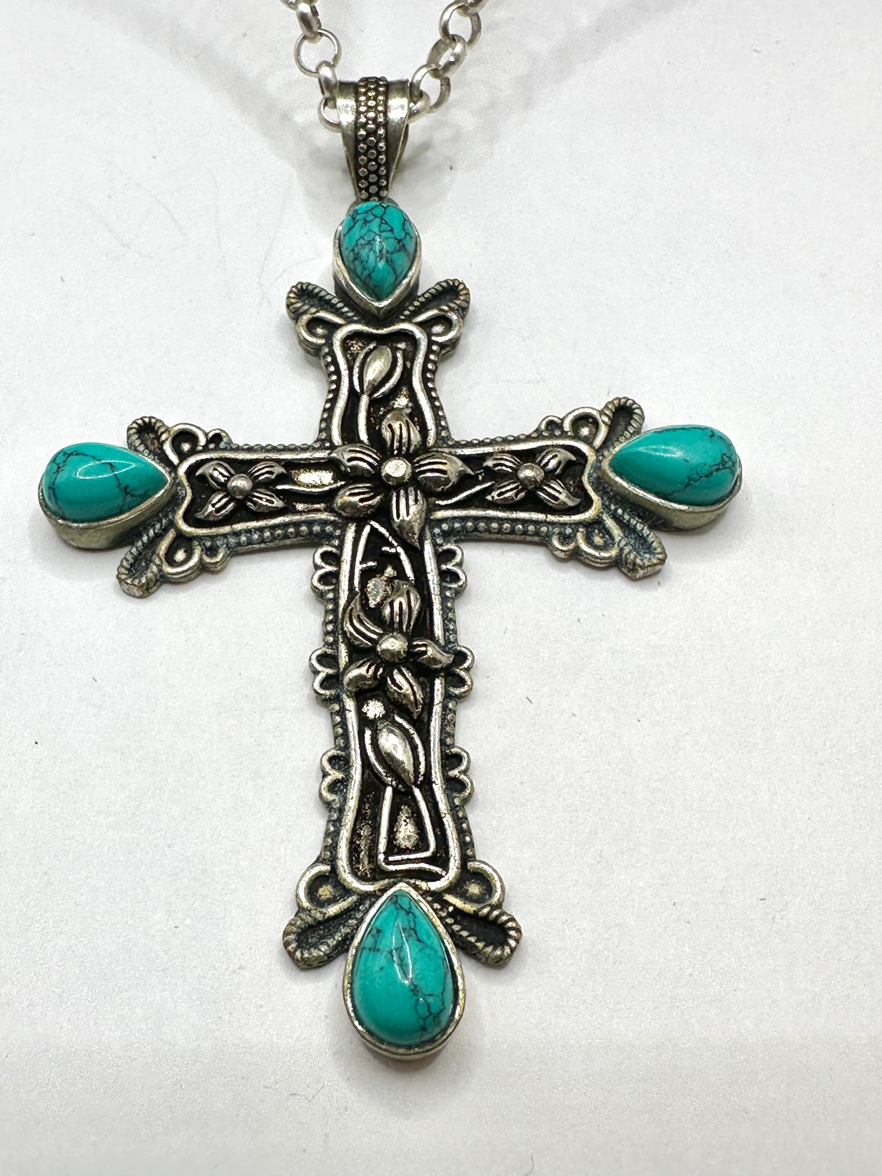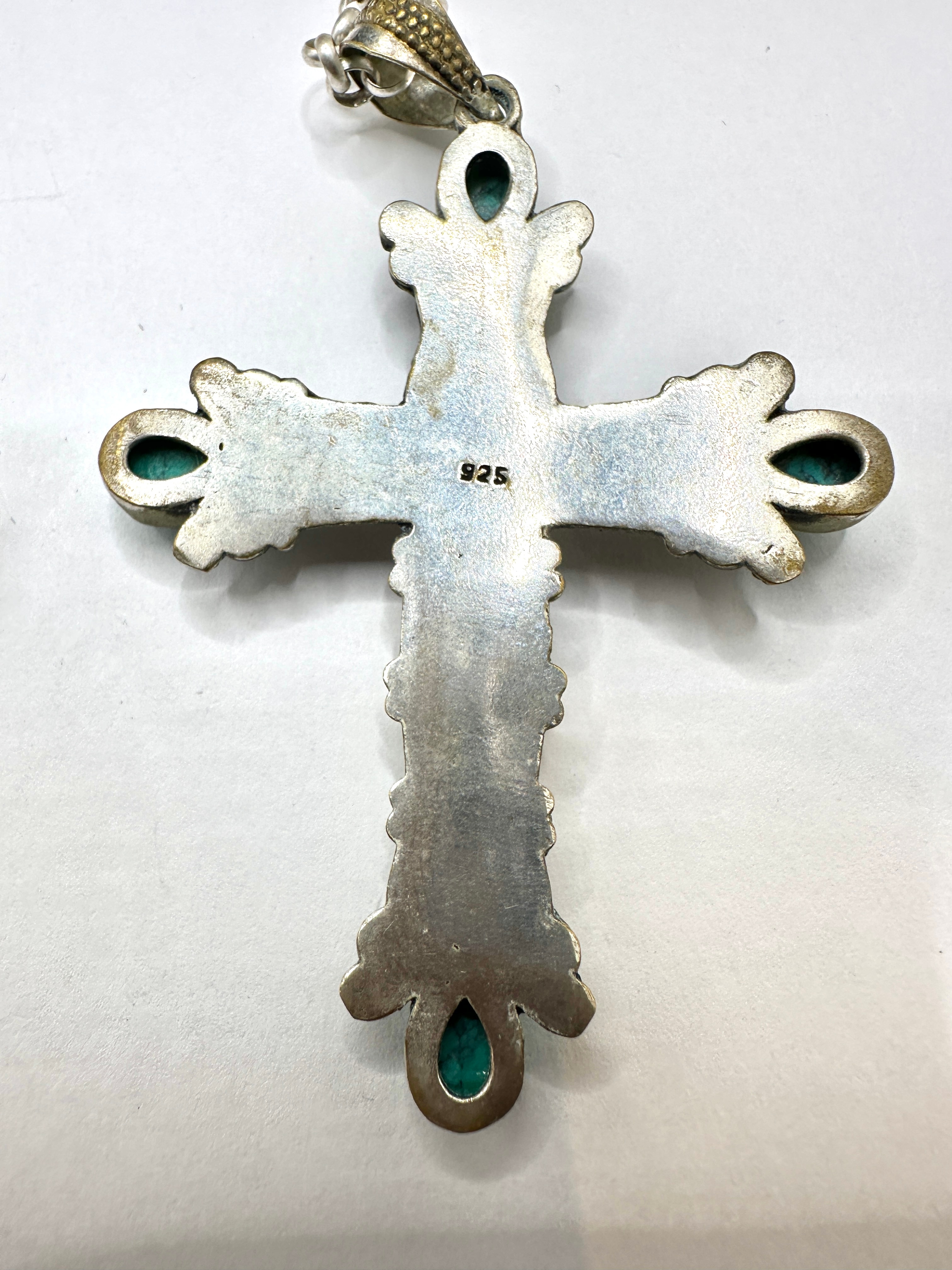 A sterling silver necklace featuring an ornate cross pendant set with five turquoise-colored cabochon stones. The pendant and rolo-style chain both display an intentional antiqued or oxidized finish, enhancing the detailed floral and scrollwork motifs on the cross. The lobster clasp is clearly marked “925” for sterling silver and “CHINA” for its country of manufacture, with an additional “925” mark visible on the reverse of the cross pendant. The item is confirmed to be crafted from 925 silver.