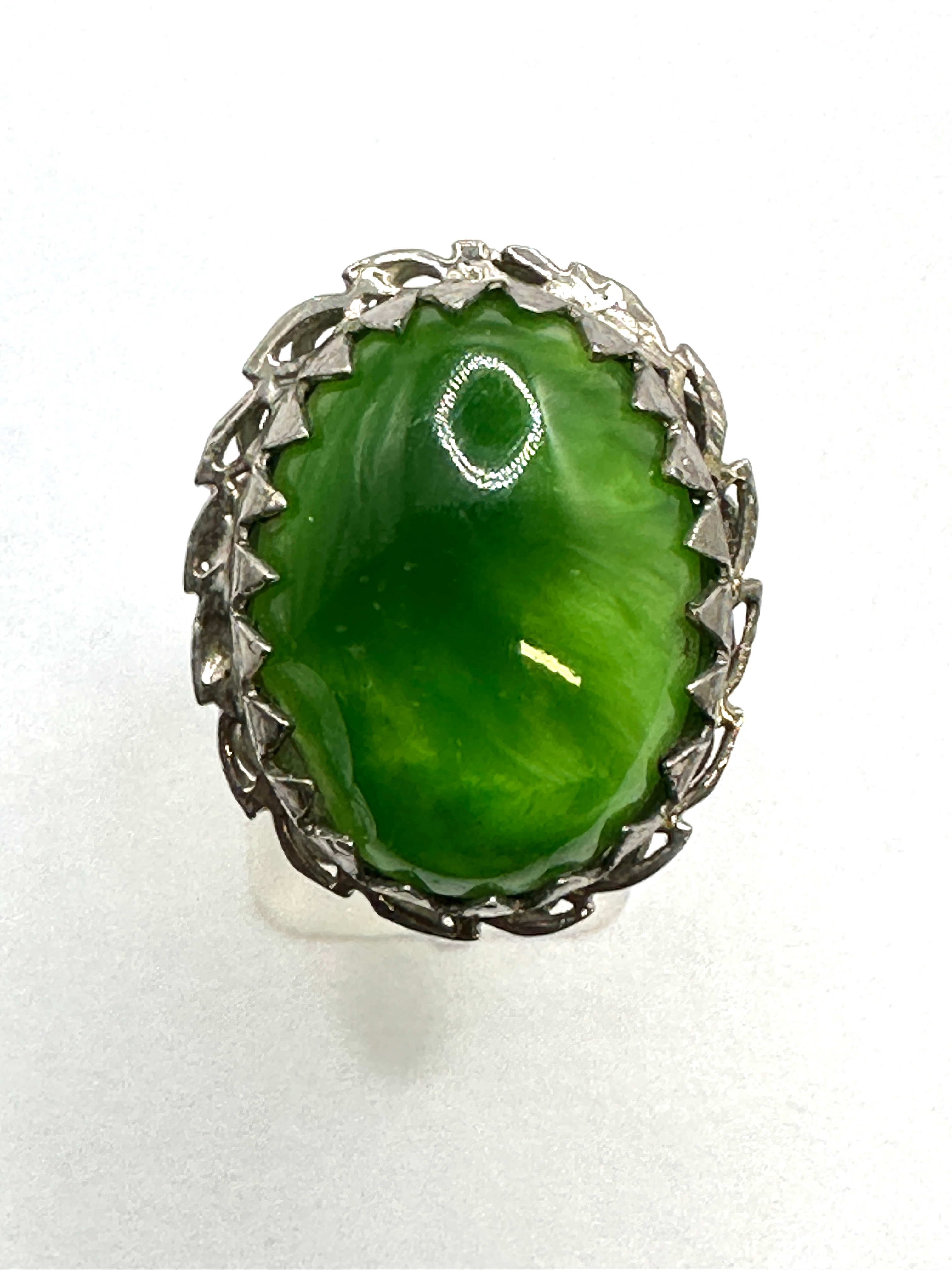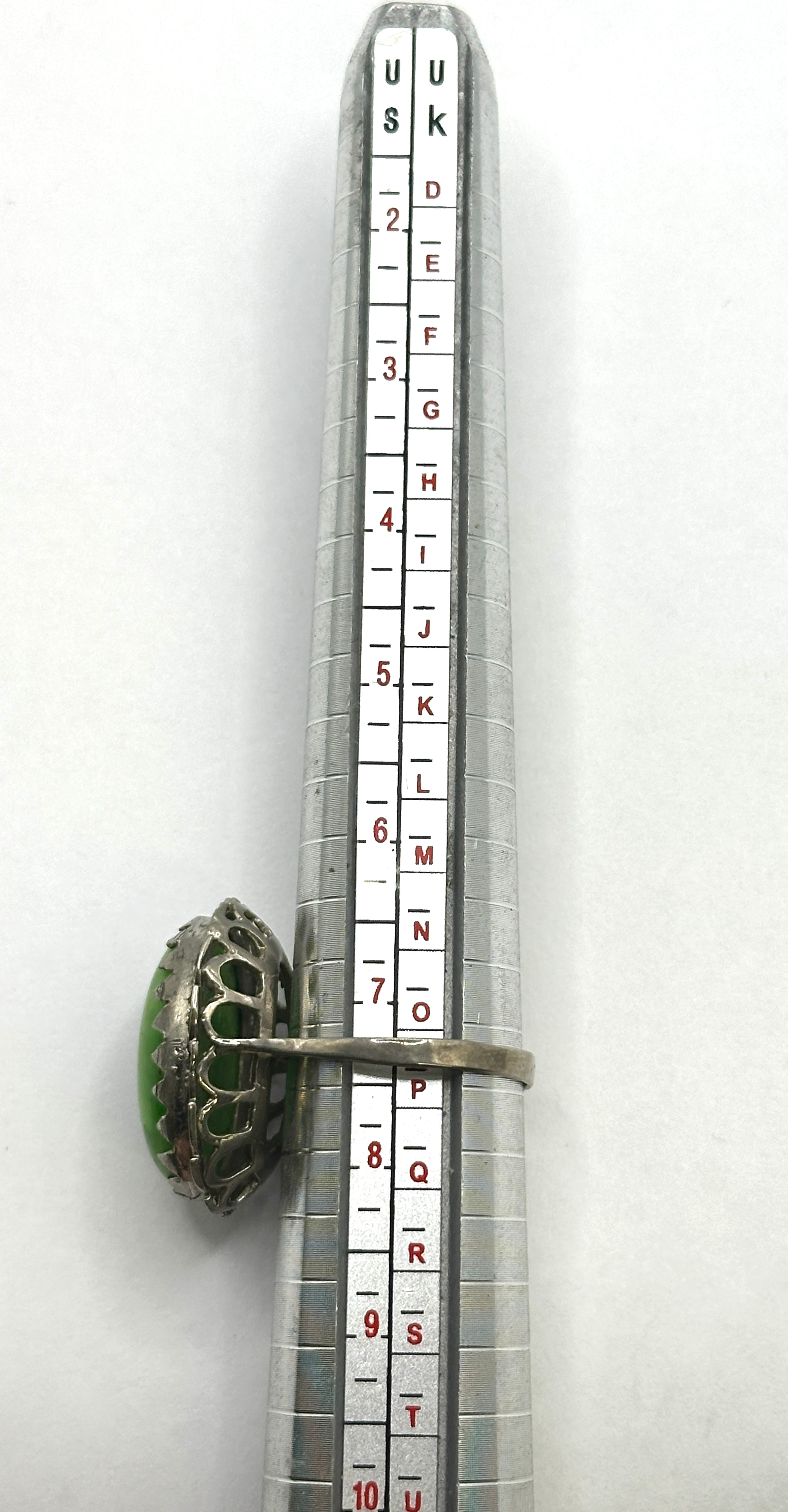 An ornate 925 silver ring featuring a prominent oval cabochon-cut Green stone. The stone exhibits mottled deep and light green coloration, appearing opaque to semi-translucent. It is secured in an ornate, scalloped bezel crafted from 925 silver, with a matching plain band. No specific hallmarks or text are discernible on the ring itself.