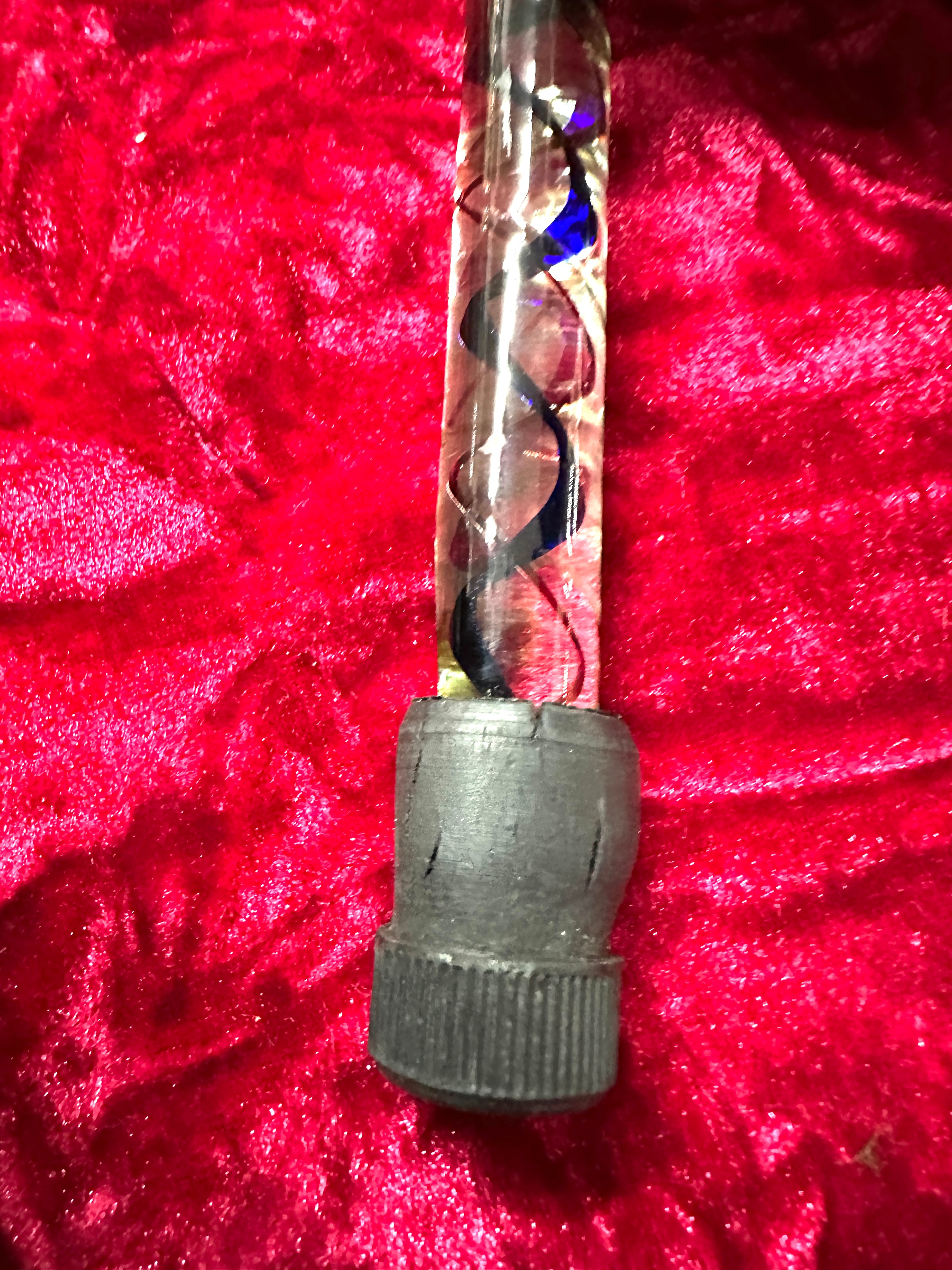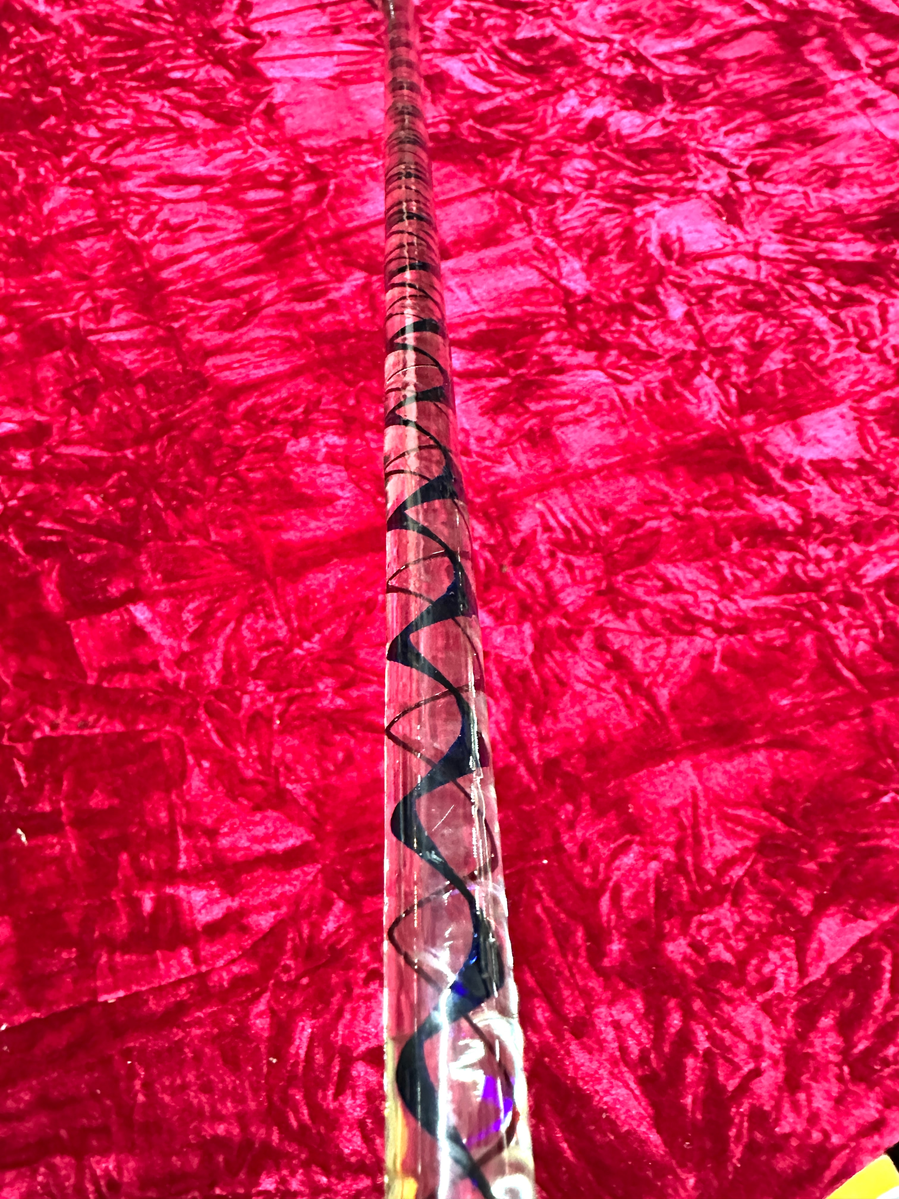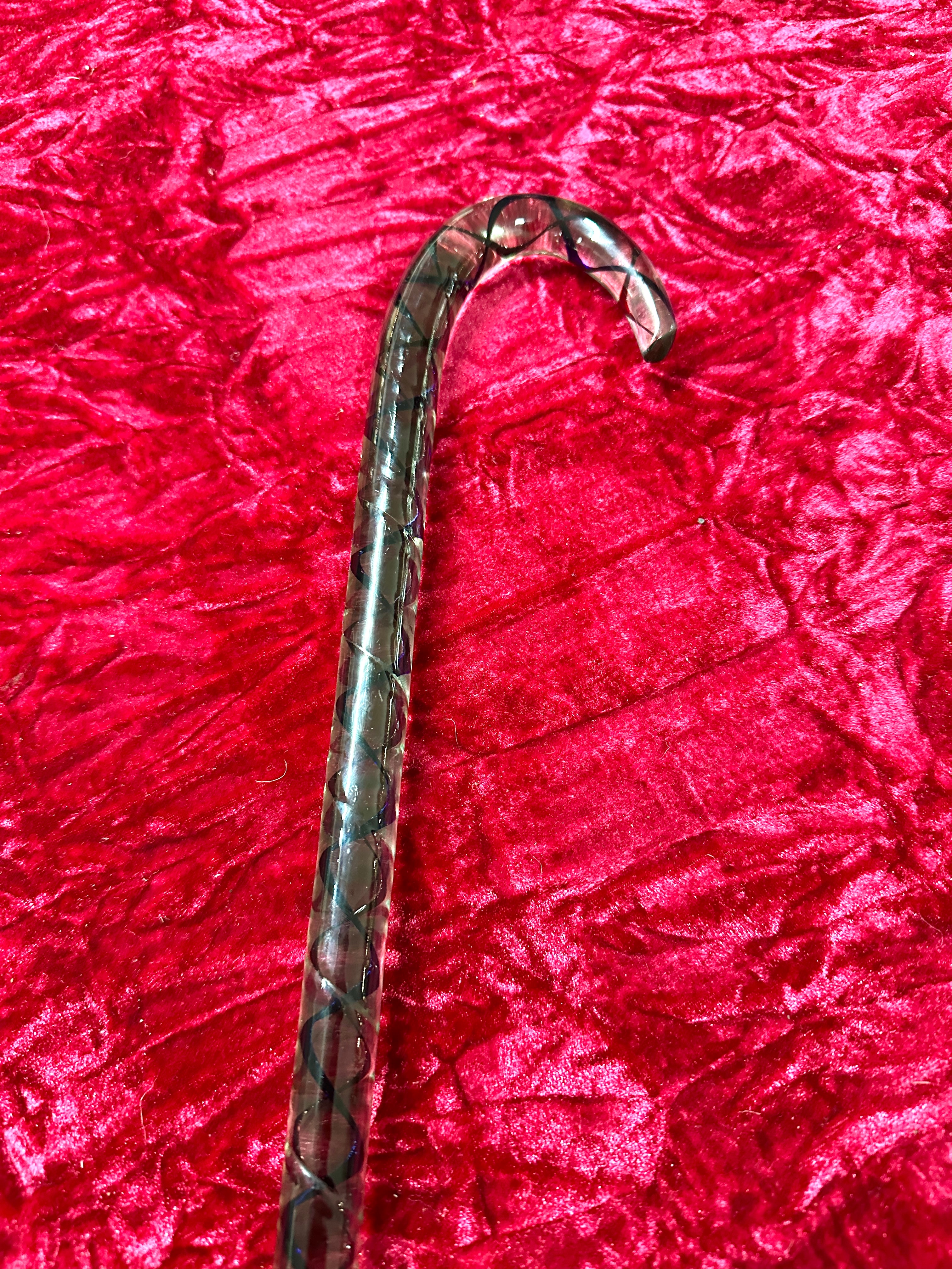 A contemporary walking stick or cane, crafted from clear glass or acrylic, featuring a curved shepherd’s crook handle. The transparent shaft encloses a distinctive internal dark-colored, possibly black or dark blue, helix or spiral design that extends throughout its length. Near the base of the shaft, the numerals “1994” are visibly embedded within the spiral, suggesting its period of creation. The cane is fitted with a black, likely rubber or plastic, ferrule at its base.