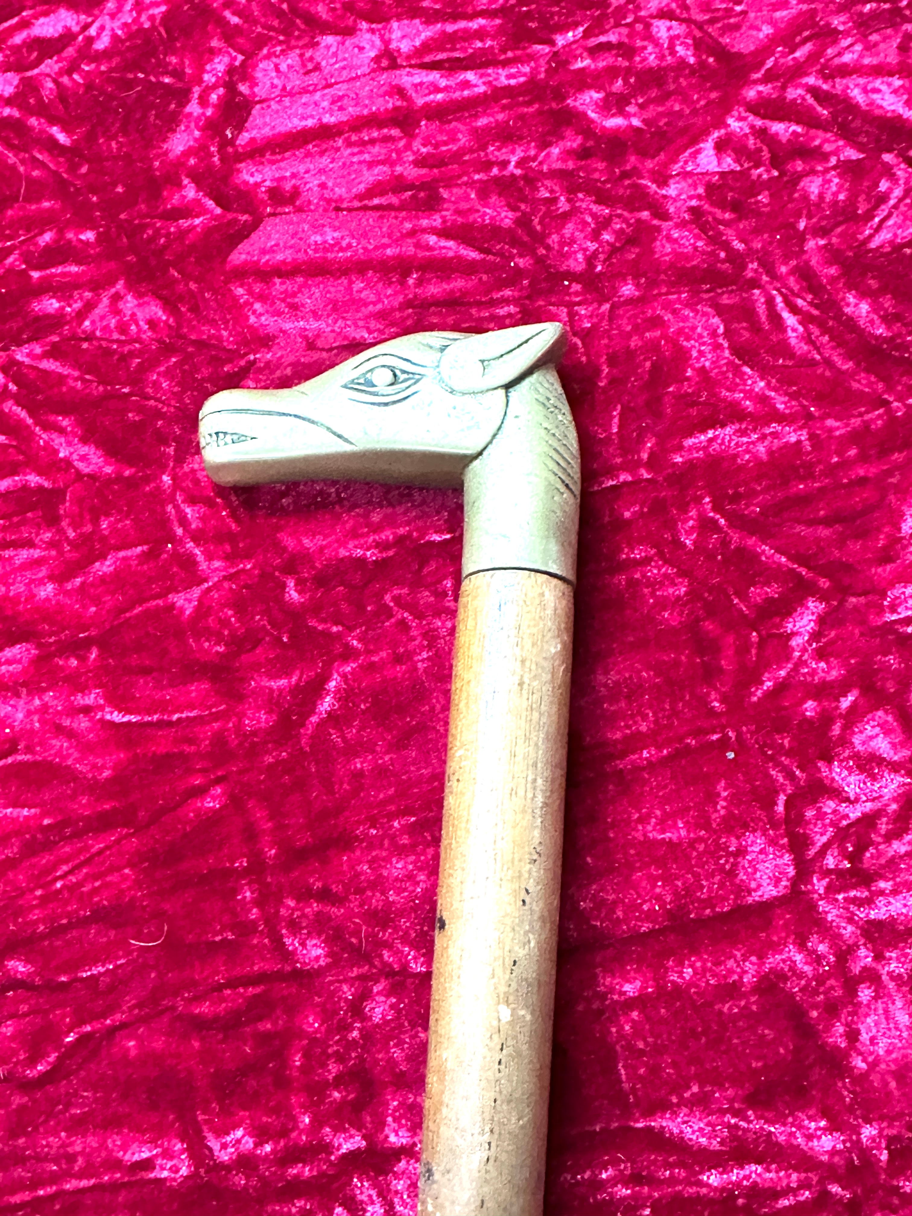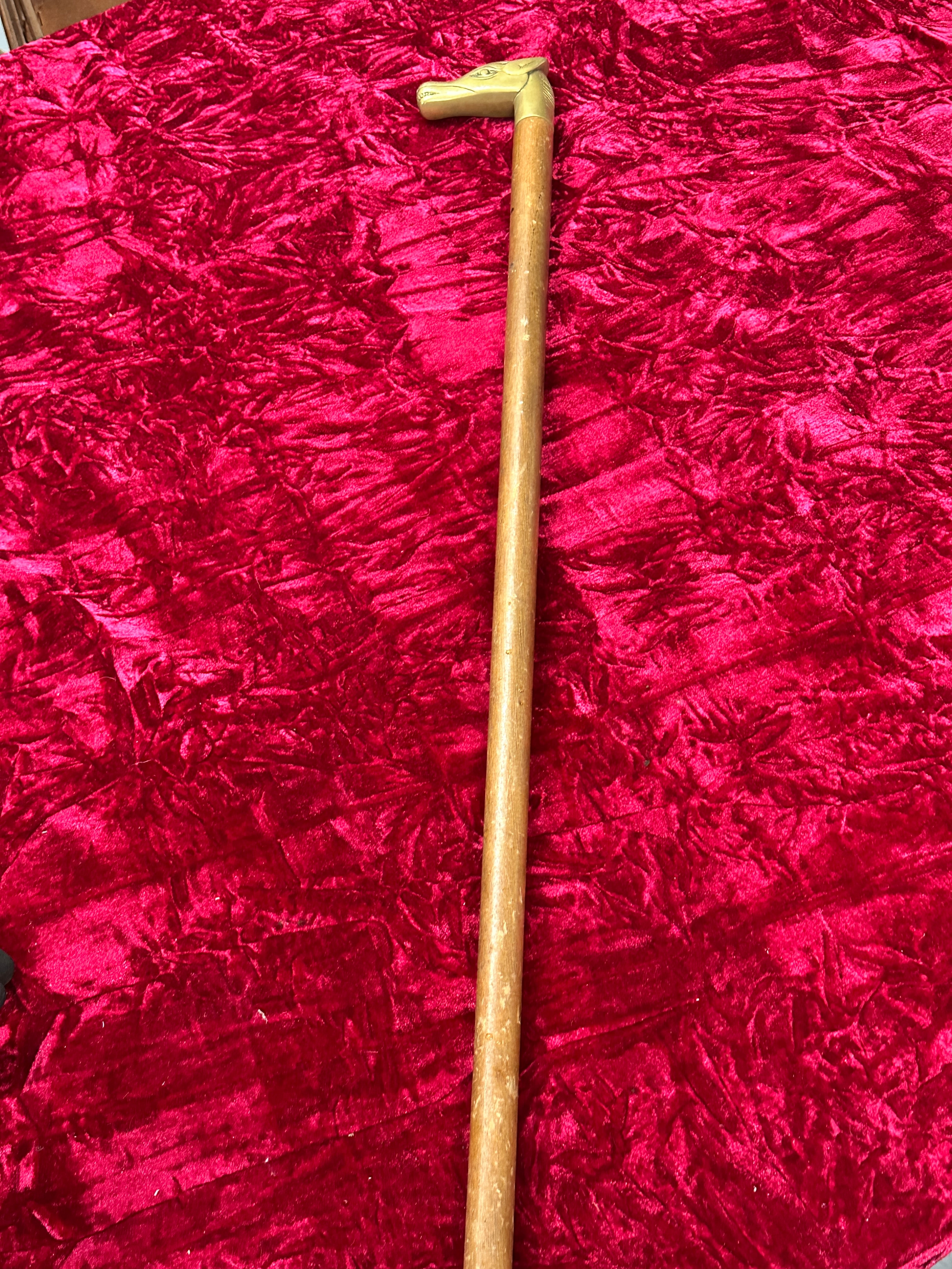 A vintage wooden walking stick featuring a brass horse head handle. The handle is cast in the form of a horse head, with incised details for the eyes, ears, and snout. It is connected to a plain, cylindrical wooden shaft via a narrow brass collar. There are no visible texts or markings.