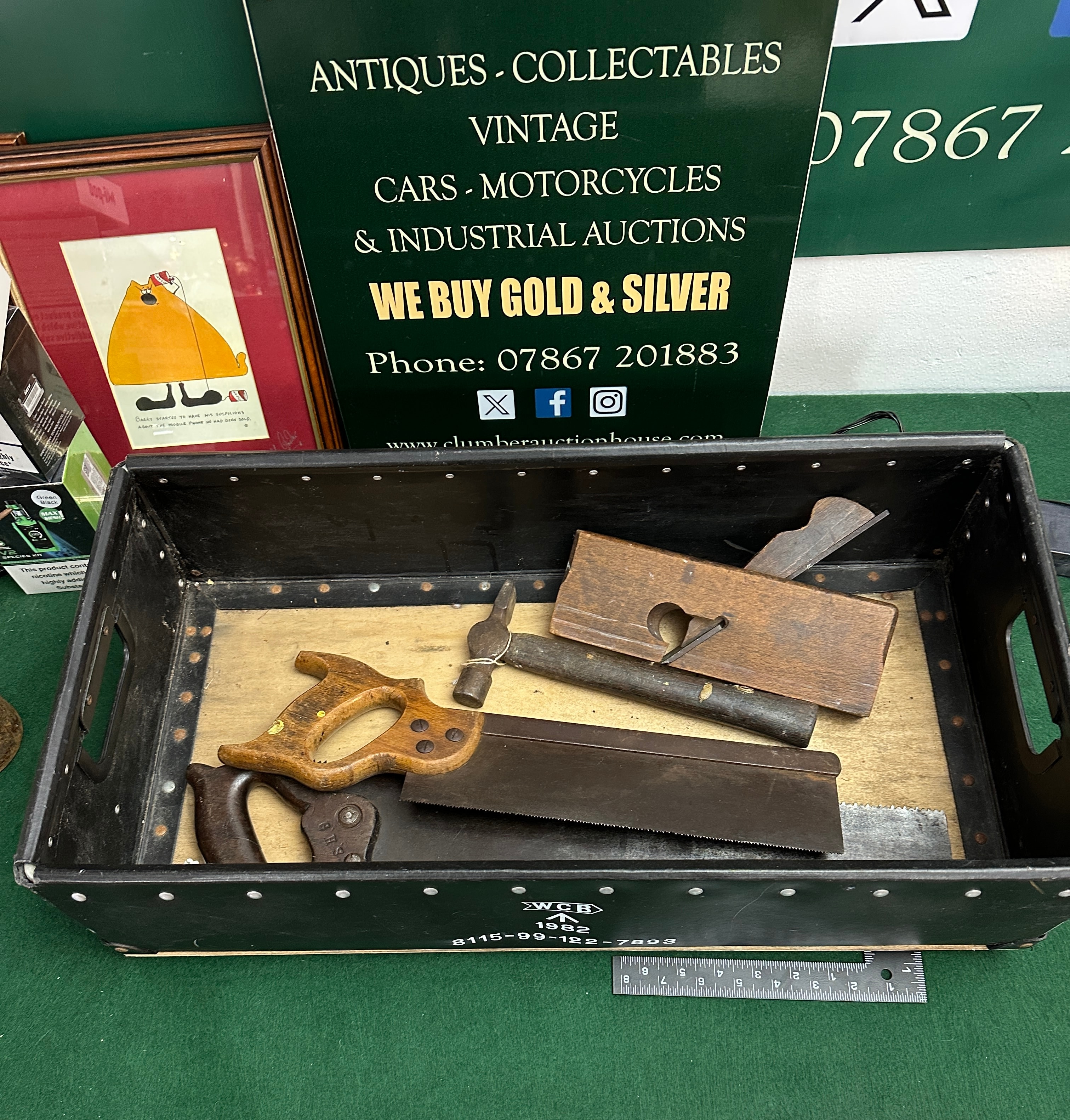 A collection of vintage hand tools, featuring a Disston backsaw, housed within a utilitarian open-top black toolbox. The toolbox is constructed from wood with metal reinforcements or rivets, and its exterior is black with white stenciled markings on one side. These markings read “WCB” above an upward arrow symbol, followed by “1982,” and then “8115-99-122-7893.” The collection also includes a wooden hand plane and a hammer with a dark head and handle. The backsaw features a wooden handle, consistent with a panel or tenon saw.