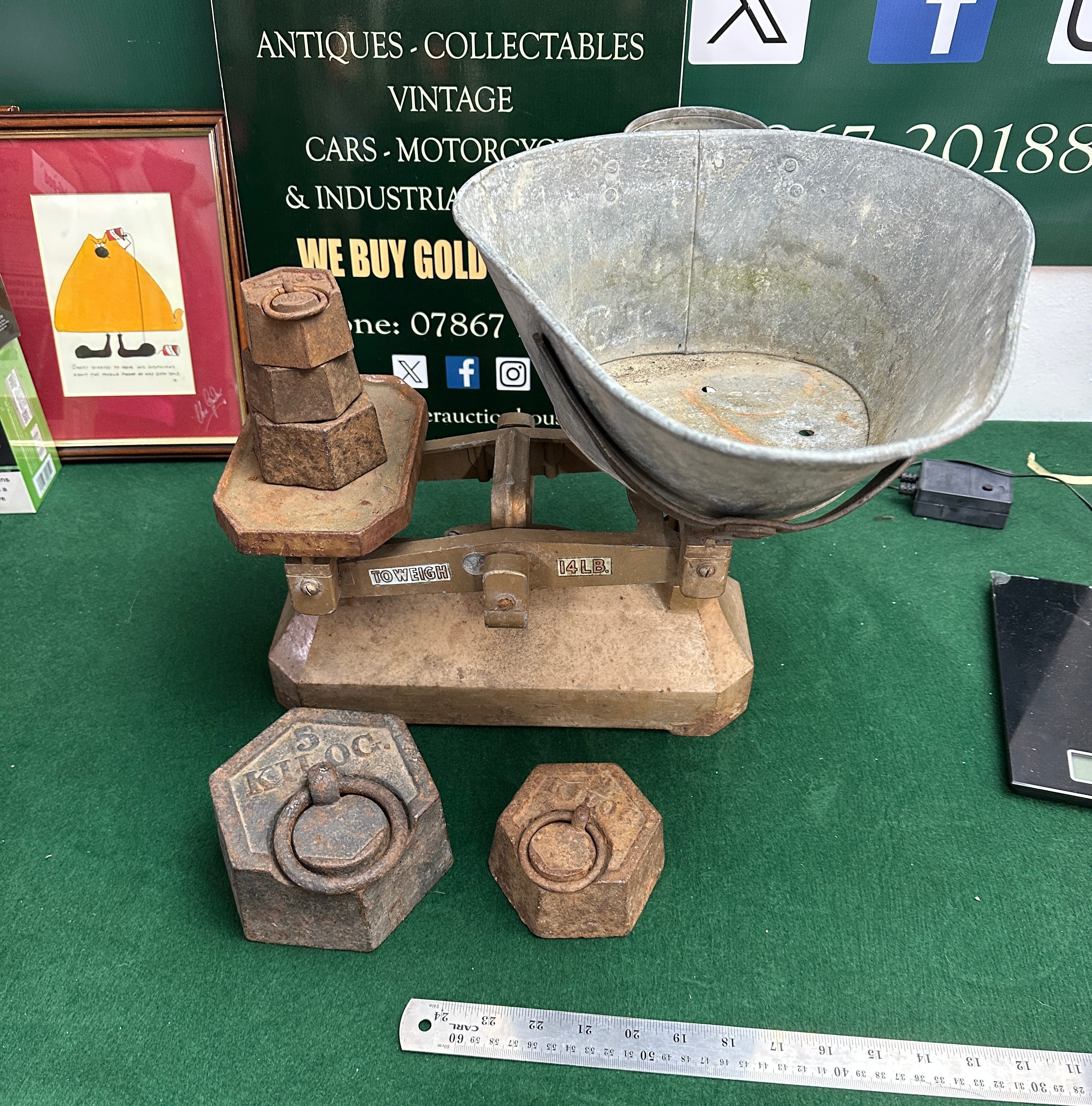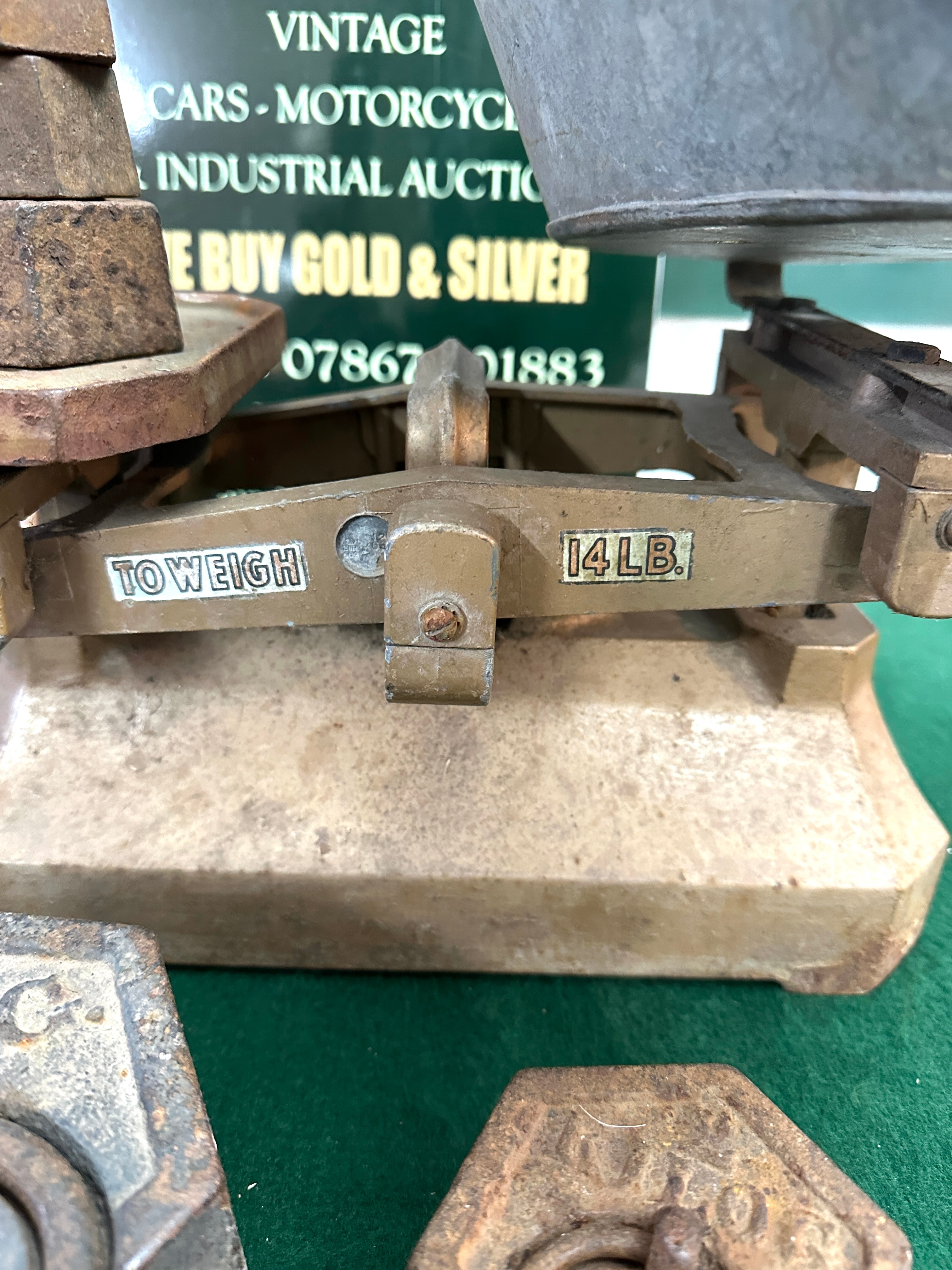A vintage industrial or commercial counter balance scale, featuring a robust, likely cast iron base and beam mechanism. The scale is fitted with a large, worn galvanized metal weighing pan on one side and a flat circular platform on the other. The beam is clearly marked “TO WEIGH” and “14 LB.”, indicating its maximum capacity. Accompanying the scale are several weights, including a stack of smaller, rust-patinated cast iron weights positioned on the platform, and two additional octagonal cast iron weights placed beside the scale, one of which is clearly marked “5 KILOG.”