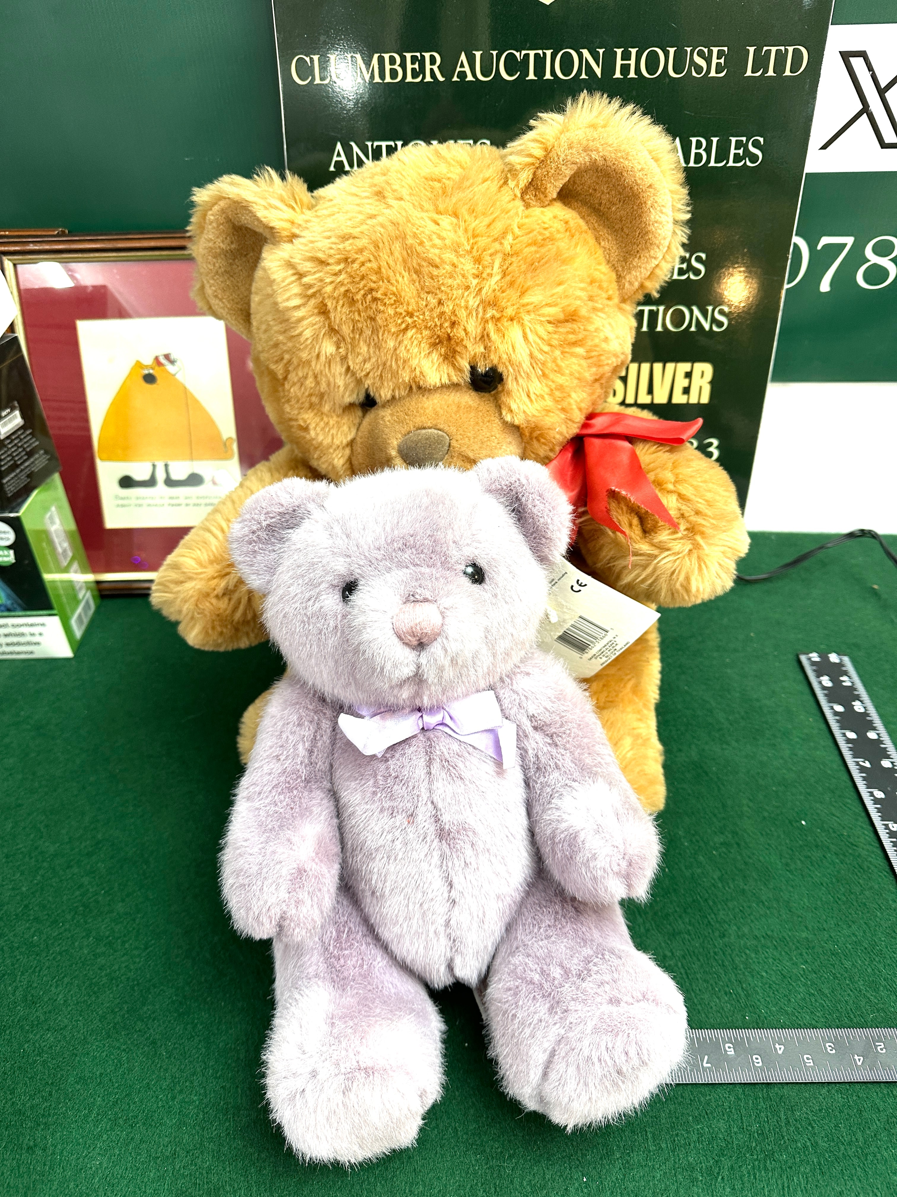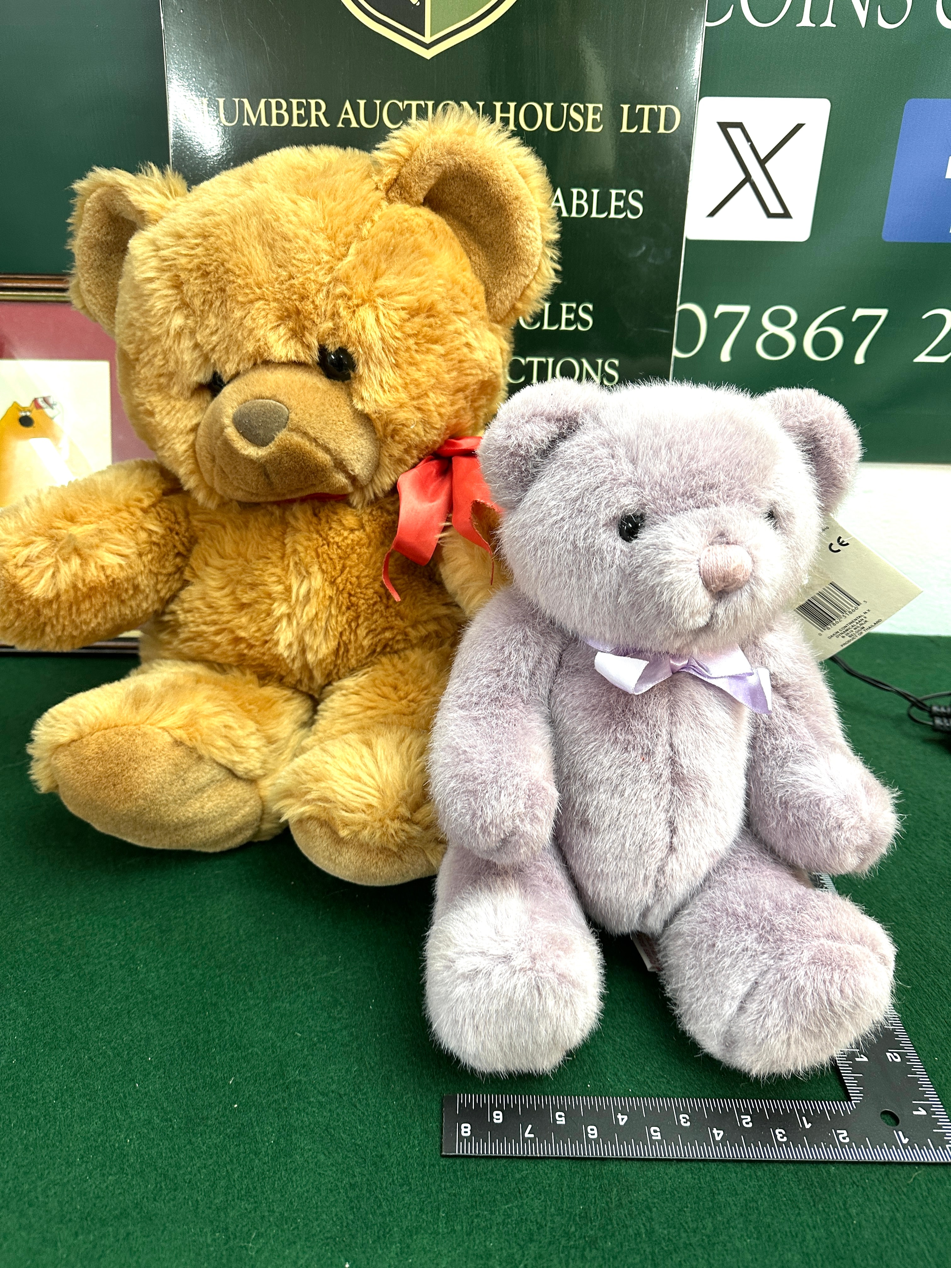 A pair of modern plush teddy bears. The larger bear is golden-brown with a soft plush texture, black plastic eyes, a stitched dark brown nose, and a red satin ribbon tied in a bow around its neck. The smaller bear is a light lavender color, also with a soft plush texture, black plastic eyes, a stitched light pink nose, and a light purple satin ribbon bow. The smaller bear has a white tag attached to its left ear prominently displaying the ‘CE’ mark and also retains a product tag on its back, mostly unreadable except for a barcode.