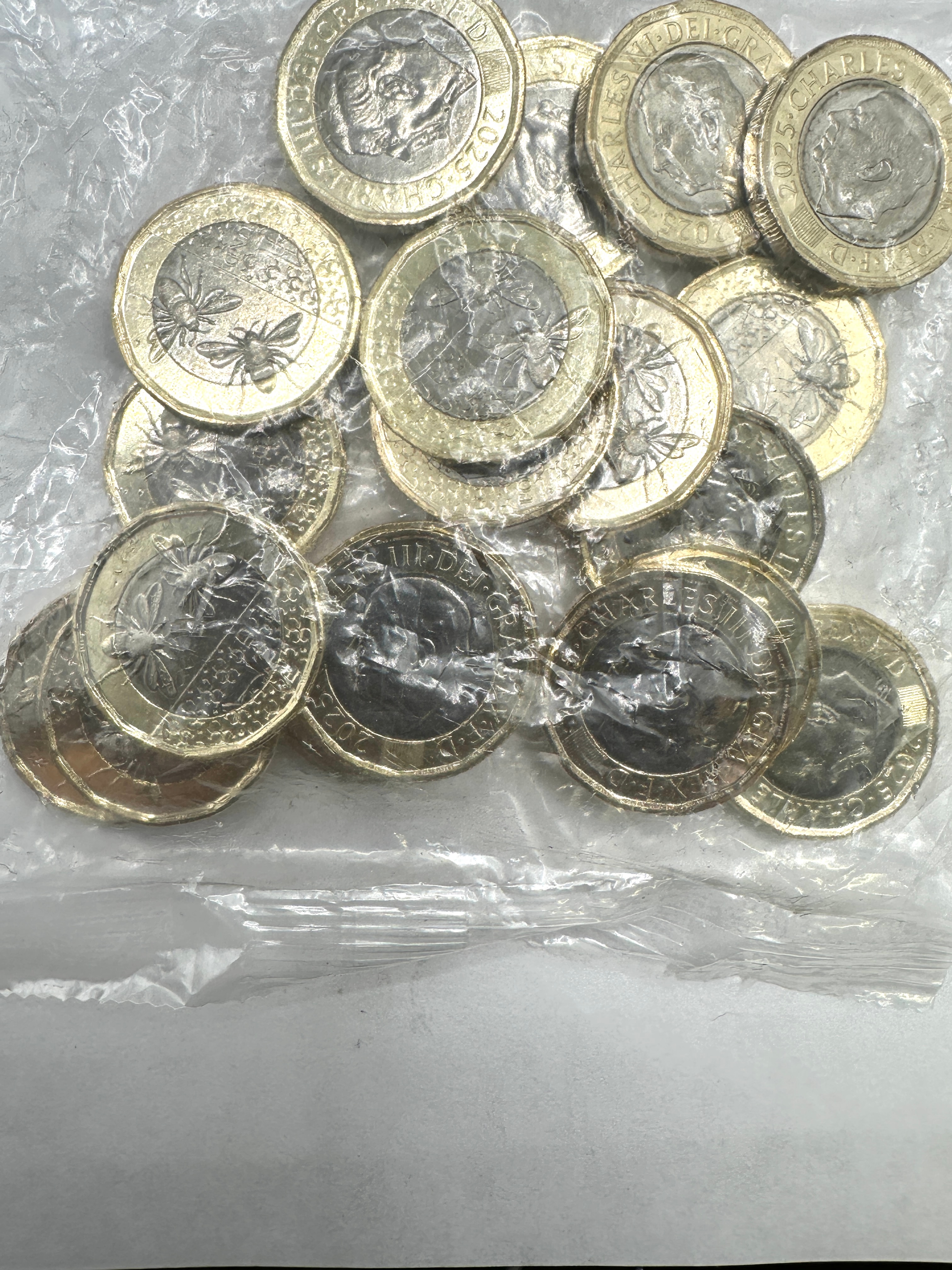 A group of British bi-metallic one pound coins, each featuring a silver-toned core surrounded by a gold-toned outer ring. The obverse of each coin displays a portrait of King Charles III, encircled by the Latin inscription “CHARLES III DEI GRA REX FID DEF,” translating to “Charles III, by the Grace of God, King, Defender of the Faith.” The date “2025” is visible on multiple examples. Reverse designs vary, including nature-themed motifs such as a bee with a shield, a thistle, and a badger, with the denomination “ONE POUND” clearly visible. The coins are presented sealed within a clear plastic bag.
