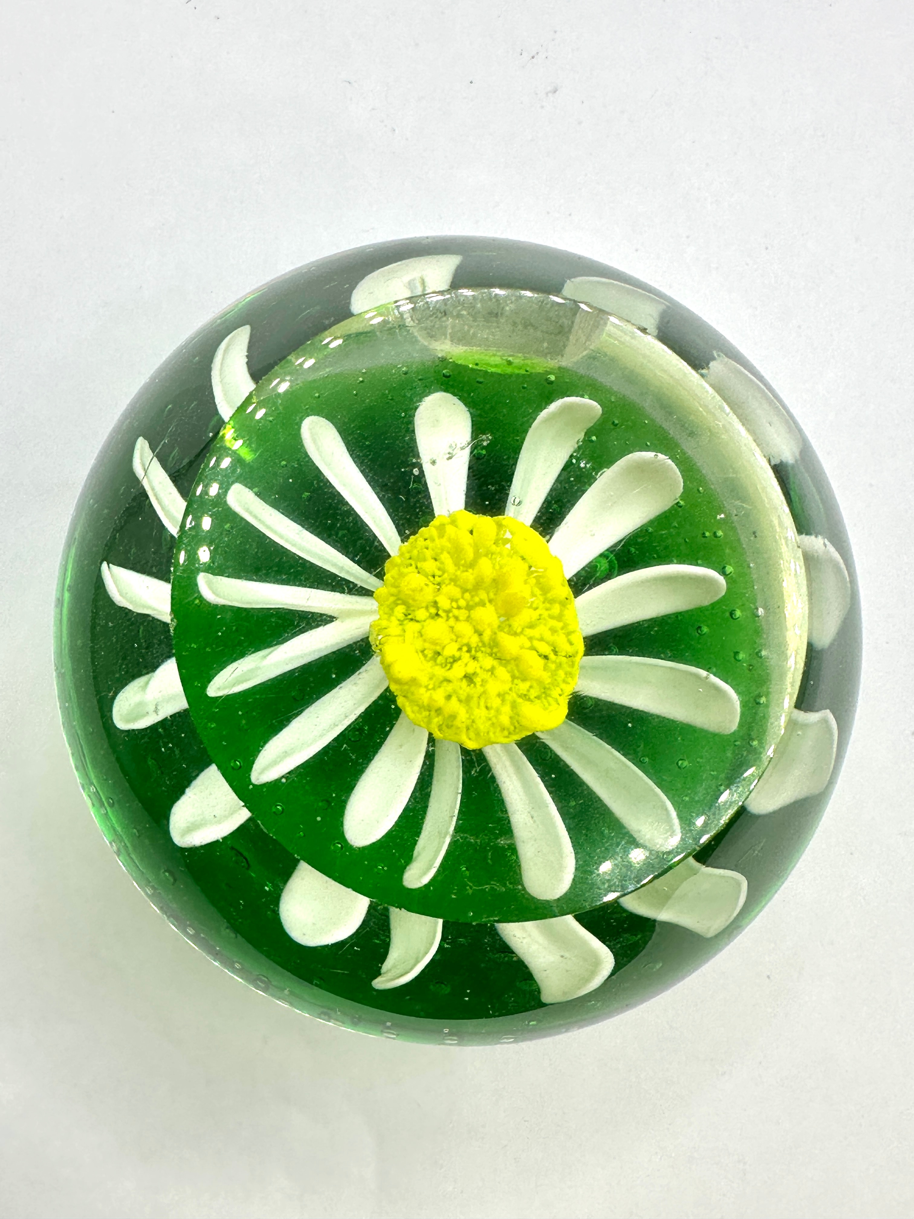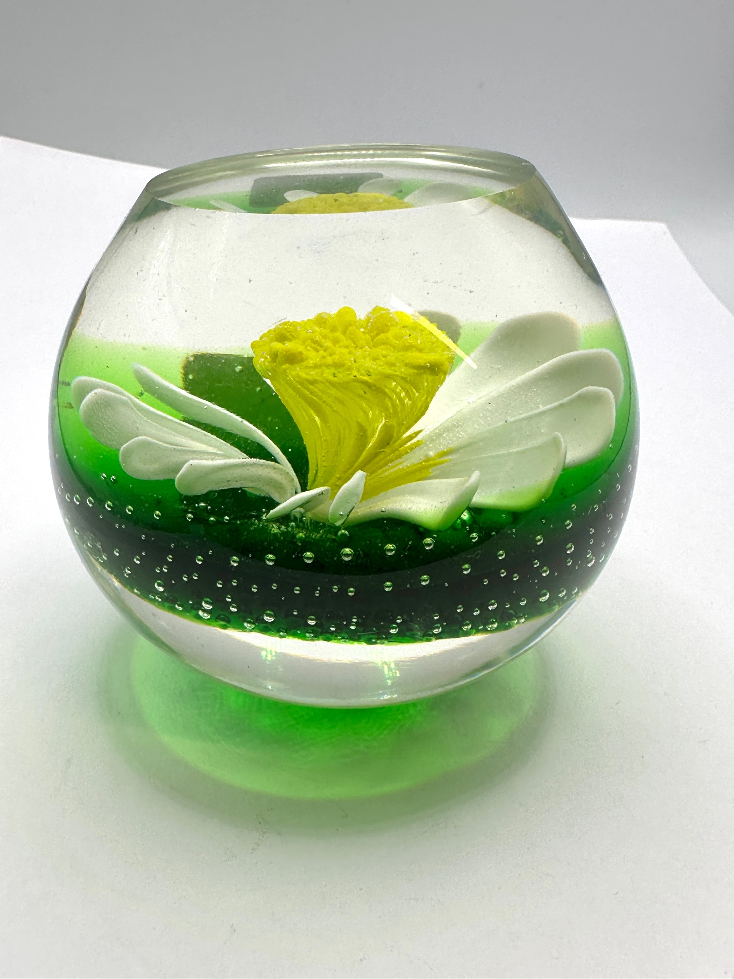 A vintage Murano KB Art Glass bowl or holder, featuring a daisy floral design. Crafted from clear glass with vibrant encapsulated elements, the design presents a stylized daisy-like flower with opaque white petals and a textured, opaque bright yellow center. This is set within a clear glass layer above an opaque bright green base. The green layer also contains numerous small, uniform air bubbles. The object has a rounded, squat form with a slightly concave opening at the top. The style appears contemporary.