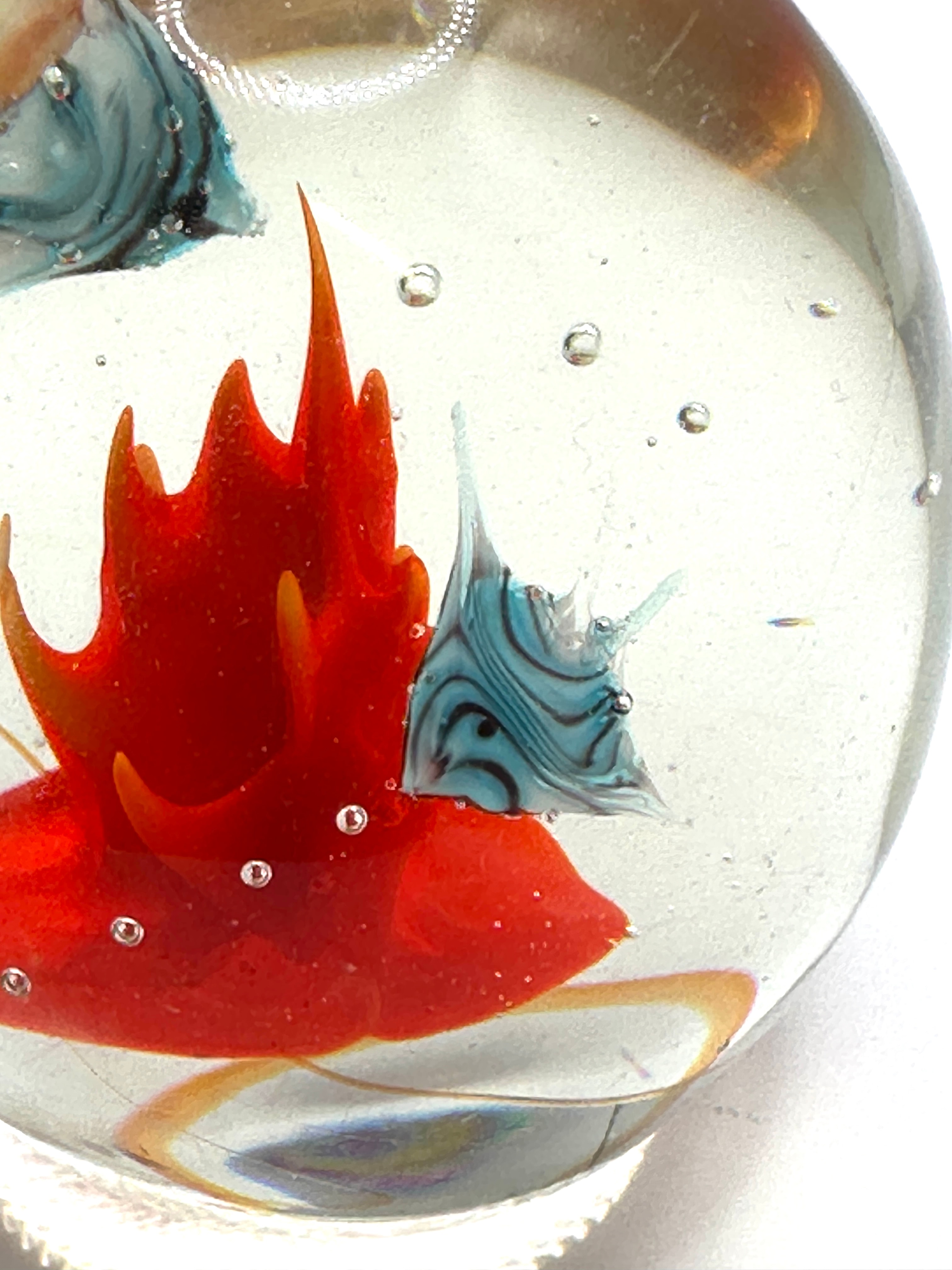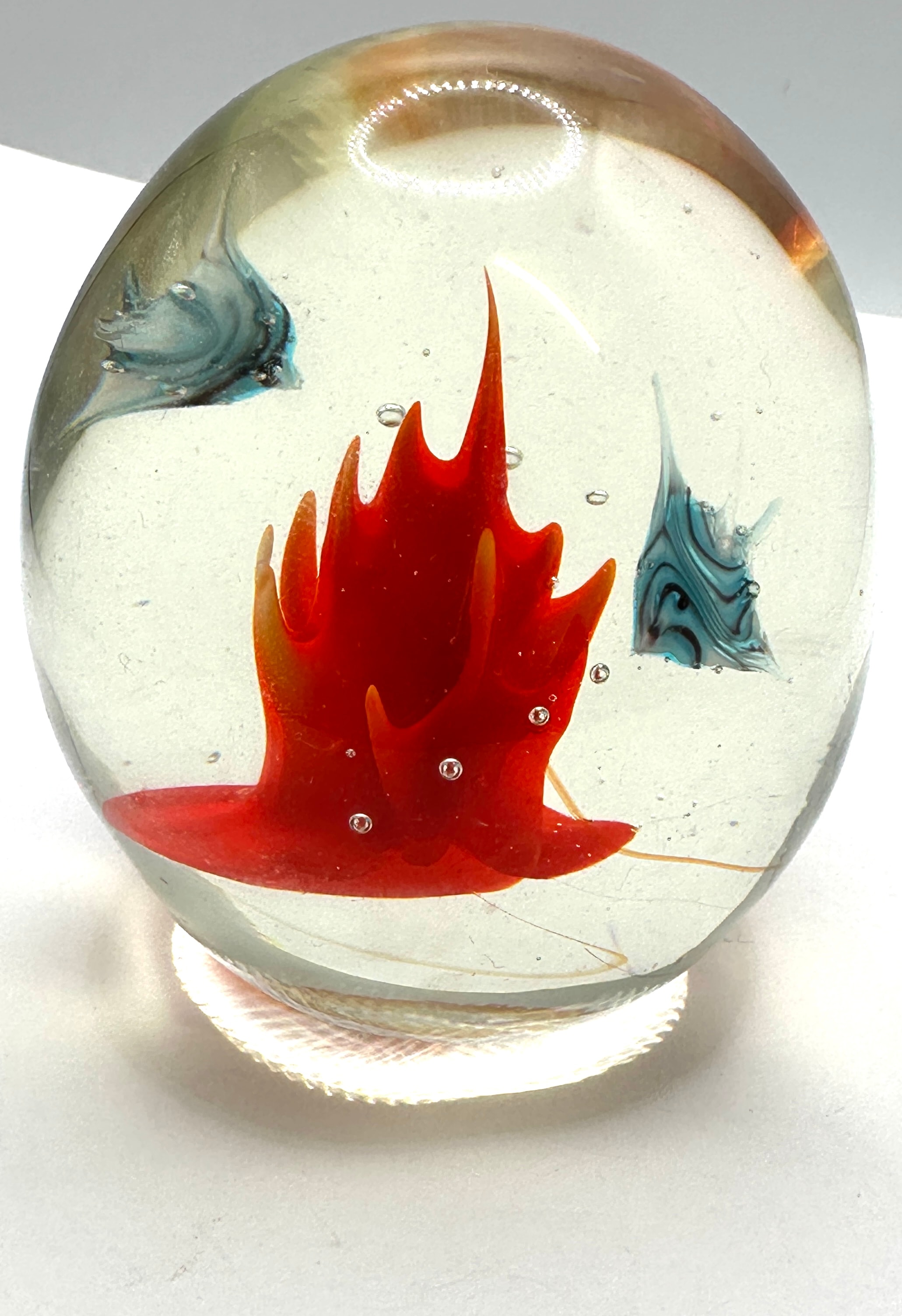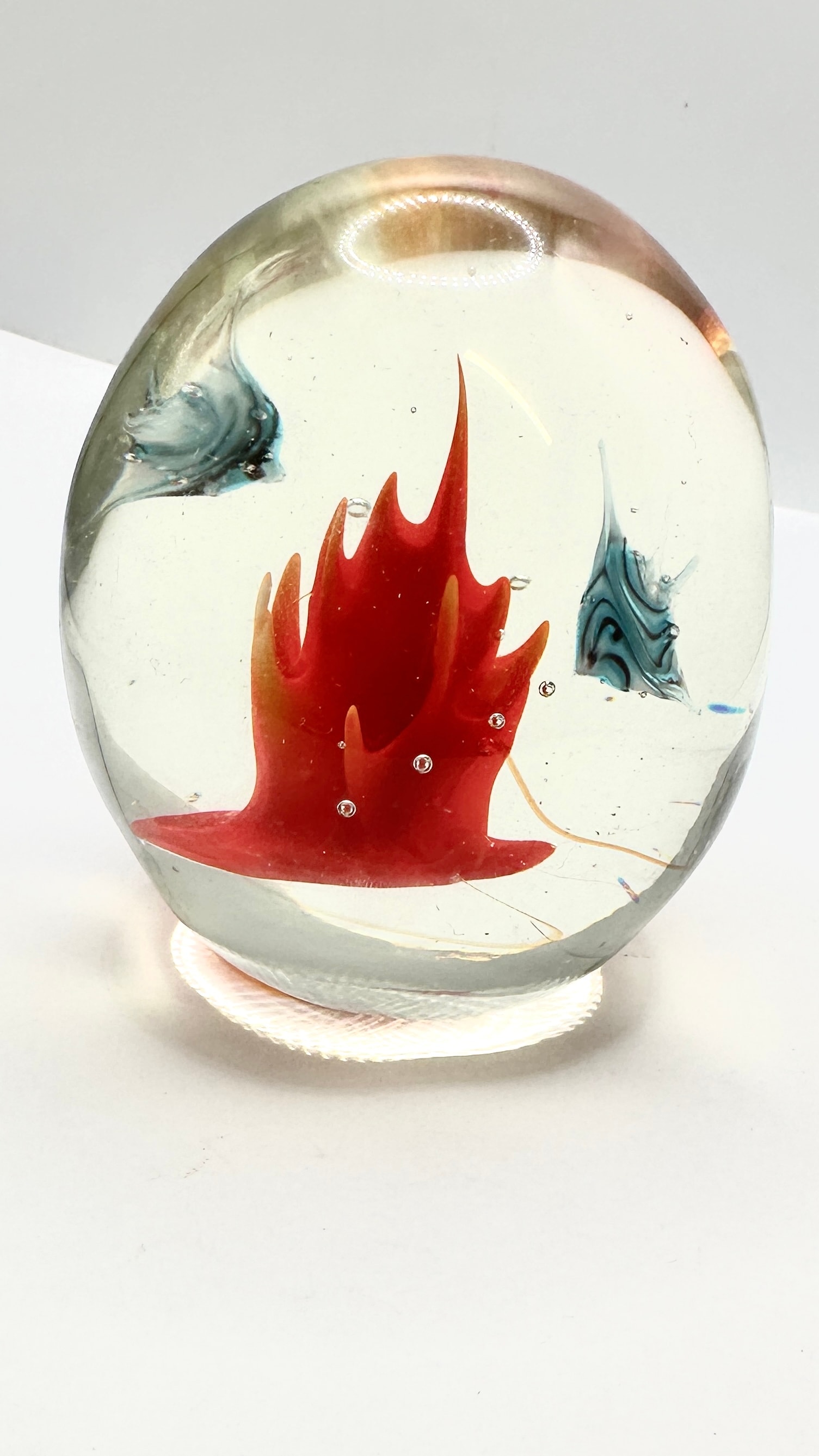 A Murano Art Glass Ovoid Paperweight. Crafted from clear glass, it encapsulates internal colored glass elements. The central design features a prominent, vibrant red inclusion with undulating, flame-like or botanical forms. This is surrounded by multiple smaller, stylized inclusions in teal blue with black swirling patterns, resembling fish or abstract marine life. Numerous small, trapped air bubbles are visible throughout the clear glass matrix. The object has a polished, flattened base for stability.