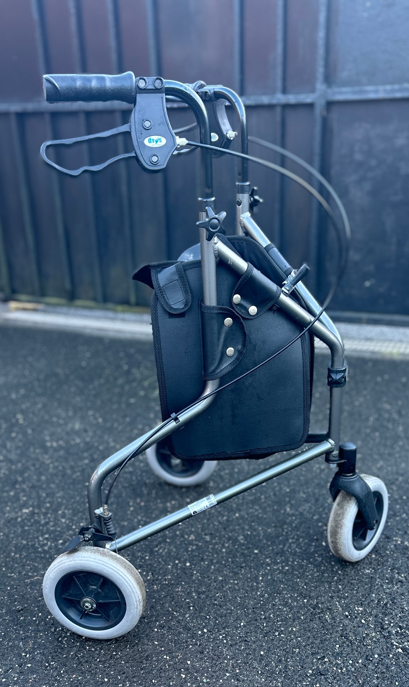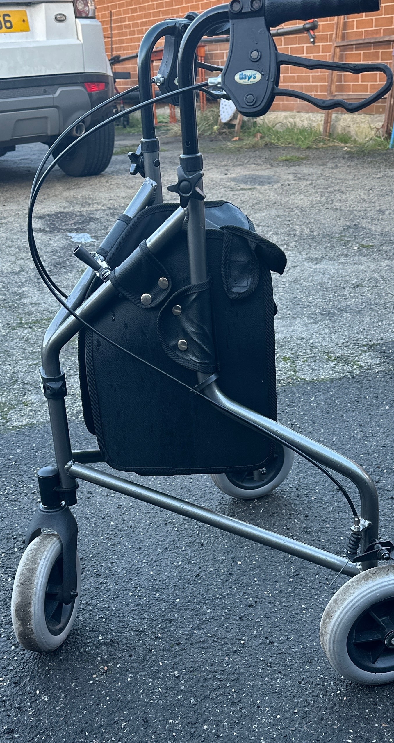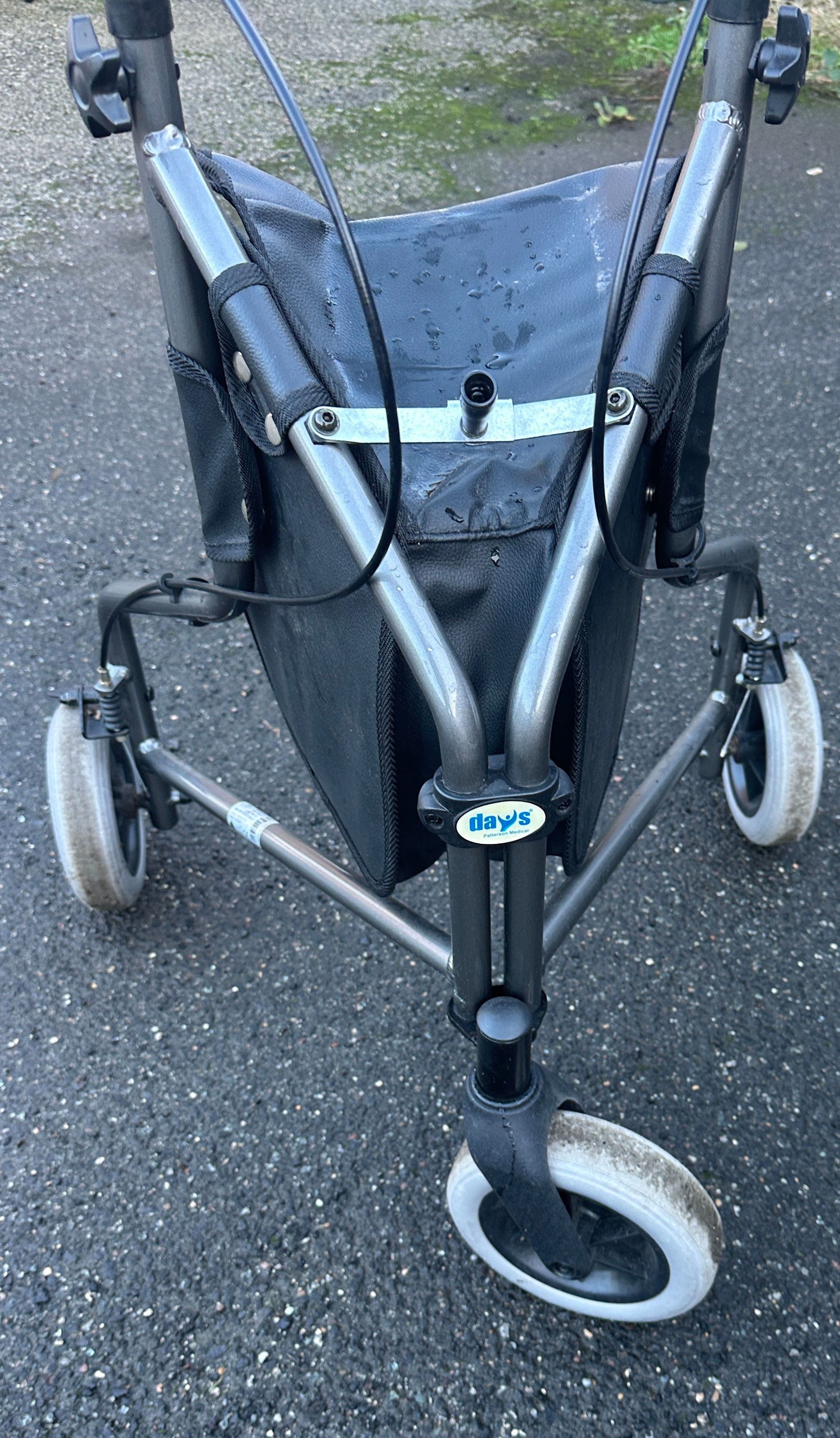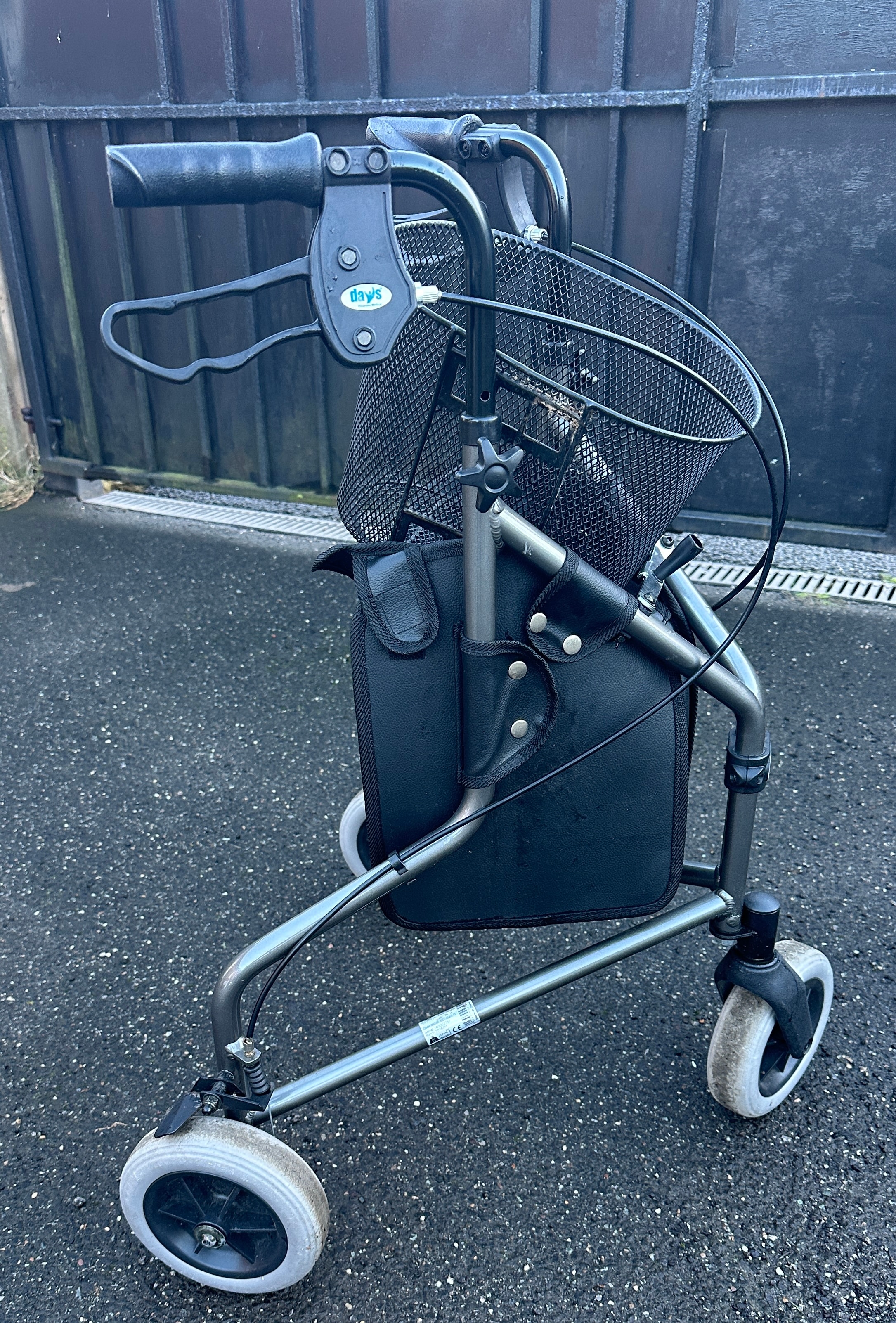 A modern three-wheeled rollator-style mobility aid, branded ‘Days’ with a blue oval logo prominently displayed on the frame and near the handles. It features a dark grey lightweight metal alloy frame, black rubberized hand grips with integrated brakes, and white solid rubber tires on black hubs. The rollator is equipped with a black synthetic fabric seat/storage bag and a black wire mesh basket.