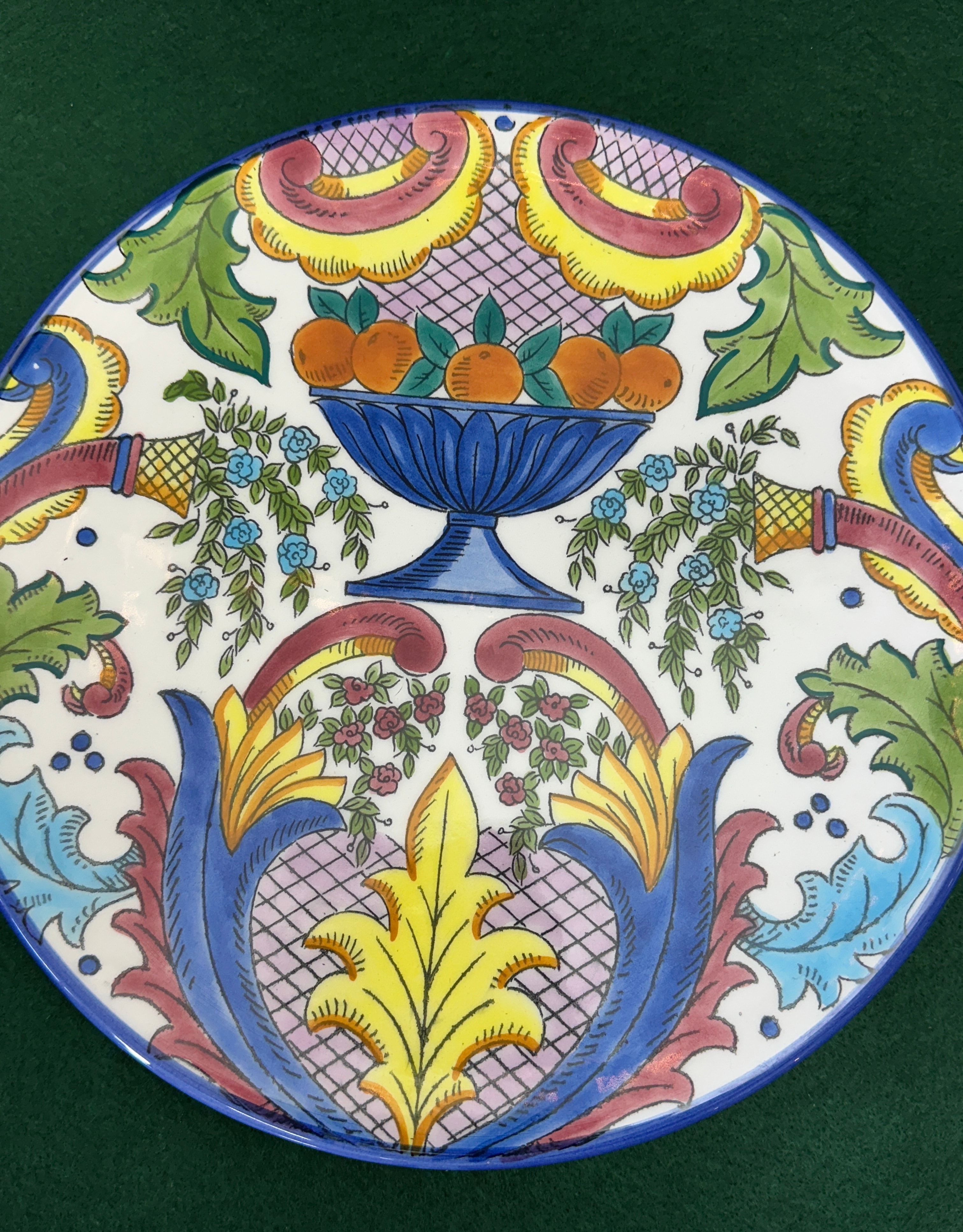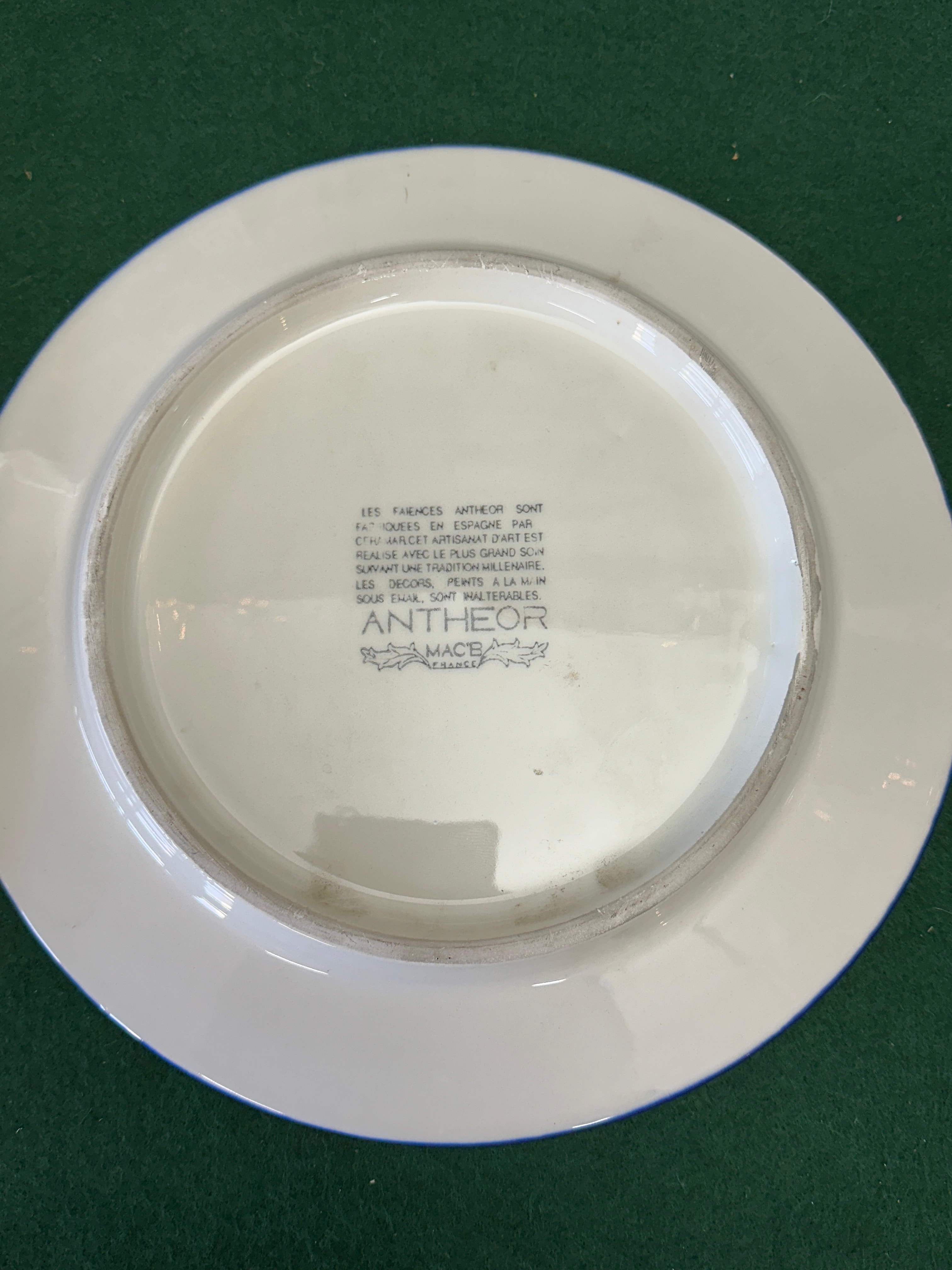 A pair of Ceramar Spain hand-painted ceramic plates, each featuring a vibrant polychrome design. The central motif depicts a bowl of oranges, surrounded by elaborate scrolling foliage, floral motifs, and geometric patterns executed in shades of blue, yellow, green, pink, and orange, all framed by a consistent blue rim. The reverse of one plate bears text in French: “LES FAIENCES ANTHEOR SONT ELABOREES EN ESPAGNE PAR UN ARTISAN D’ART. CET ARTISAN D’ART EST L’HERITIER D’UNE MAISON SUIVANT UNE TRADITION MILLENAIRE. LES DECORS PEINTS A LA MAIN SOUS EMAUX SONT INALTERABLES,” followed by the brand name “ANTHEOR,” a stylized “M A C B A” logo, and the word “FRANCE.” Despite the ‘Antheor’ mark, market consensus attributes these plates to Ceramar, Spain.