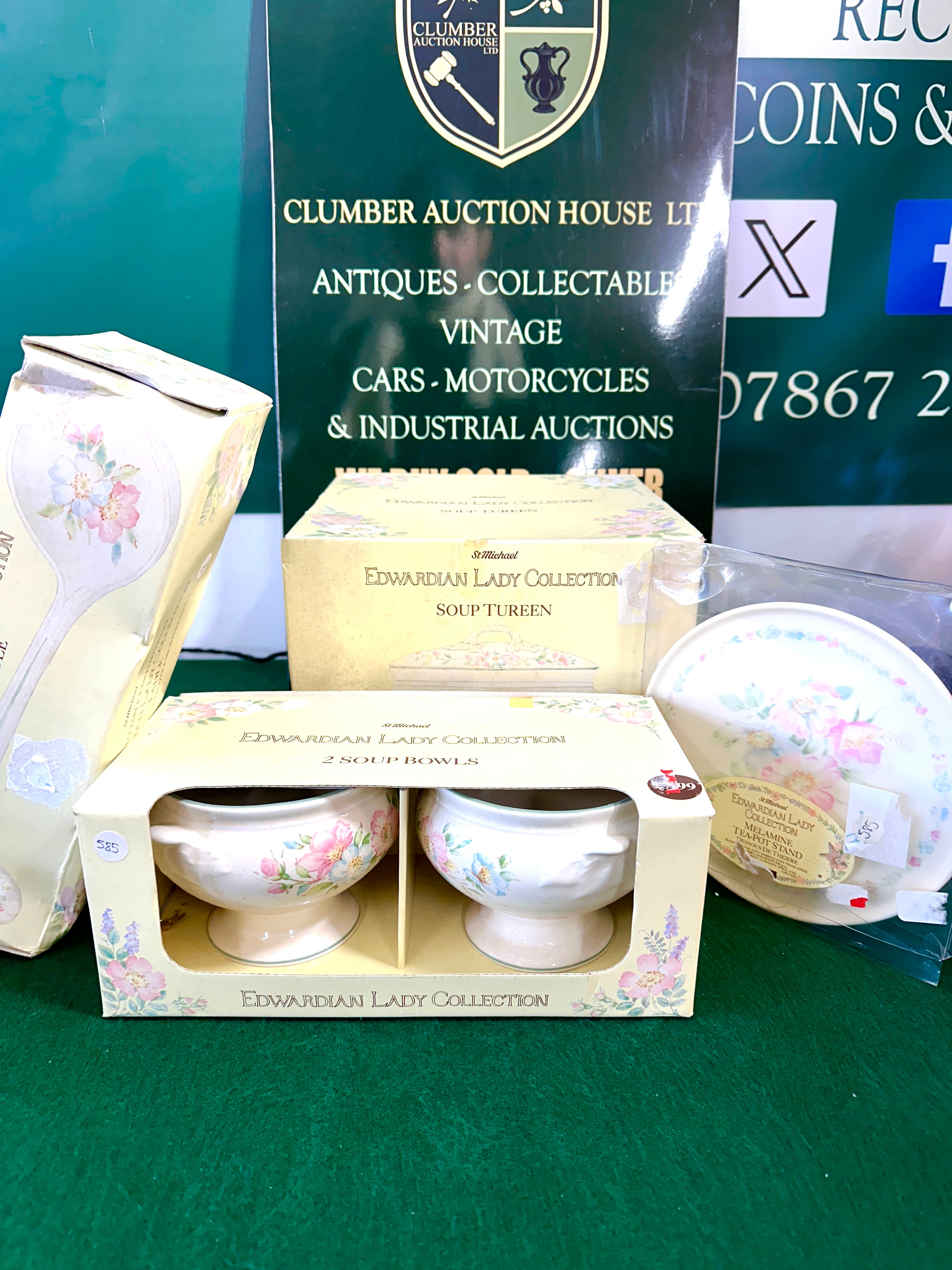 This lot comprises several items, predominantly ceramic dinnerware from the Pfaltzgraff Tea Rose Collection, alongside a melamine tea-pot stand. The ceramic items, including a boxed soup tureen, a box containing two soup bowls, and a partially visible serving spoon, all feature a delicate floral motif in pink and blue tones, consistent with the Pfaltzgraff Tea Rose pattern. The melamine tea-pot stand, sealed in clear plastic, is from the ‘St Michael Edwardian Lady Collection’ and its packaging indicates ‘MADE IN ENGLAND’ and includes the French translation ‘DESSUS DE THEIERE’. All items are presented largely in their original, slightly worn cardboard packaging. The packaging for the ceramic items is also branded ‘St Michael Edwardian Lady Collection’. Lot numbers ‘585’ and ‘599’ are affixed to some boxes.