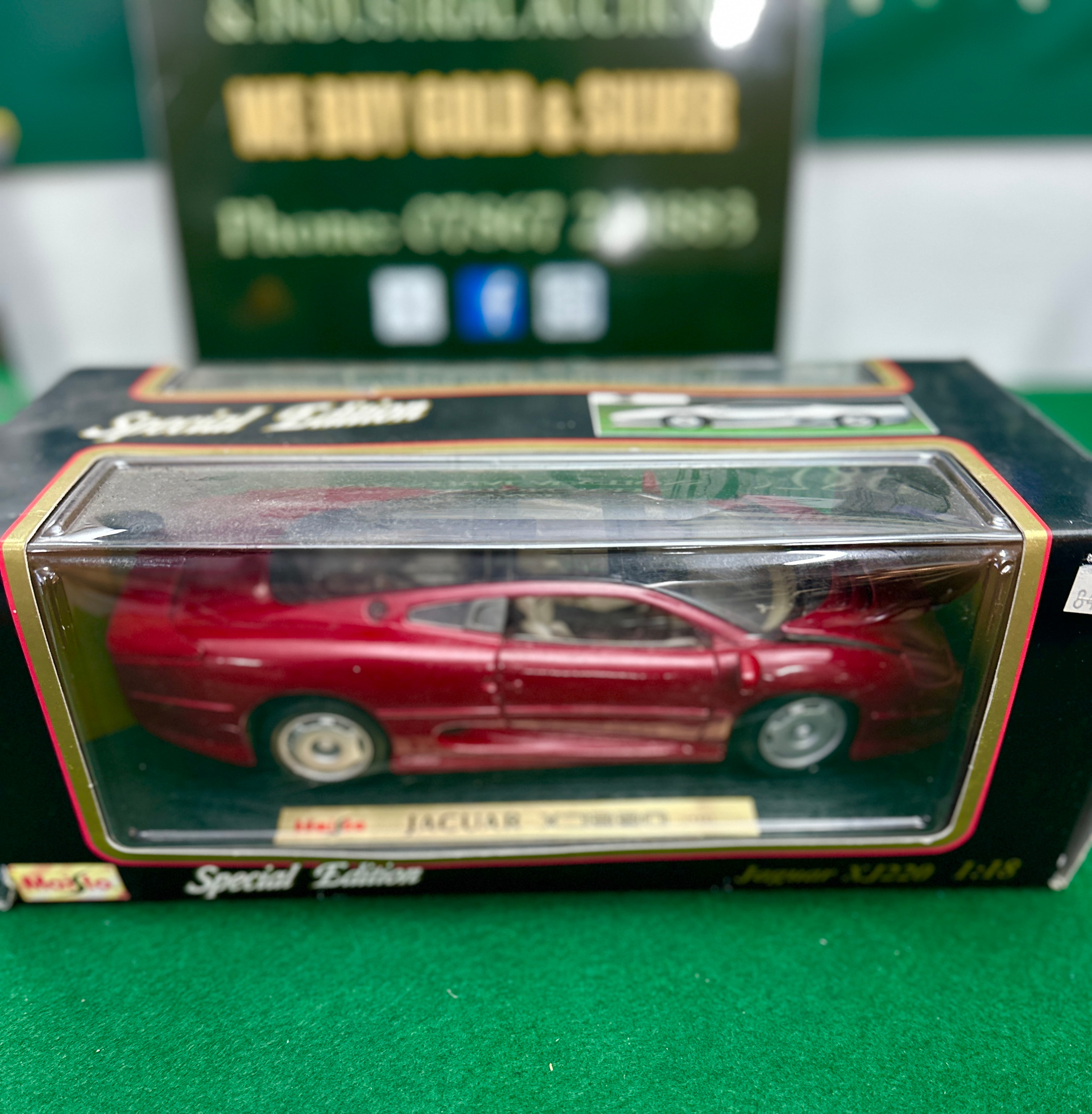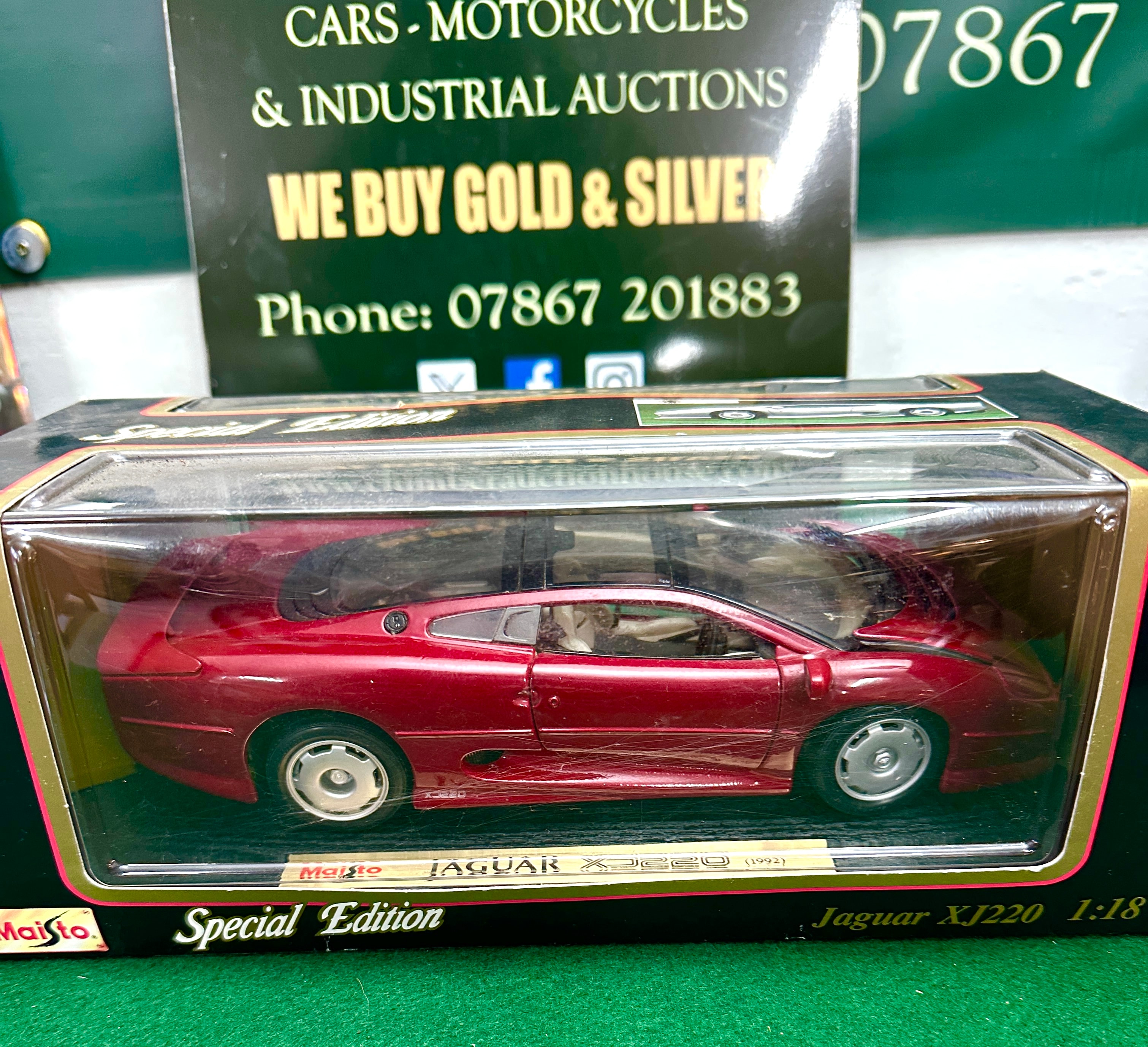 A Maisto Special Edition 1:18 scale 1992 Jaguar XJ220 die-cast model car. The deep red replica of the 1992 Jaguar XJ220 sports car is housed within its original cardboard window box with a clear plastic front. Visible markings include “Maisto,” “JAGUAR XJ220,” “(1992),” “Special Edition,” and “1:18.”