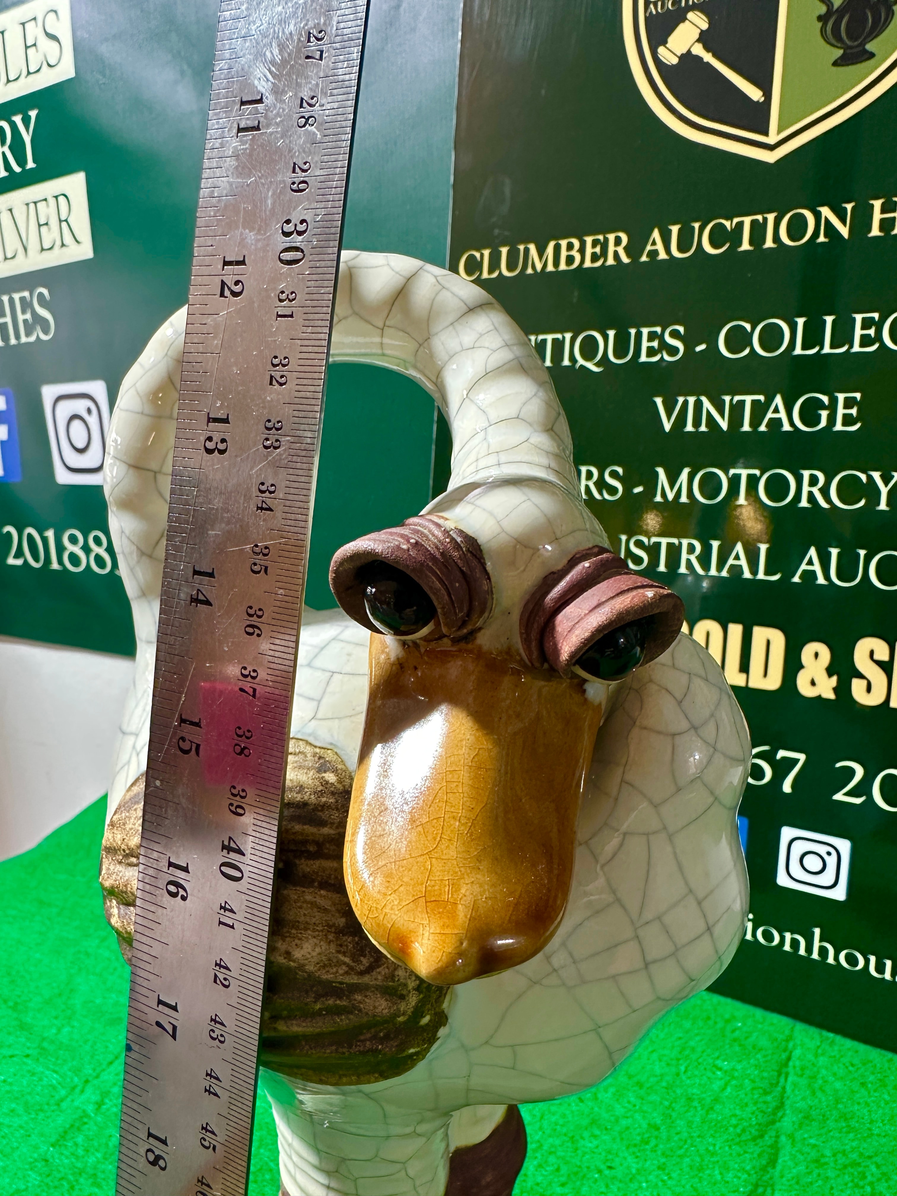 A whimsical ceramic figure of a stylized waterfowl, likely a duck or goose, standing upright with an elongated, curved neck forming a loop. The body and neck feature an intentional white crackled glaze (craquelure), while the beak is a glossy yellow-orange. The large, protruding eyes have dark pupils framed by textured, reddish-brown eyelids. The legs and webbed feet are rendered in a darker reddish-brown, and a textured, wing-like detail is visible on the body’s side. There are no visible markings on the item itself.