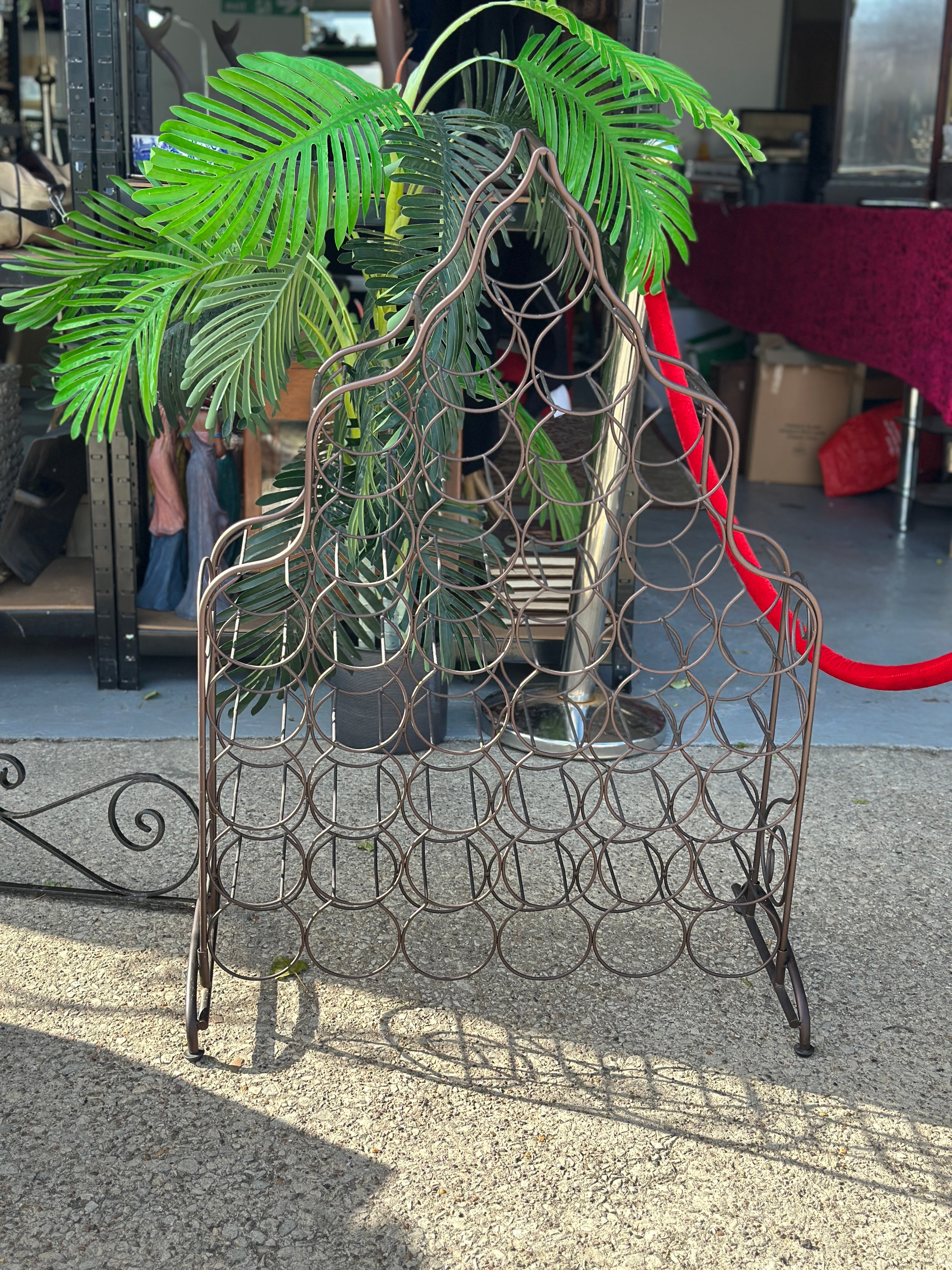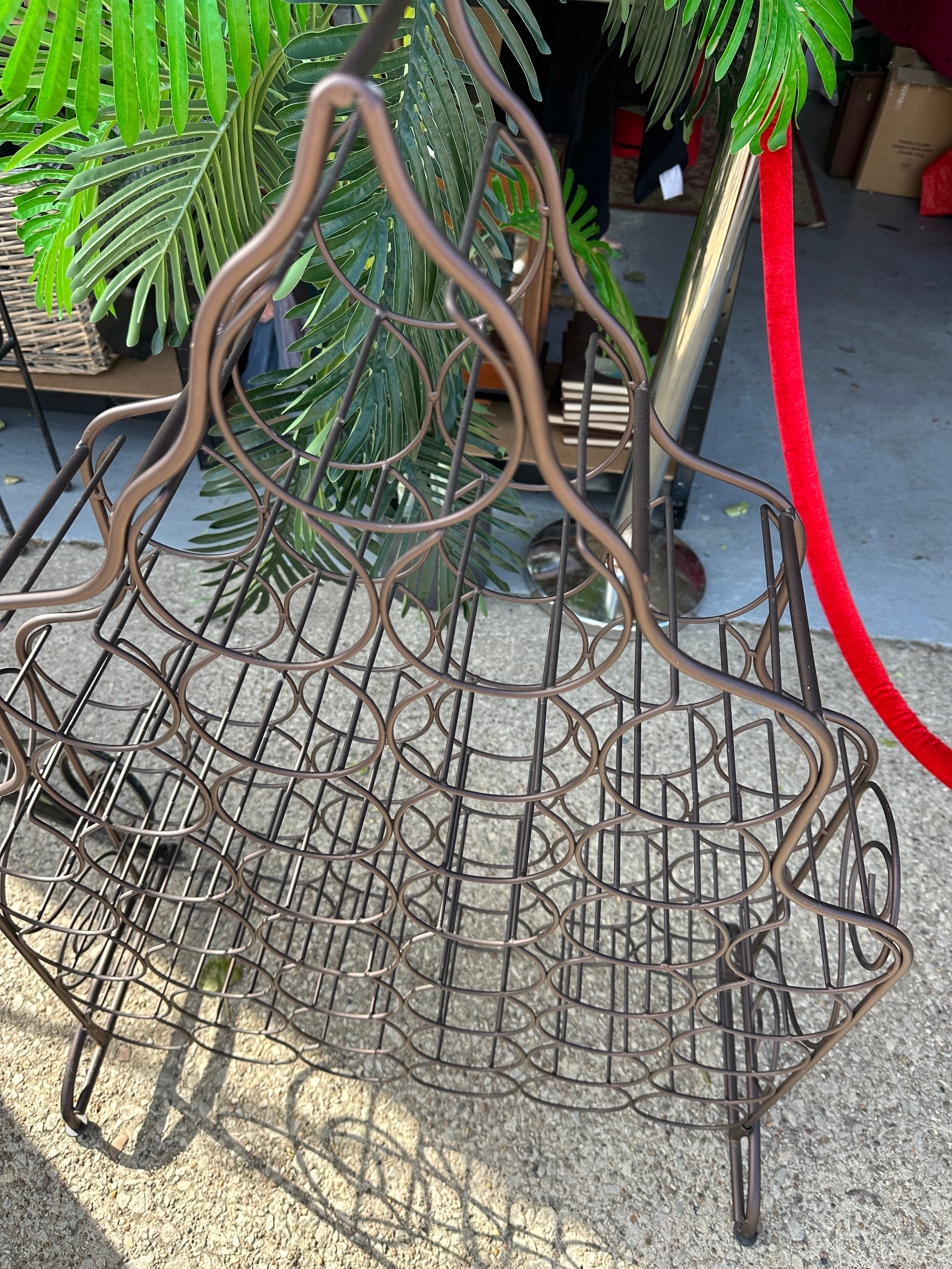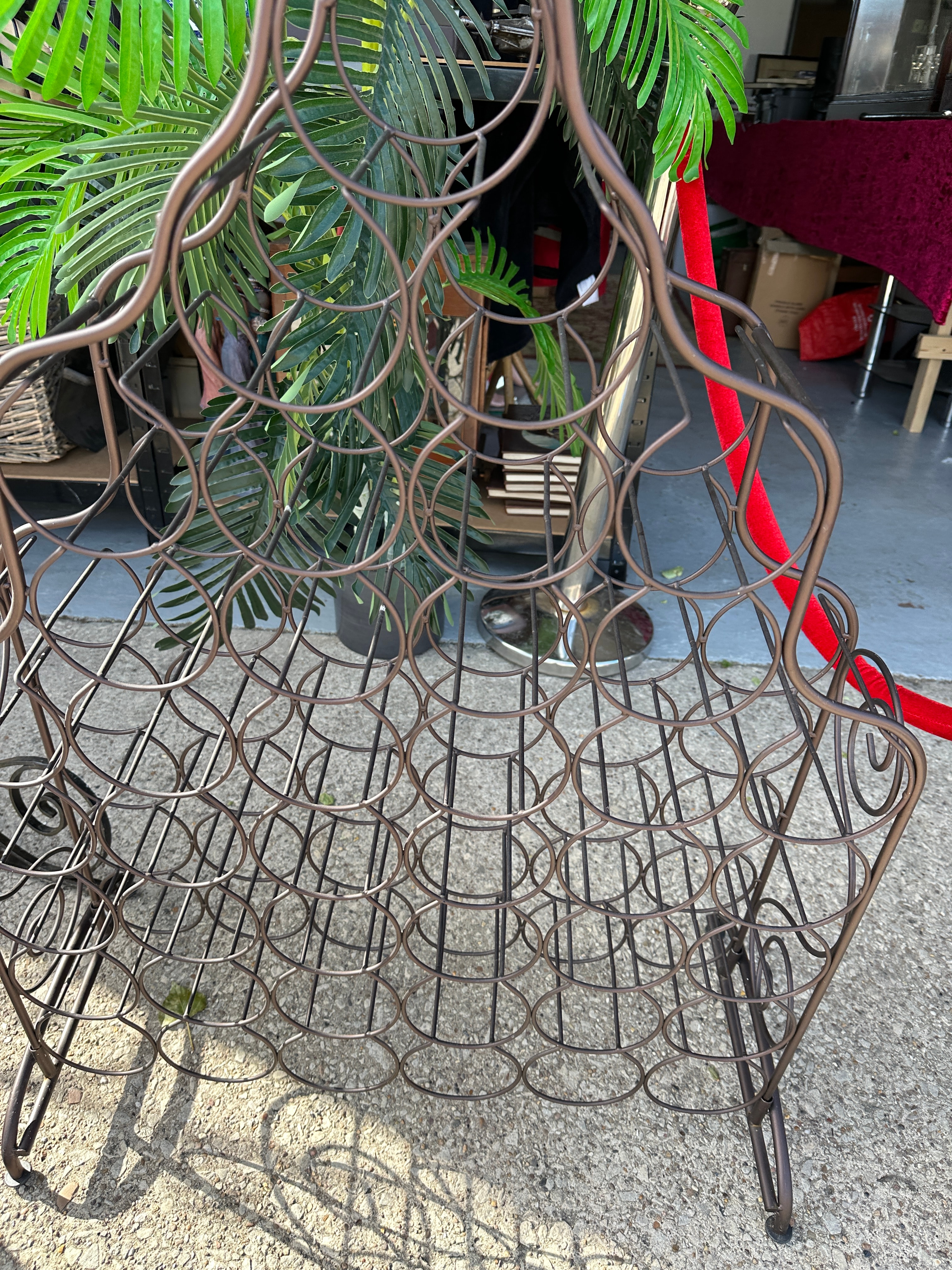 A freestanding dark-finished metal wine rack, likely wrought iron or steel with an antiqued bronze-tone finish. The rack features a decorative arched top with intertwining circular motifs and multiple circular compartments designed to hold 25 wine bottles horizontally. It presents a rustic or Mediterranean-inspired style of modern production. No visible text or manufacturer’s markings are present.