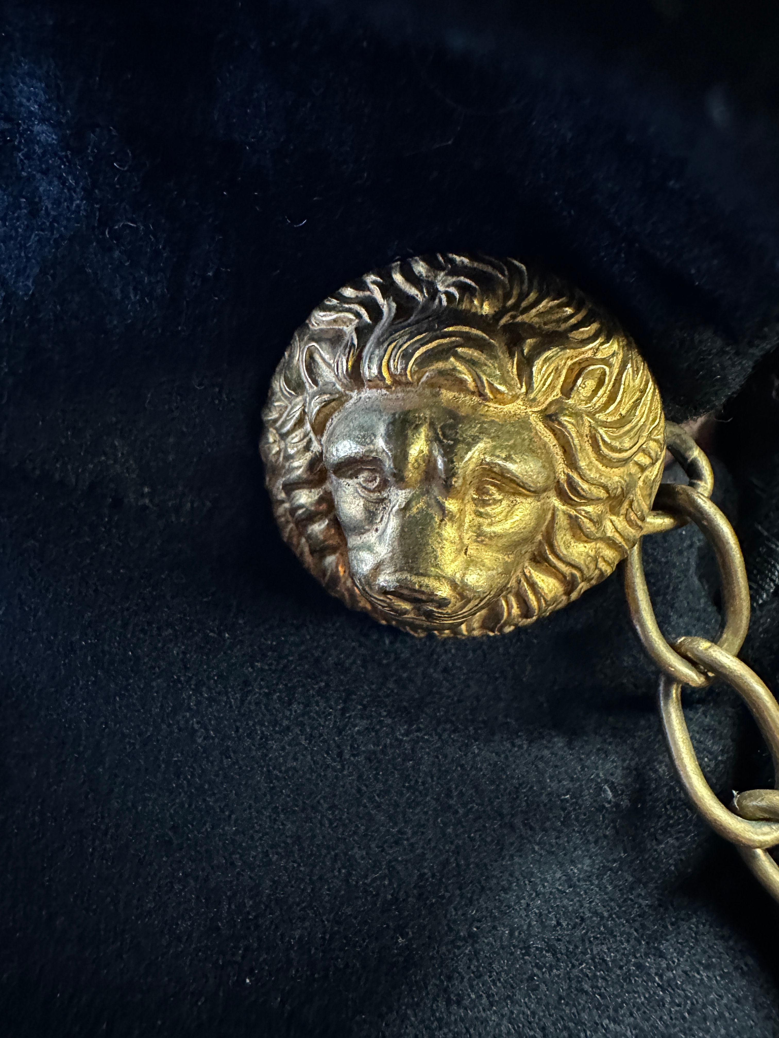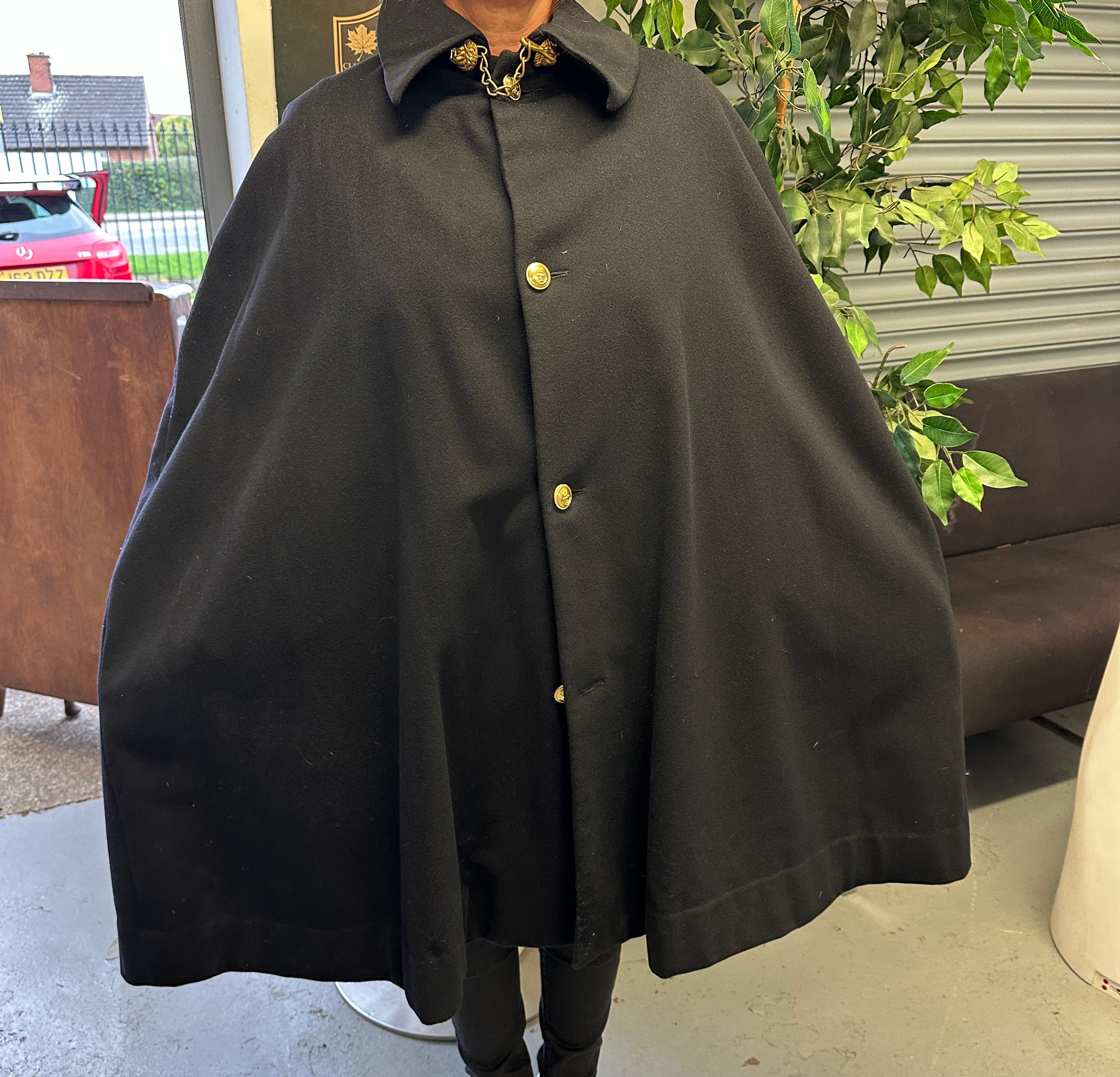 A Naval Boat Cloak, consistent with those worn by Australian Navy Commanders on ceremonial occasions. The dark-colored, short-length cape is crafted from a heavy wool or wool-blend fabric in black or dark navy. It features a collared neckline and a visible front button closure with three round, plain brass-toned buttons. A prominent decorative element is a brass-toned metal chain connecting the lapels, adorned with two ornate, sculpted lion’s head terminals and a small central button-like element displaying an indistinct design. The garment presents a formal, uniform-inspired aesthetic.