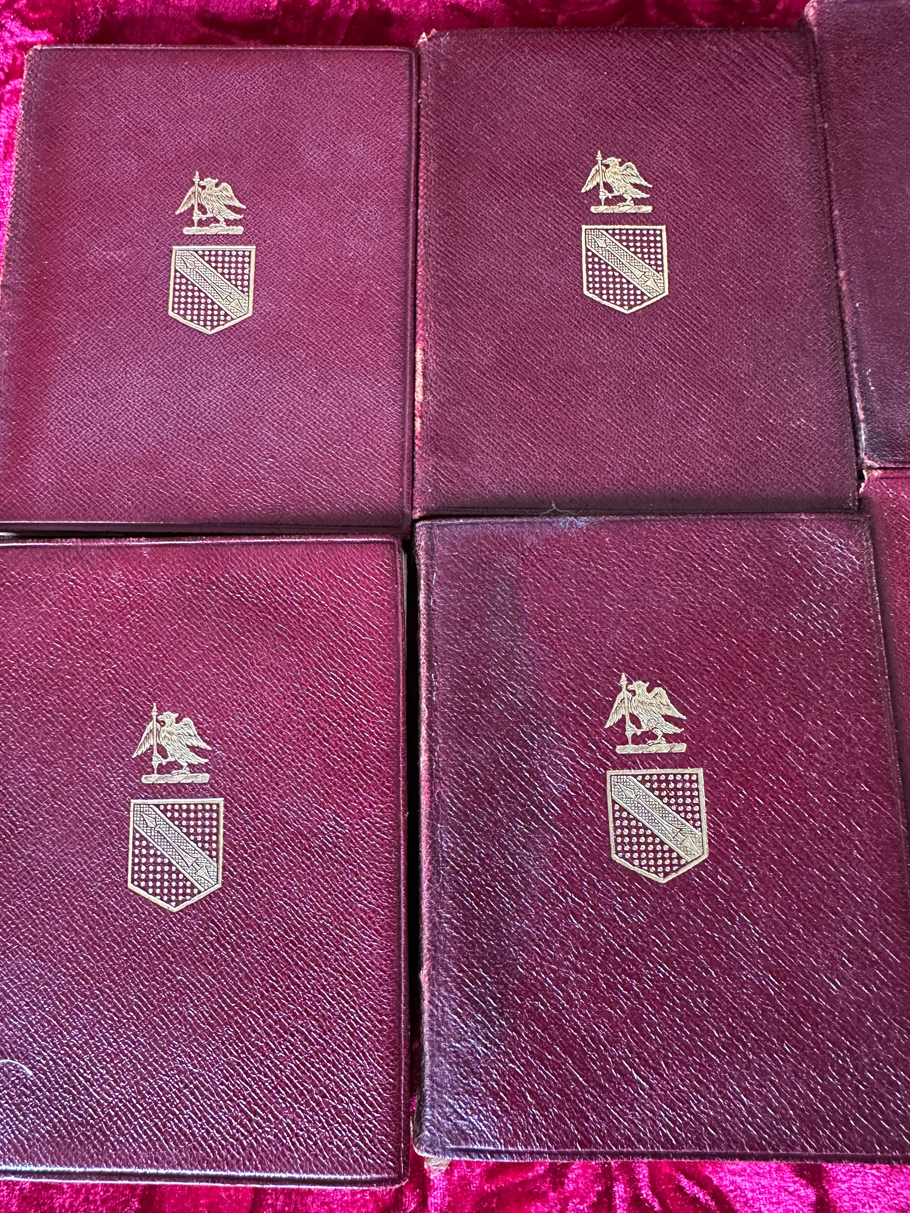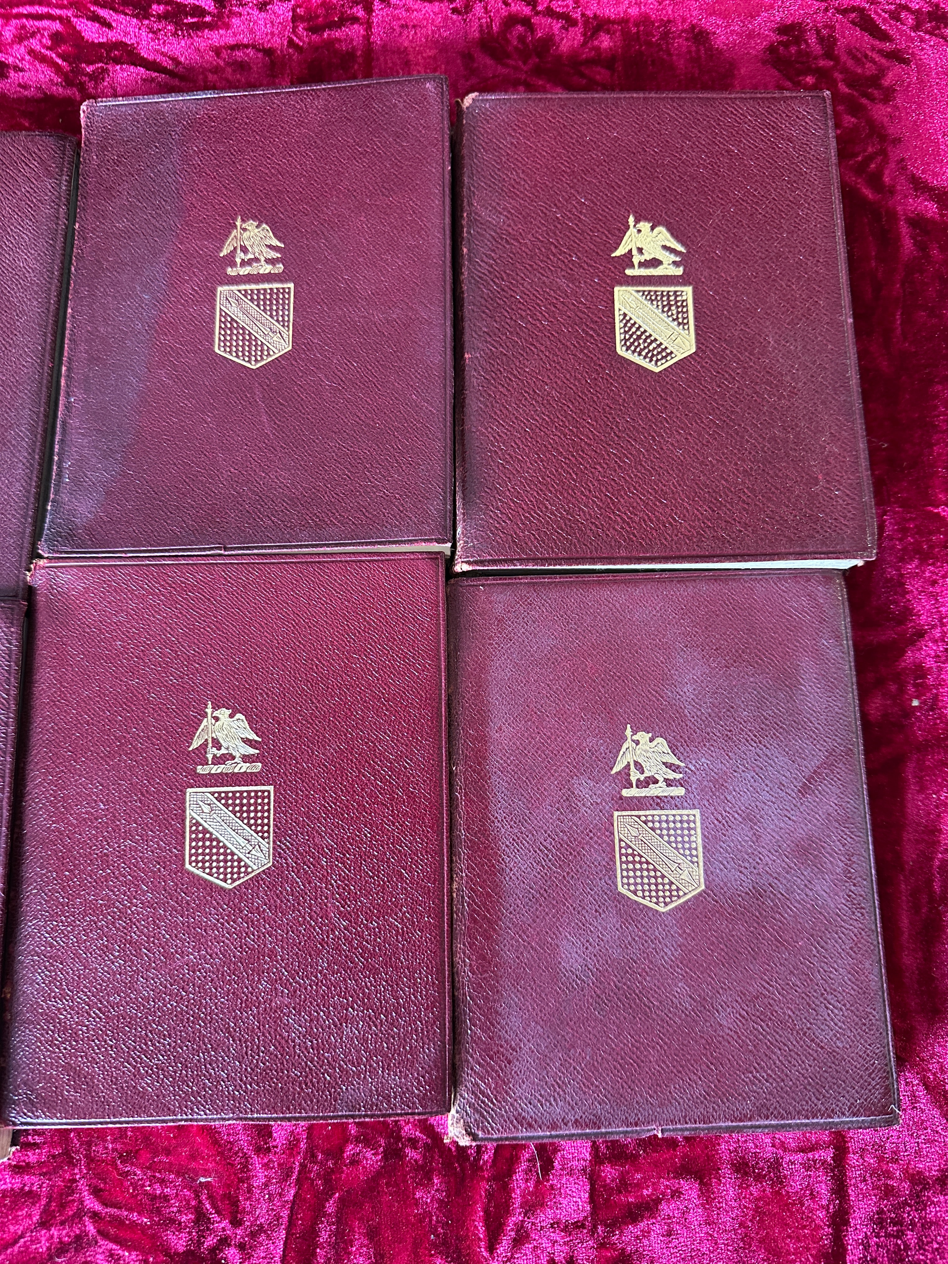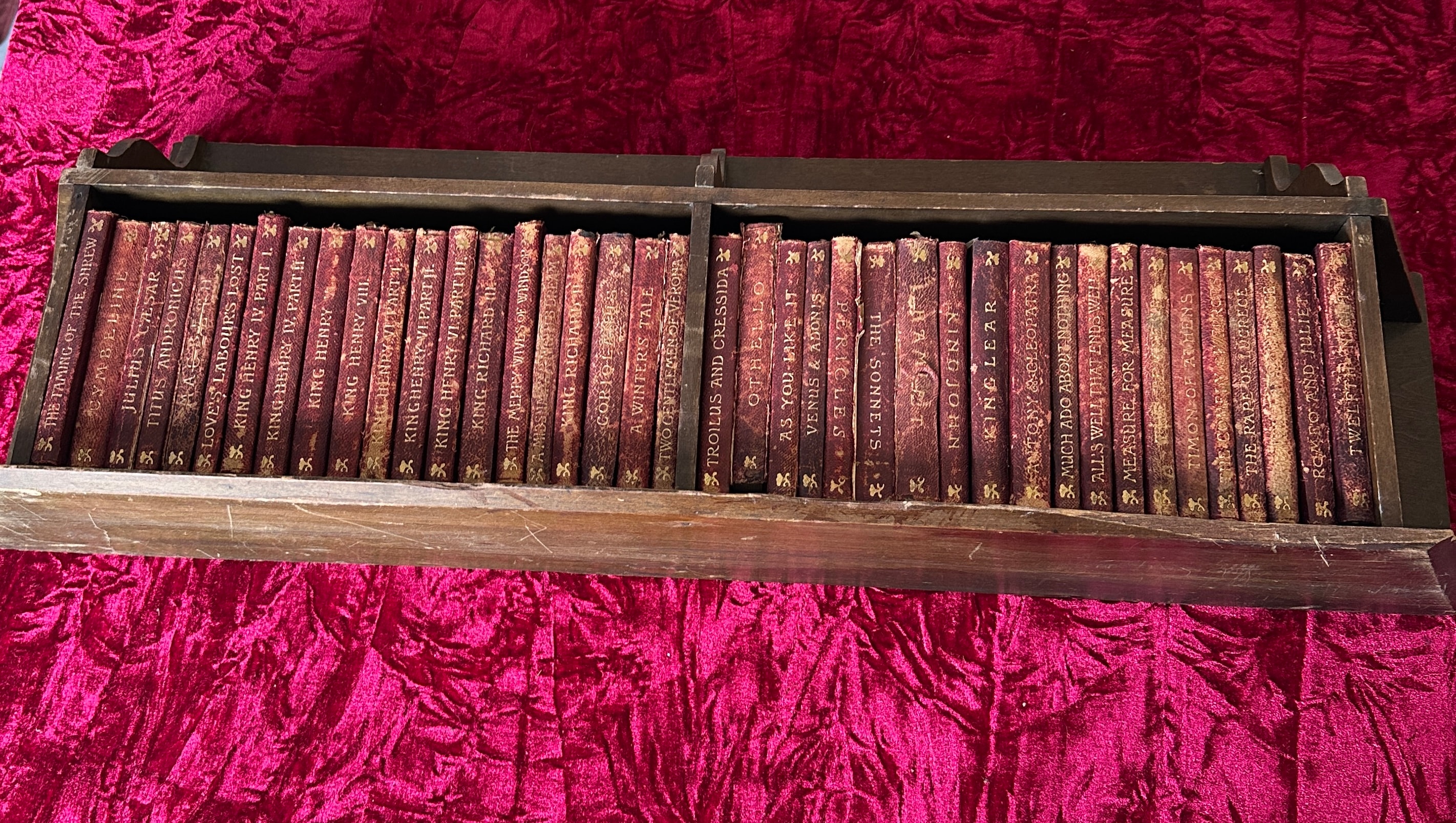A complete set of miniature works by William Shakespeare, comprising 40 volumes, presented in a dark-stained wooden display rack. The individual volumes feature uniform dark red/maroon bindings with gilt-stamped titles and decorative motifs on the spines. Titles include ‘The Taming of the Shrew,’ ‘Julius Caesar,’ ‘Titus Andronicus,’ ‘Love’s Labour’s Lost,’ ‘King Henry IV. Part I. & II.,’ ‘King Henry V,’ ‘King Henry VIII,’ ‘King Lear,’ ‘Othello,’ ‘As You Like It,’ ‘Venus & Adonis,’ ‘The Sonnets,’ ‘Much Ado About Nothing,’ ‘Measure for Measure,’ ‘Timon of Athens,’ ‘Romeo and Juliet,’ ‘Twelfth Night,’ ‘Winter’s Tale,’ ‘Troilus and Cressida,’ ‘Coriolanus,’ ‘Richard III,’ and ‘Macbeth.’ A consistent gilt emblem, depicting a winged creature atop a shield, adorns the front cover of each book. Interior pages show a standard two-column text format.