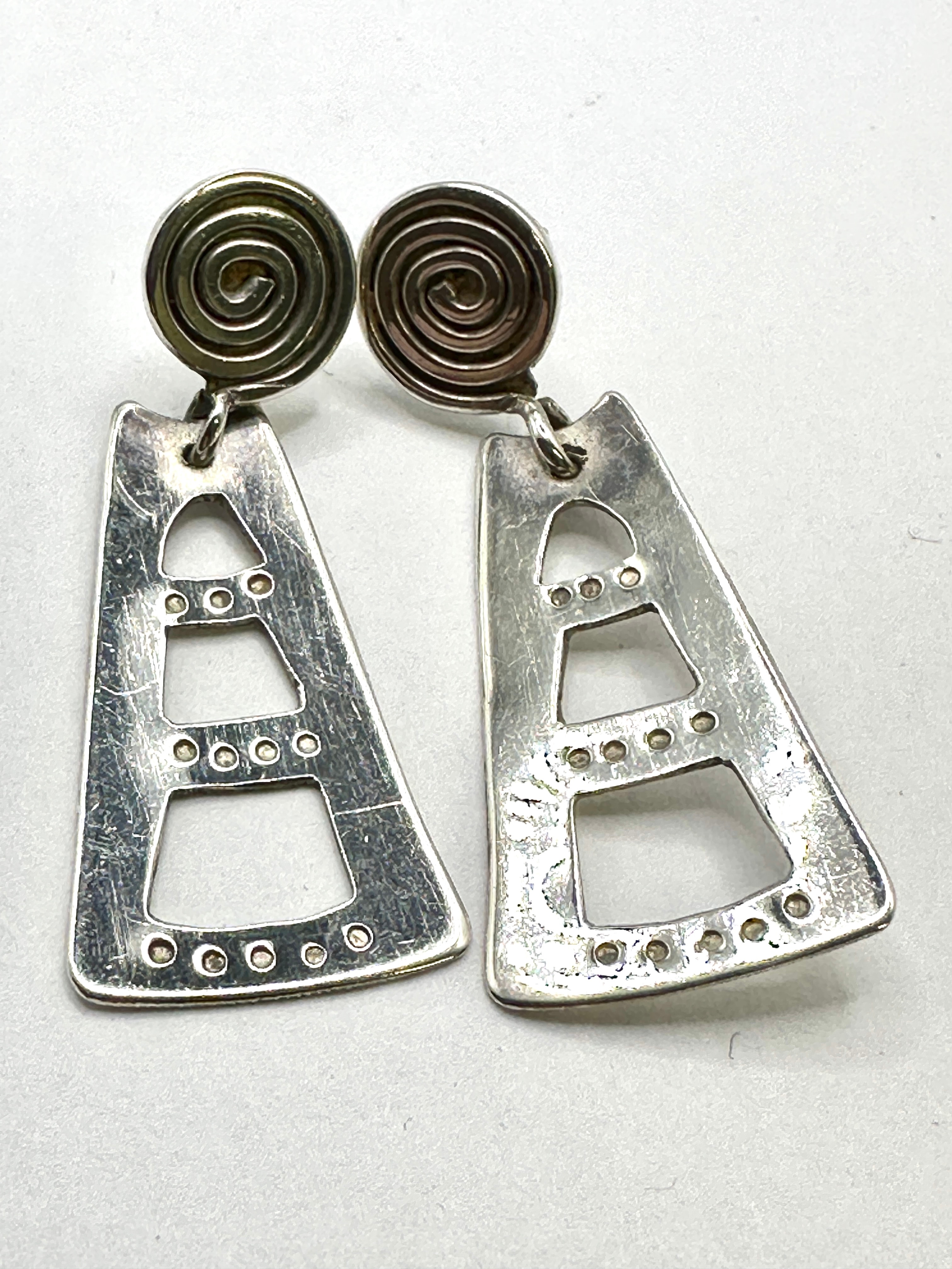 A pair of British 925 silver modernist dangle earrings. Each earring comprises a domed circular stud with an incised spiral motif, suspending a flat, trapezoidal-shaped drop. The drops feature three graduated open geometric cutouts, each surmounted by a row of small circular indentations, imparting a distinct modernist or abstract style. Visible hallmarks on the reverse include ‘925’ (indicating Sterling Silver), a lion passant, an anchor symbol, a capital ‘C’ within a cartouche, and an additional indistinct mark, collectively indicating British sterling silver, likely Birmingham origin. The design evokes a style often associated with Hopi or Native American modernist jewelry. The item’s materials are confirmed to be: 925 silver.