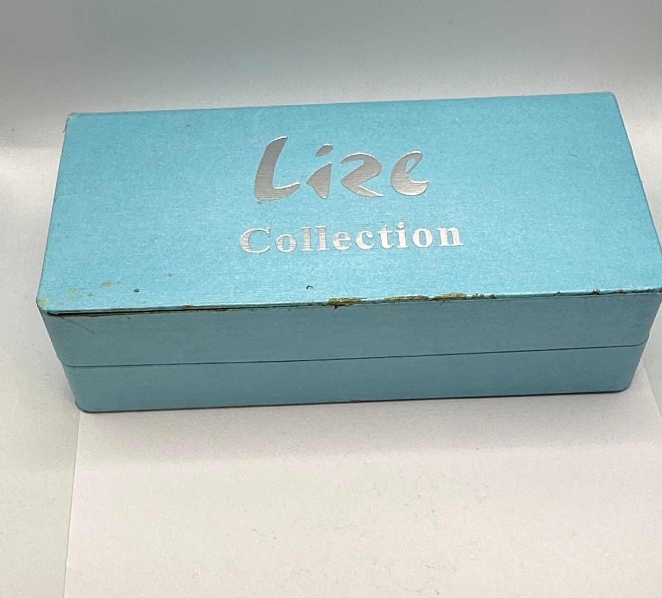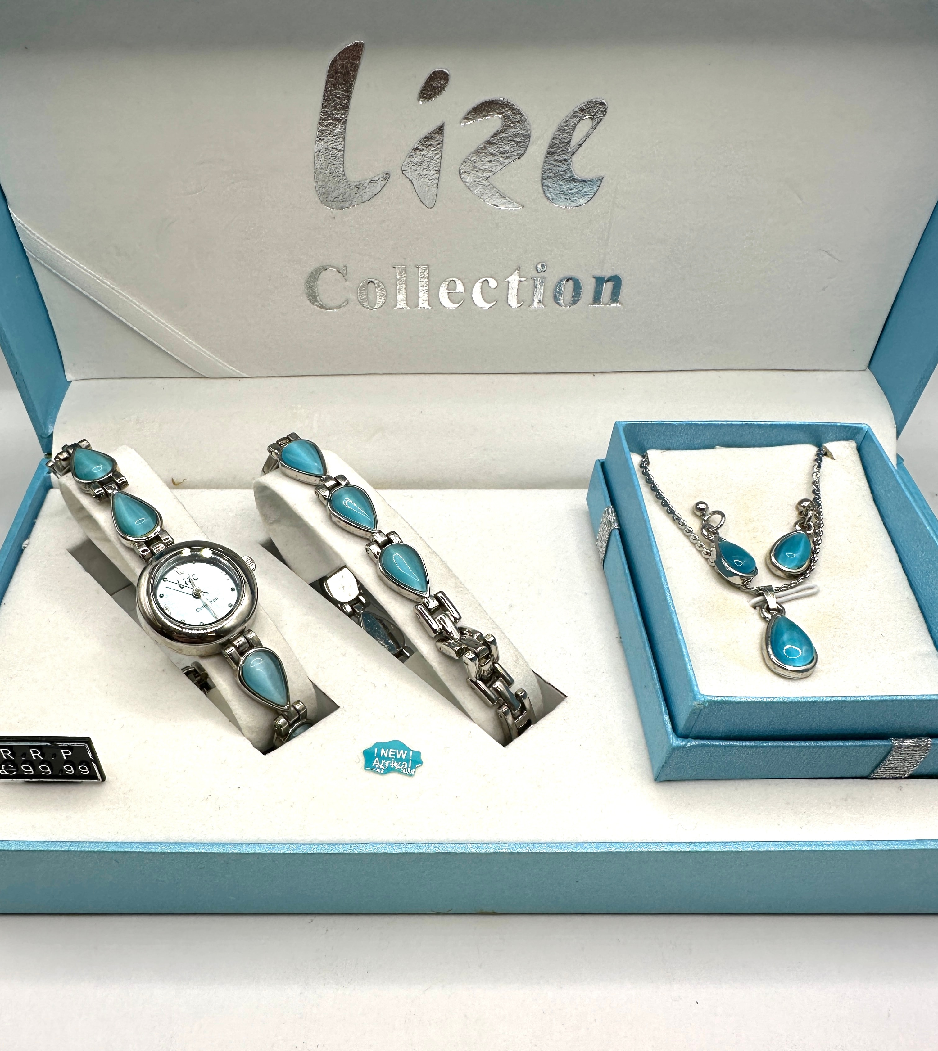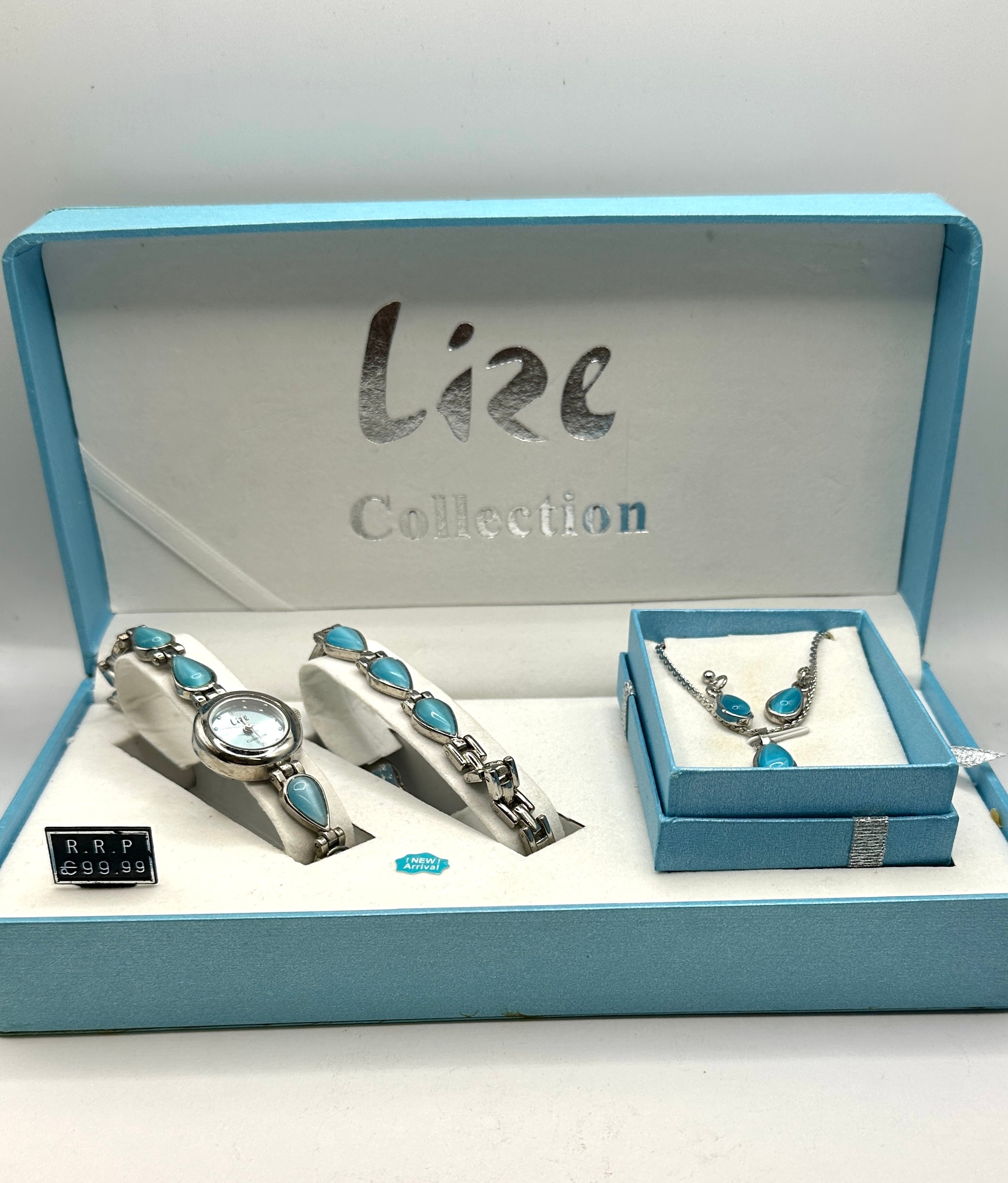 A contemporary four-piece jewelry set by Lize Collection, presented in its original aqua blue hinged box marked “Lize Collection” in silver script. The set comprises a ladies’ wristwatch with a white dial, a matching bracelet, a necklace, and a pair of stud earrings. All pieces feature 925 silver settings with multiple teardrop-shaped cabochons in a vibrant turquoise hue, likely a simulated material. Visible labels indicate “R.R.P. £99.99” and “New Arrival”.