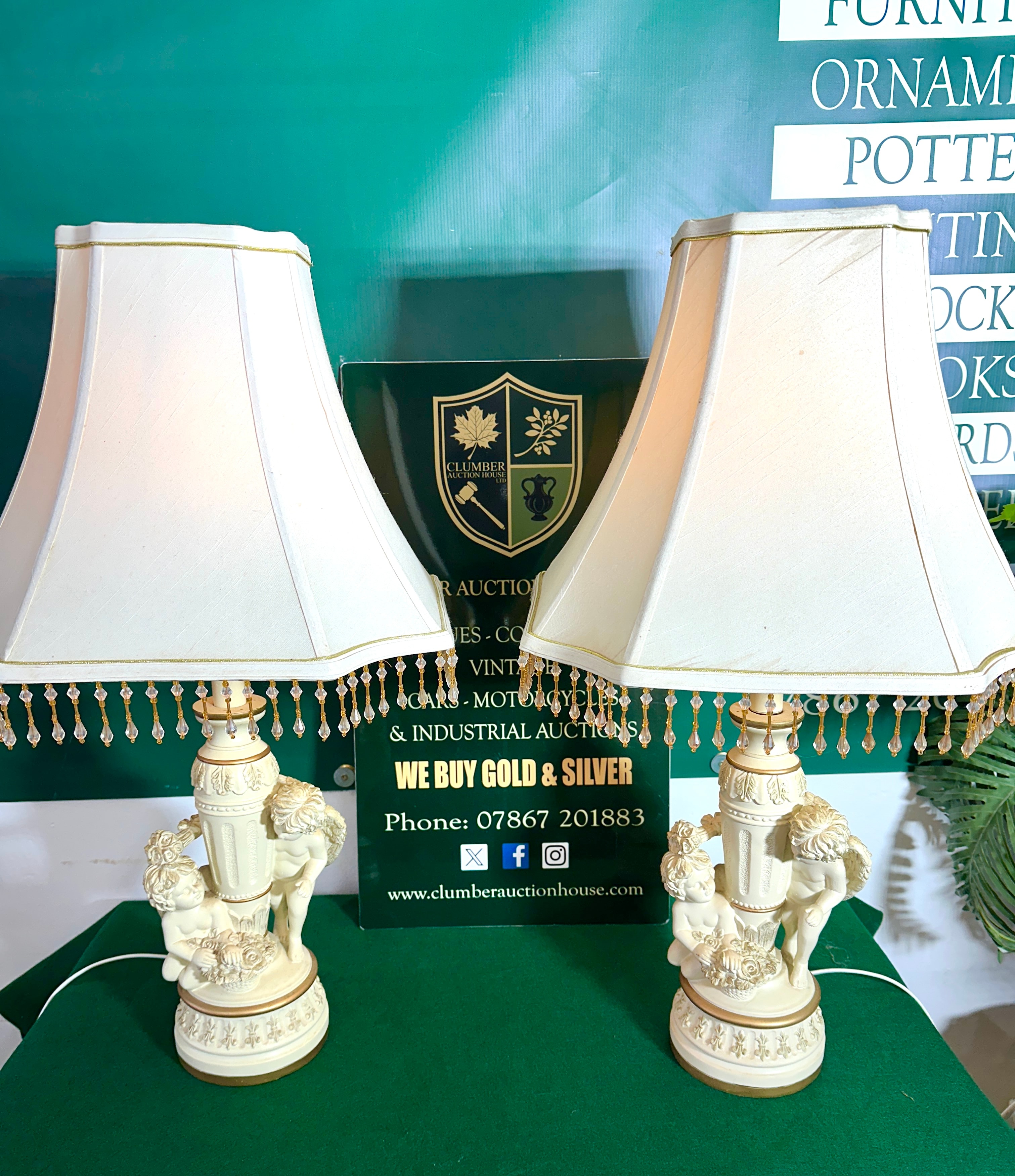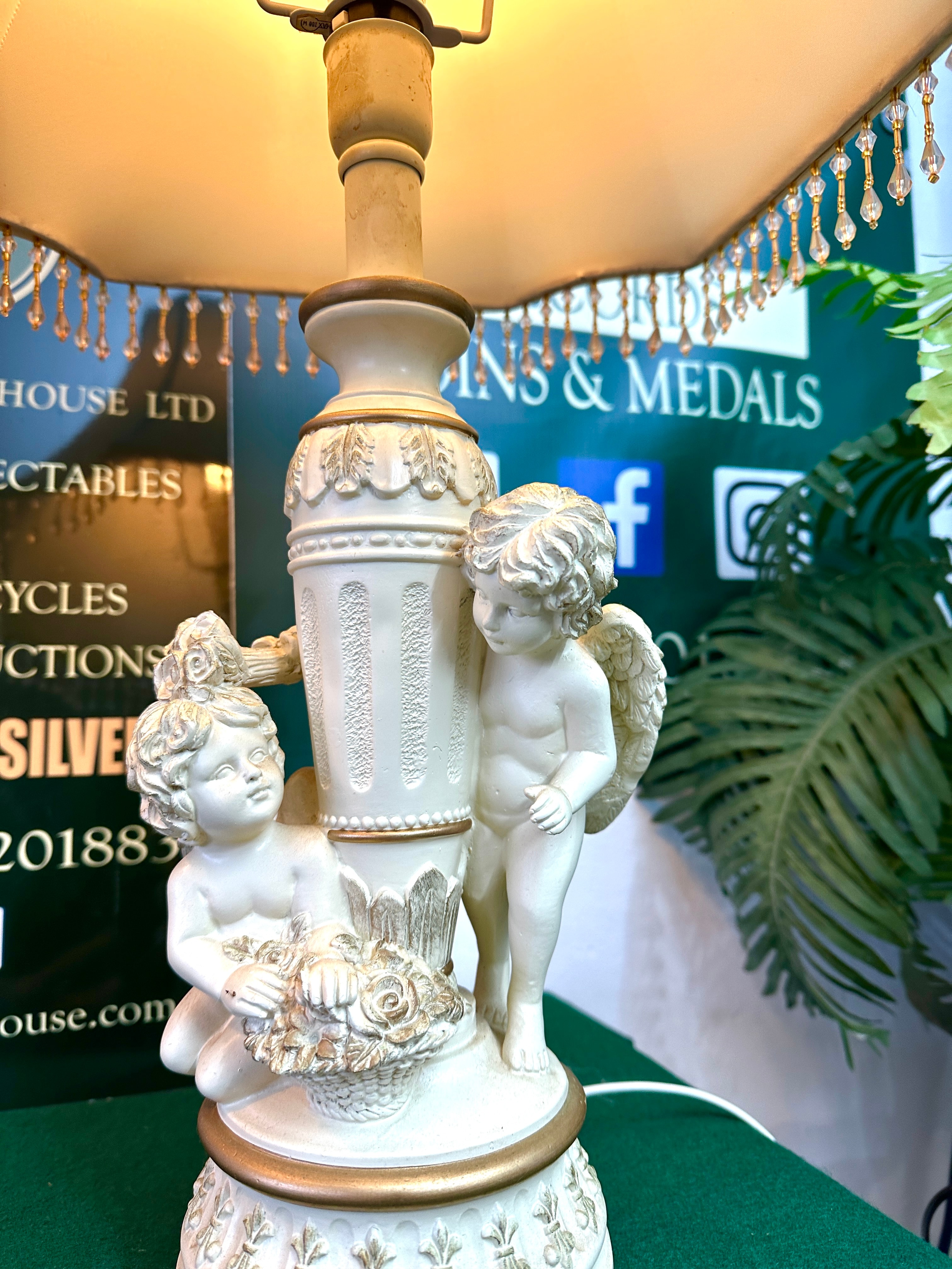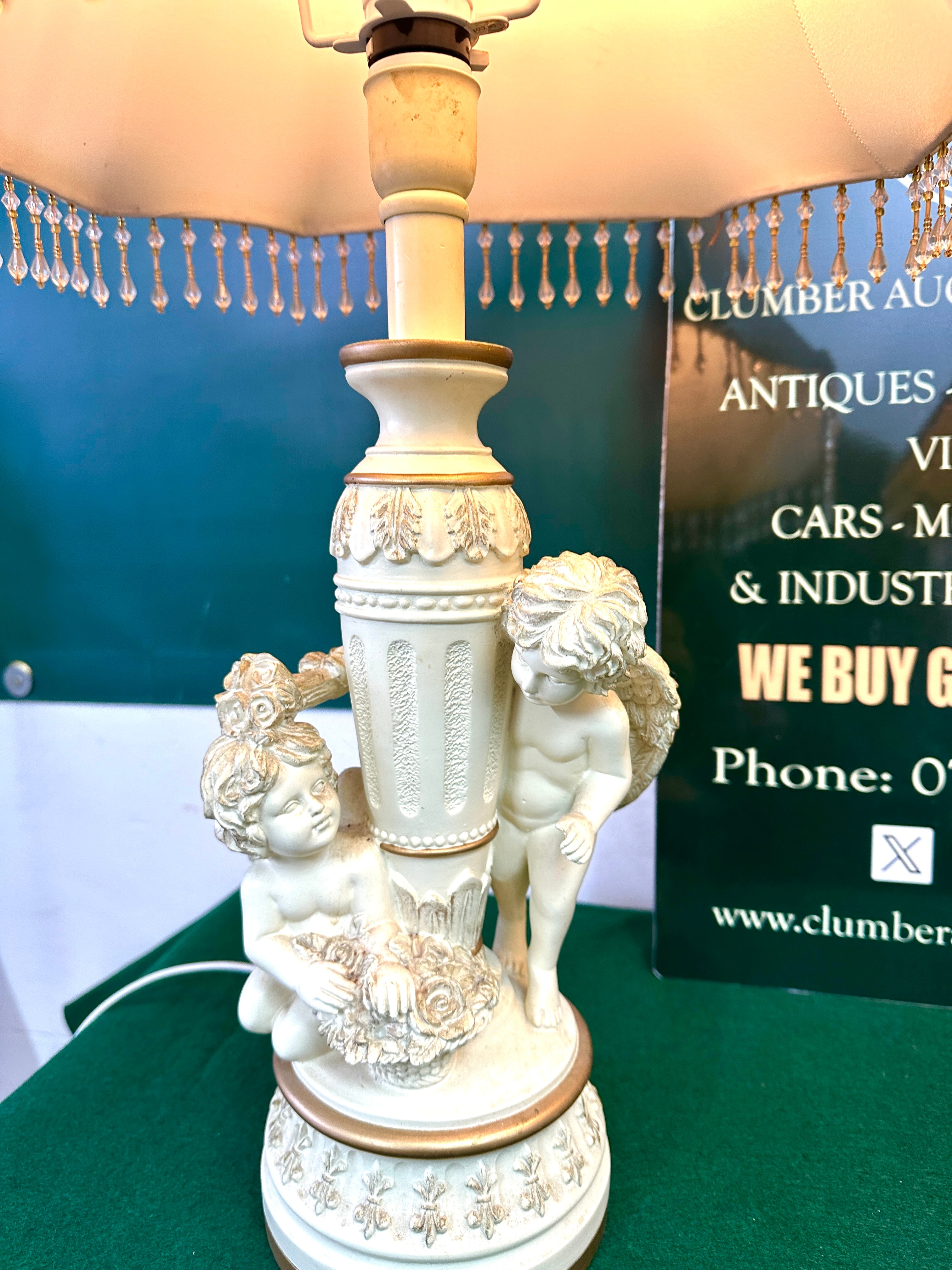 A pair of Neoclassical or Rococo Revival style table lamps. Each lamp base is constructed from an off-white molded material, possibly ceramic or resin, featuring gilded accents. The bases are adorned with three cherubic figures (putti) encircling a central fluted column. Both lamps are surmounted by bell-shaped fabric shades, likely silk or a synthetic blend, in a matching off-white color. The shades are edged with gilded trim and an elaborate beaded fringe containing clear and amber-toned beads.