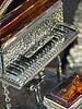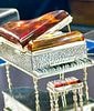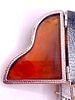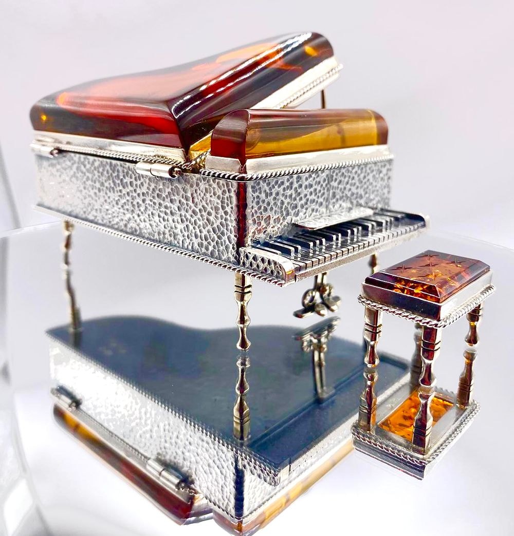 A miniature decorative grand piano and a matching rectangular piano stool, both constructed from 925 silver. The main bodies feature a hammered textured finish, accented with a twisted rope border. The piano stands on four ornate turned legs, while the stool has four simpler turned legs. The piano lid, which is hinged and open, and the music stand, along with the entire stool top, are inlaid with polished, translucent amber, displaying a range of honey-yellow to reddish-brown tones with natural inclusions. The piano includes a visible keyboard with contrasting black and white keys. Indistinct hallmarks, including a clear “925”, are visible on the underside of the stool top.