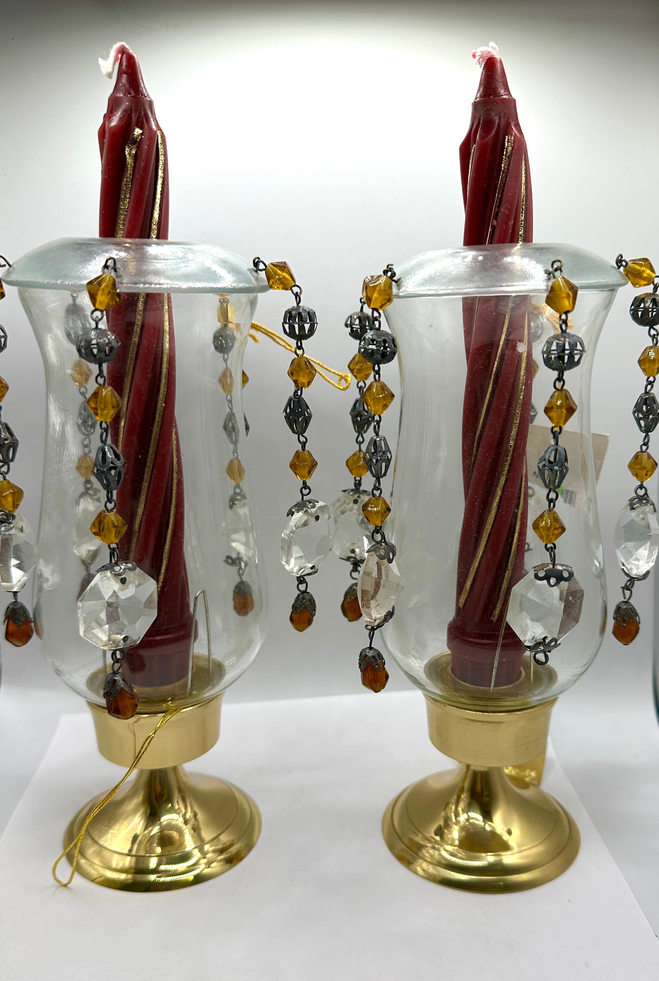 A pair of contemporary decorative hurricane candle holders, each featuring a polished brass-toned metal pedestal base supporting a tall, clear glass shade. Inside each shade is an unused red tapered candle with a twisted or fluted design and gold-colored accents. Both glass shades are embellished with removable beaded garlands that drape from the rim, comprising alternating clear faceted drops, amber-colored faceted beads, and dark gray or black openwork metal spherical beads.