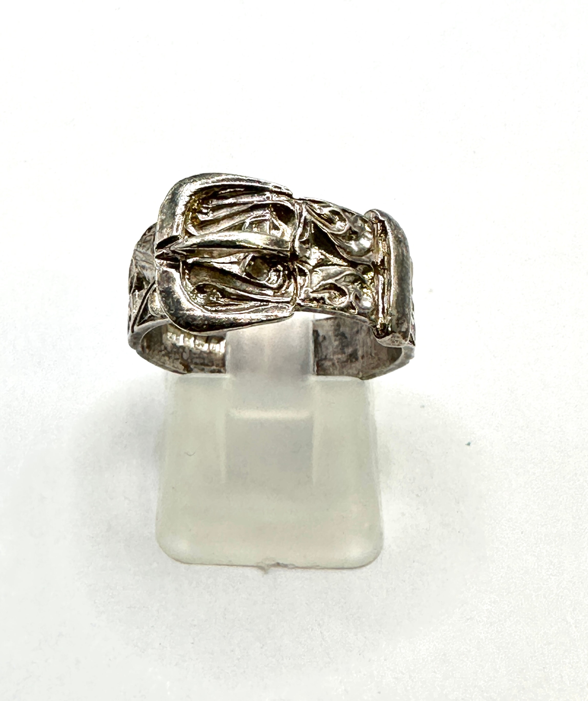 A Victorian 925 silver buckle-style finger ring, featuring a prominent buckle motif on the bezel flanked by intricate scrollwork or foliate designs extending down the shoulders of the band.