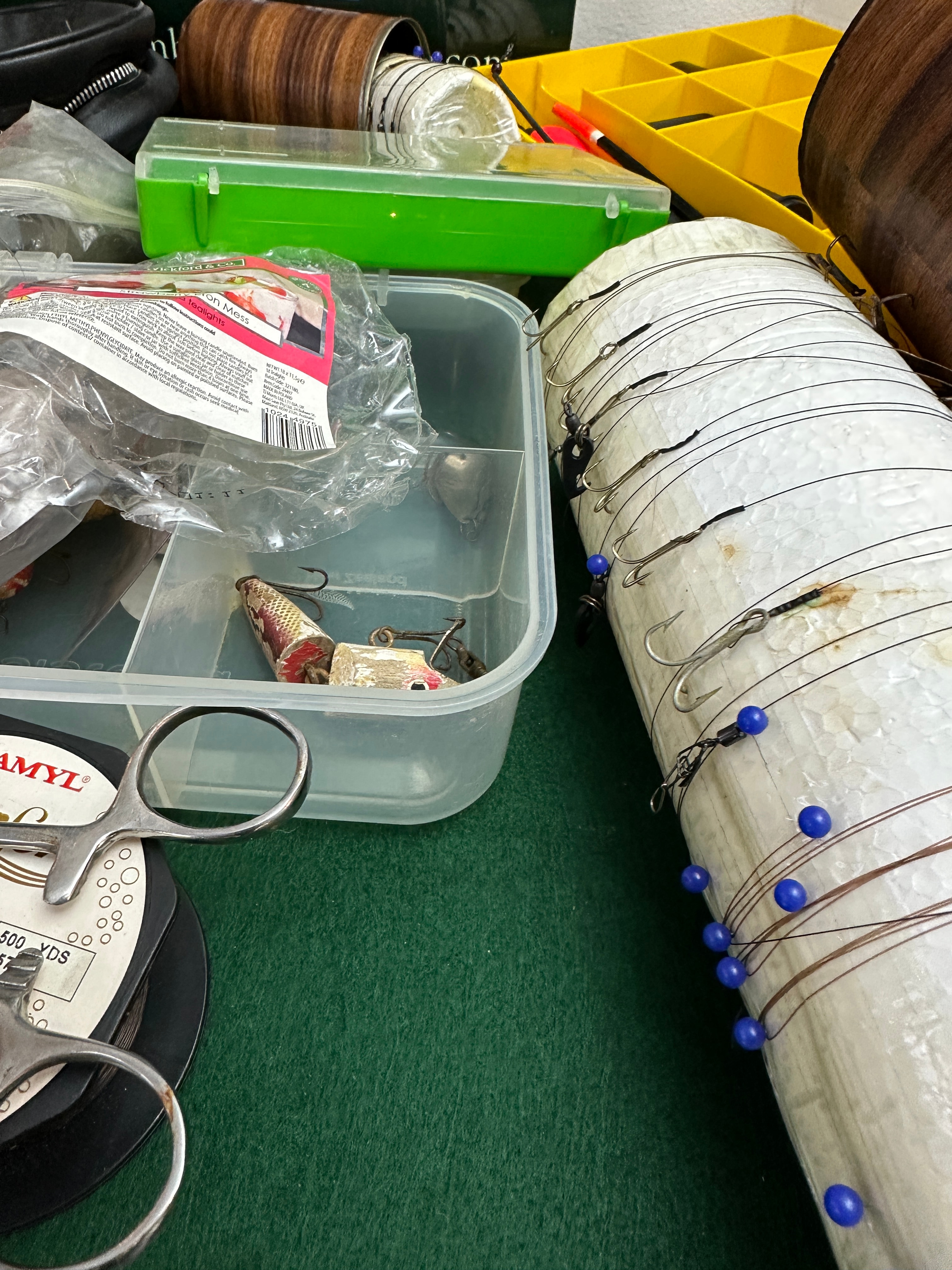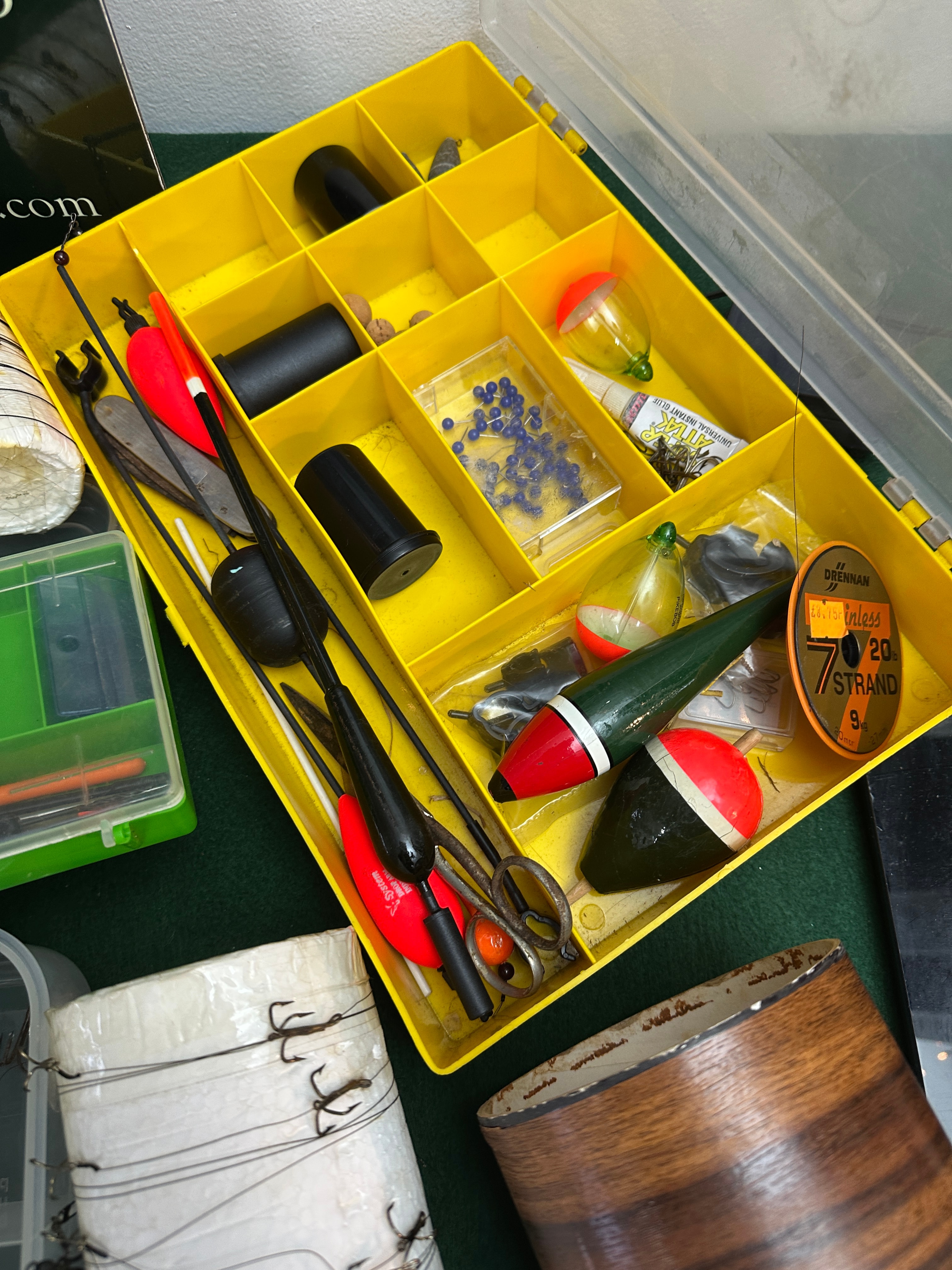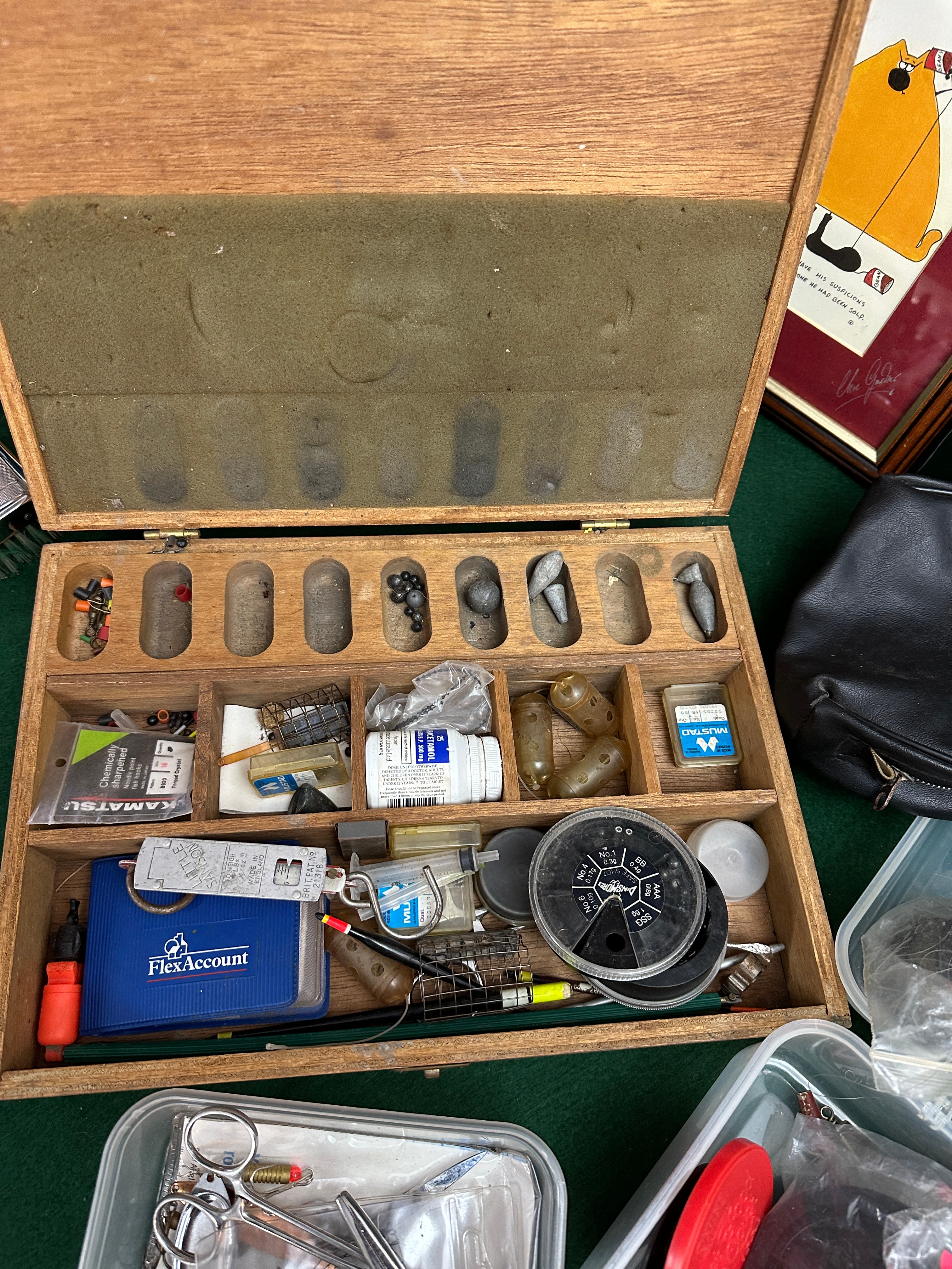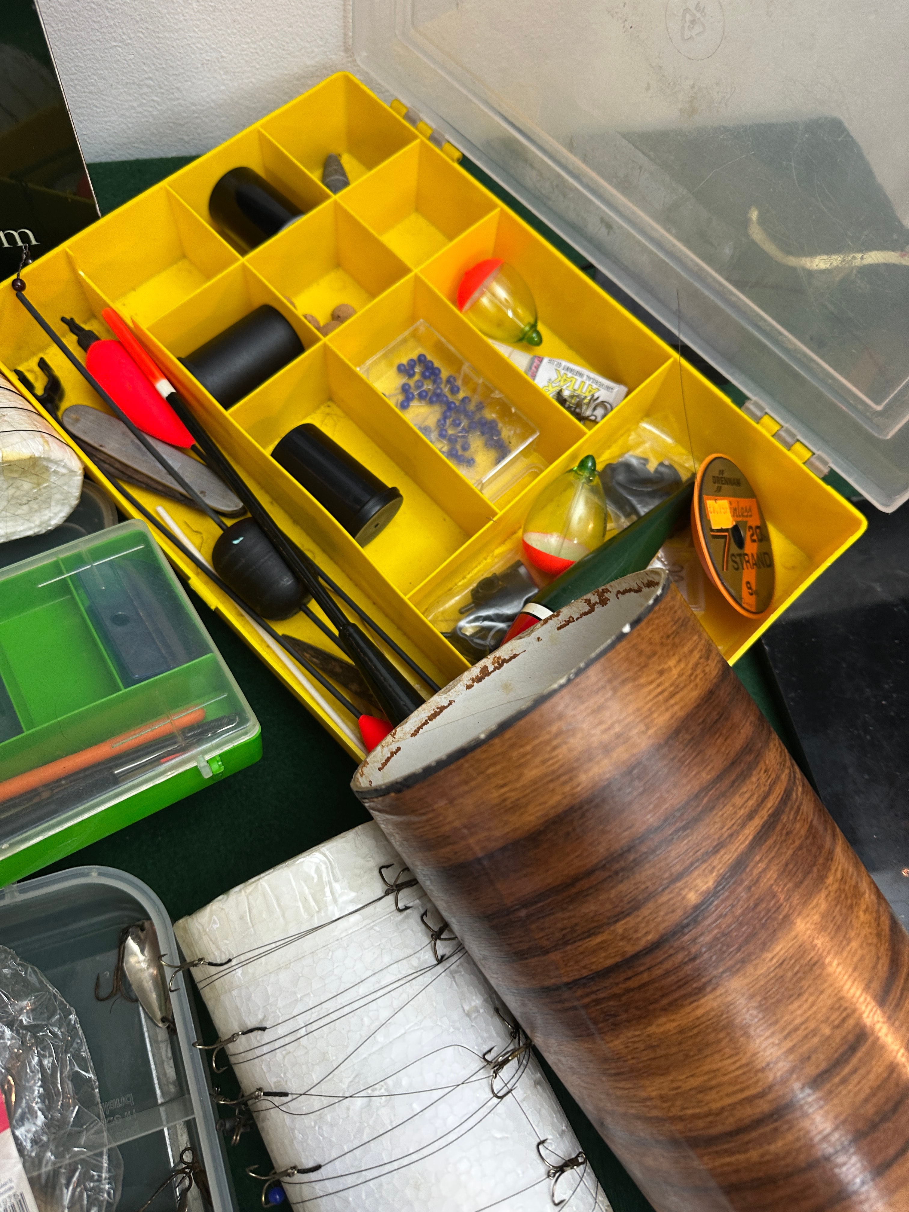 The collection comprises a multi-compartment wooden tackle box, filled with various fishing essentials including lead weights, an assortment of lures, numerous hooks, spools of fishing line from brands such as DRENNAN, KAMATSU, MUSTAD, TRILENE, and AMYL, fishing floats, and small tools including scissors and pliers. An accessory marked “FlexAccount” is also present. Complementing the wooden box are several clear plastic storage containers and a yellow plastic compartmented tackle box, all containing additional lures, hooks, fishing line, floats, and small tackle components such as blue beads. Also included are two cylindrical line holders, one with a wood-grain finish, storing pre-tied fishing leaders, and a black synthetic pouch.